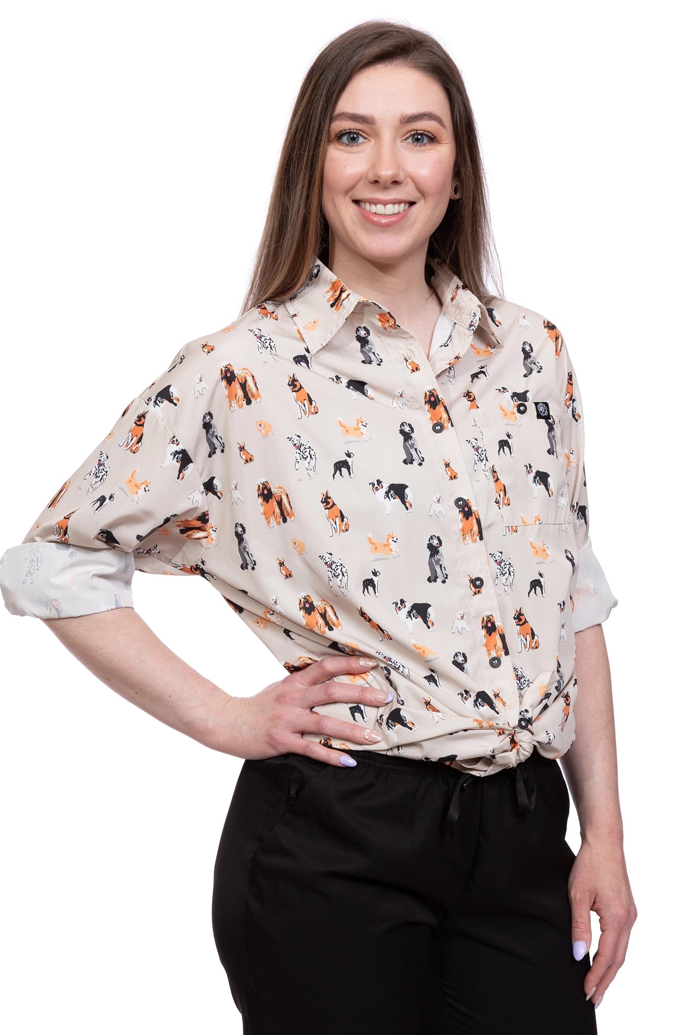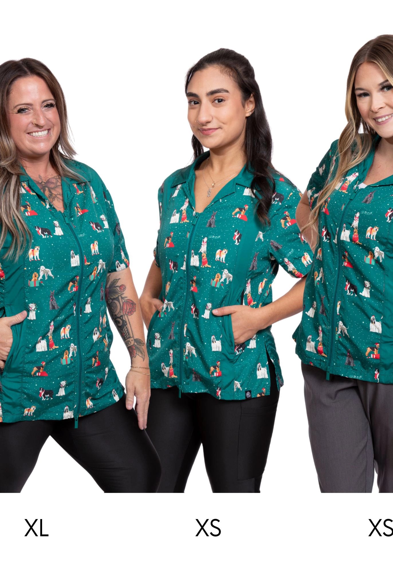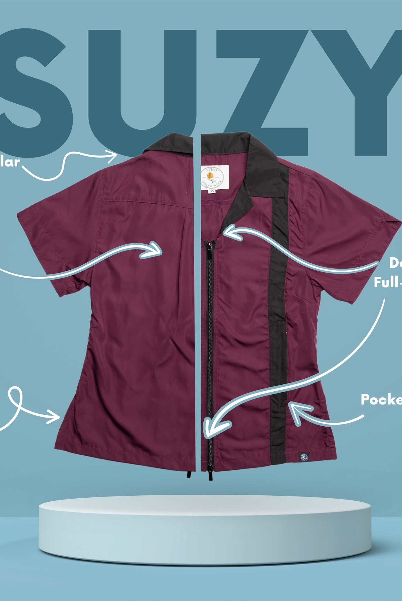 - Suzy and Charlotte: Fitted women's dog grooming smocks that are true to size. If you have a curvier figure, consider sizing up.