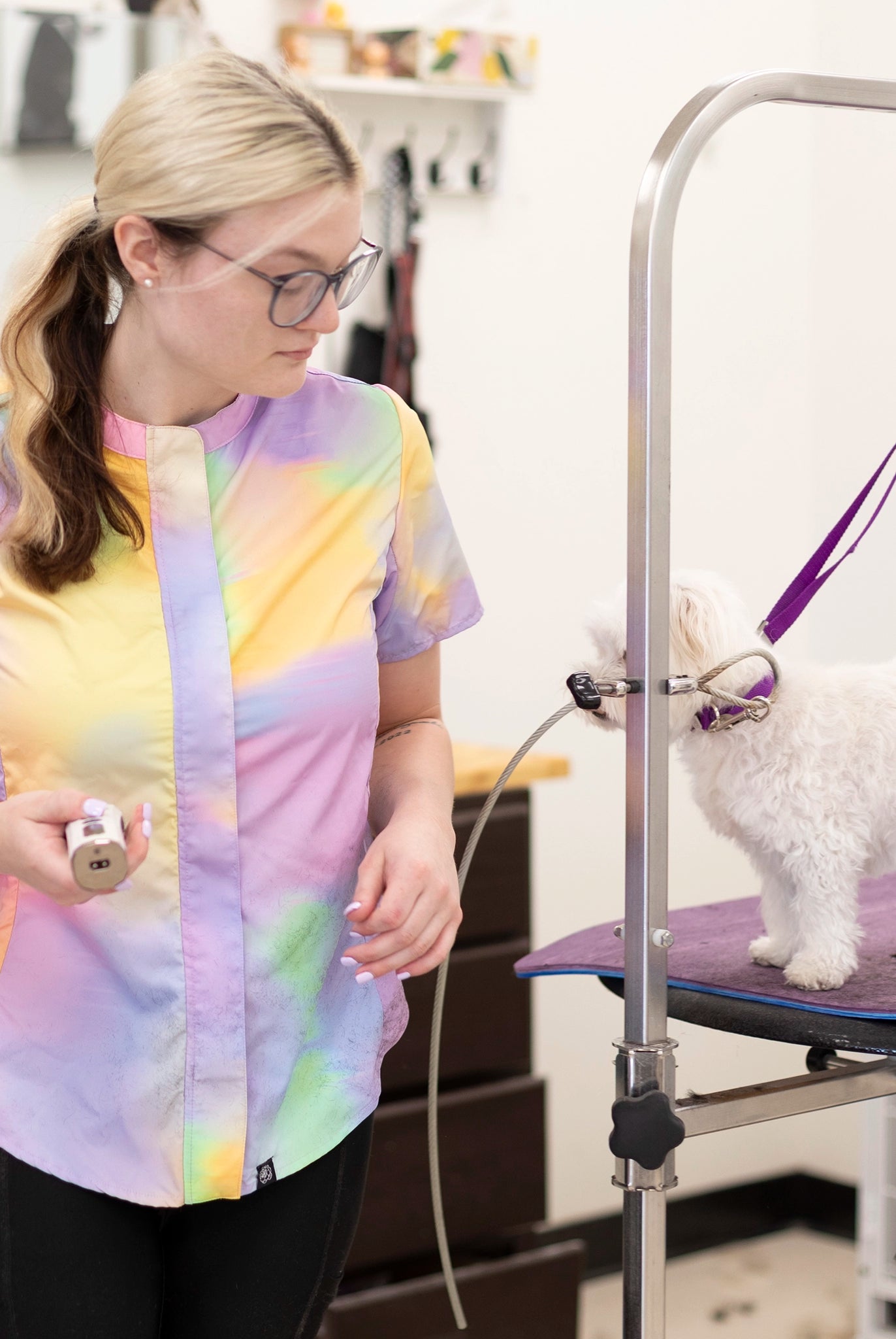 At Retro Stylist Wear, we pride ourselves on our extensive research into fabrics that are functional and practical for the daily work of pet groomers. Before we release any style, our pet groomer apparel undergoes rigorous testing in our salons to ensure it meets our high standards.