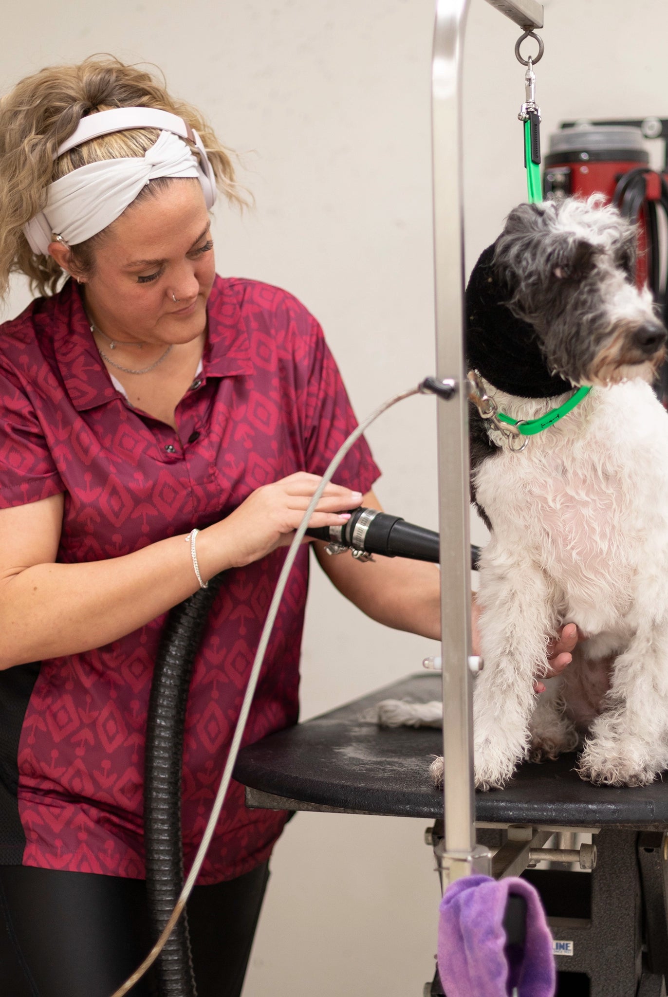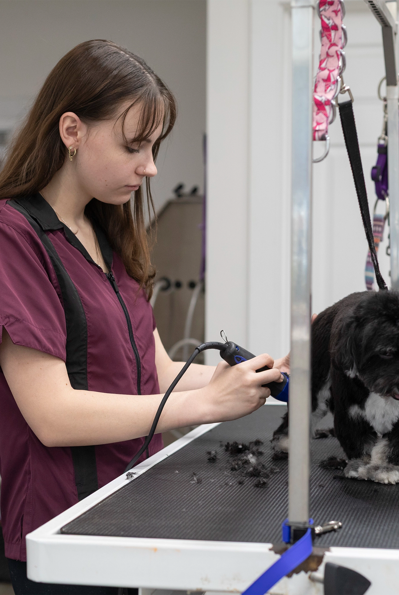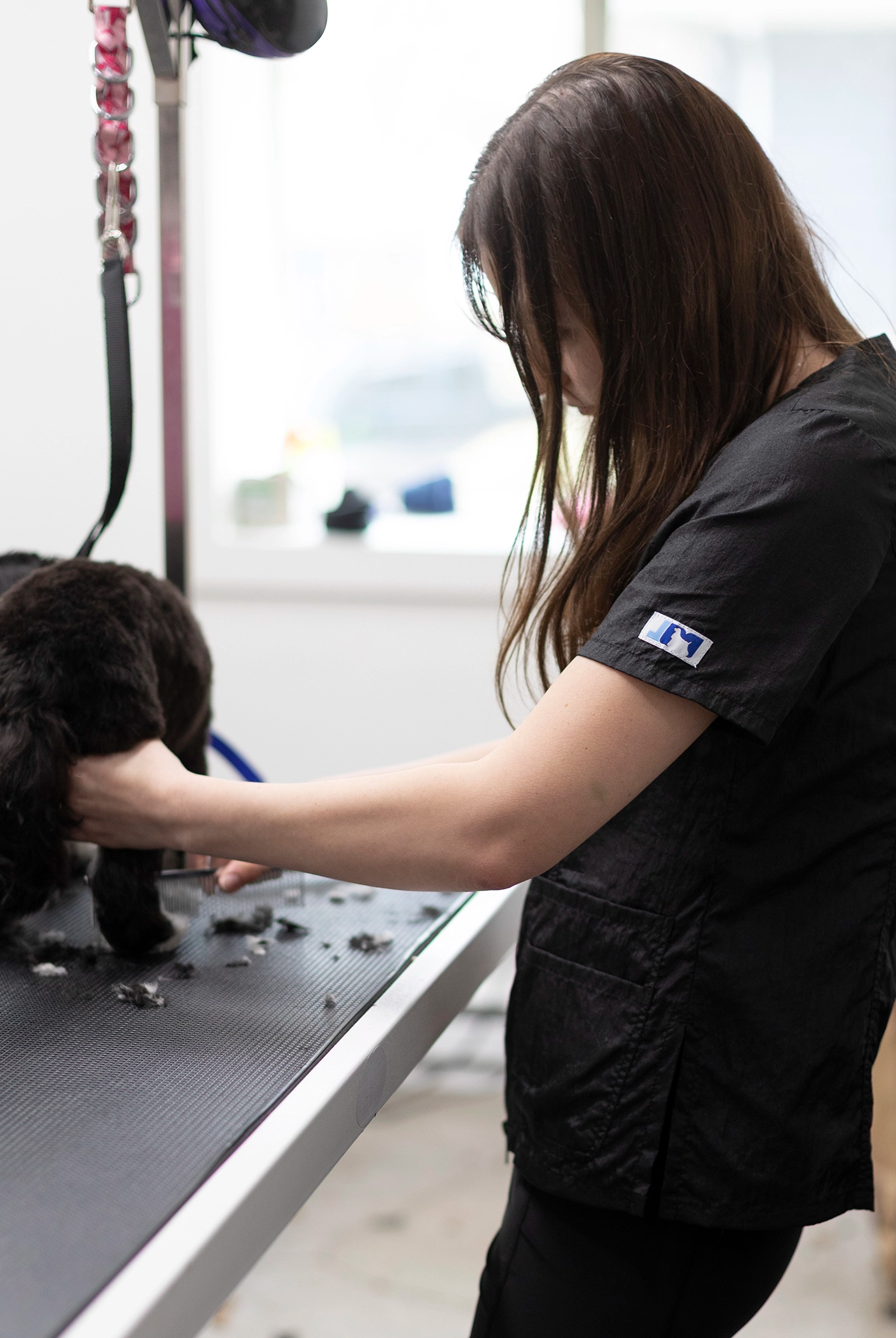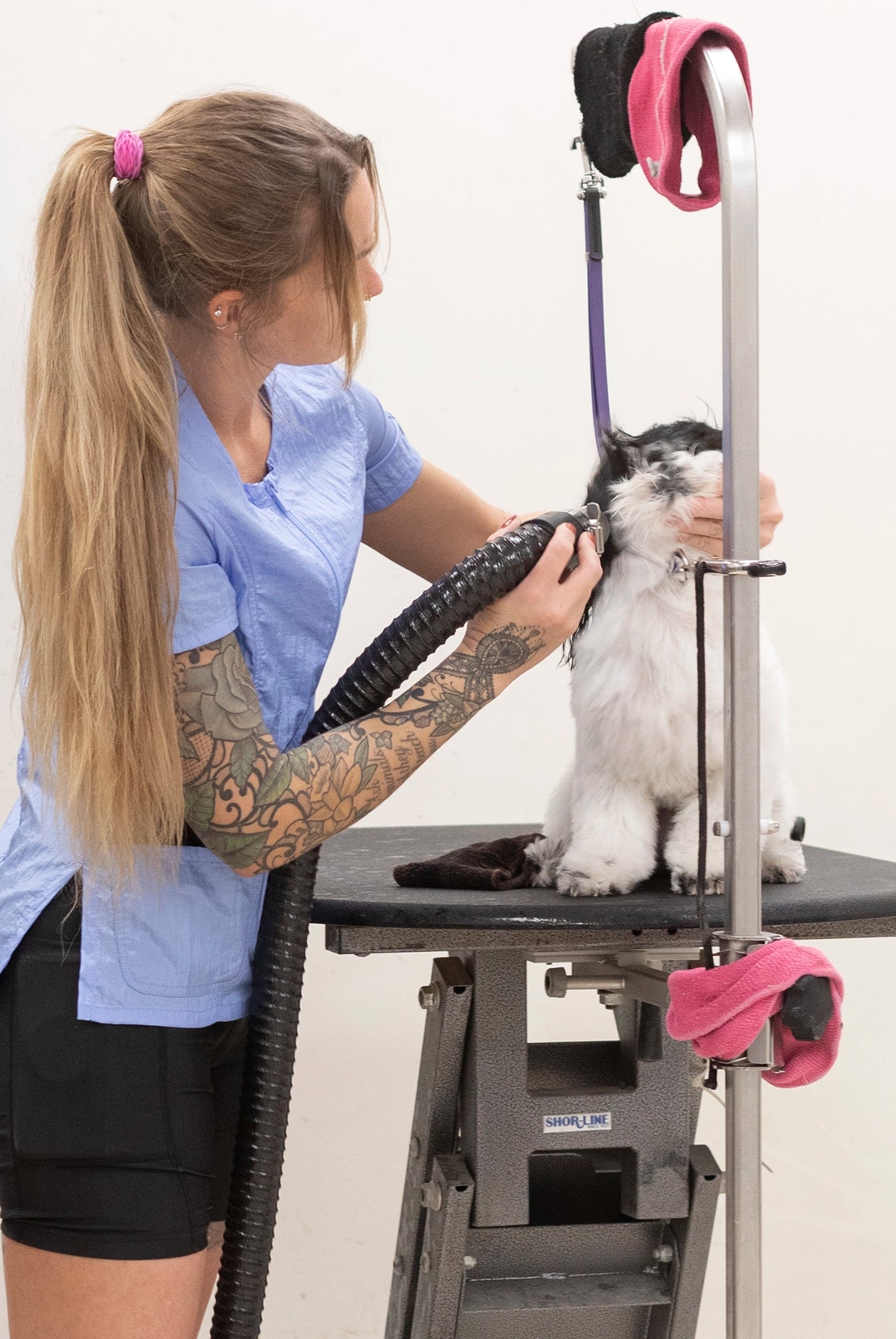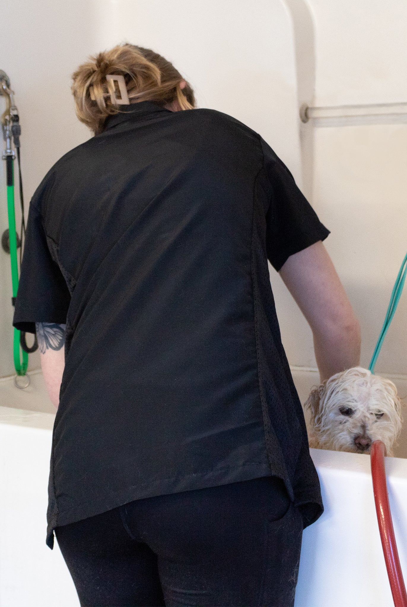 Most of our grooming apparel is crafted from 100% polyester, known for its water-wicking and hair-repellent properties. This fabric is also light and cool, making it perfect for a busy grooming environment.