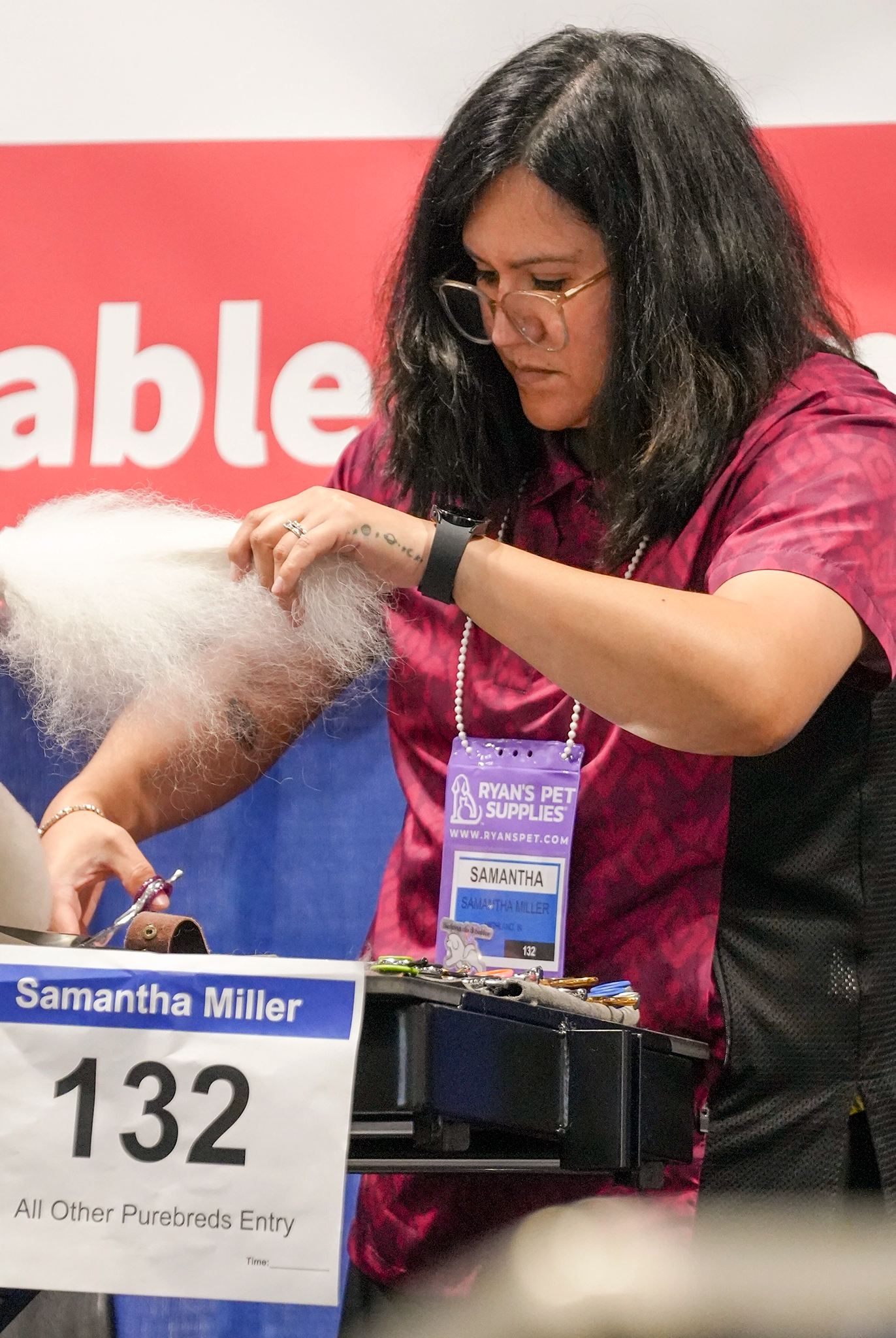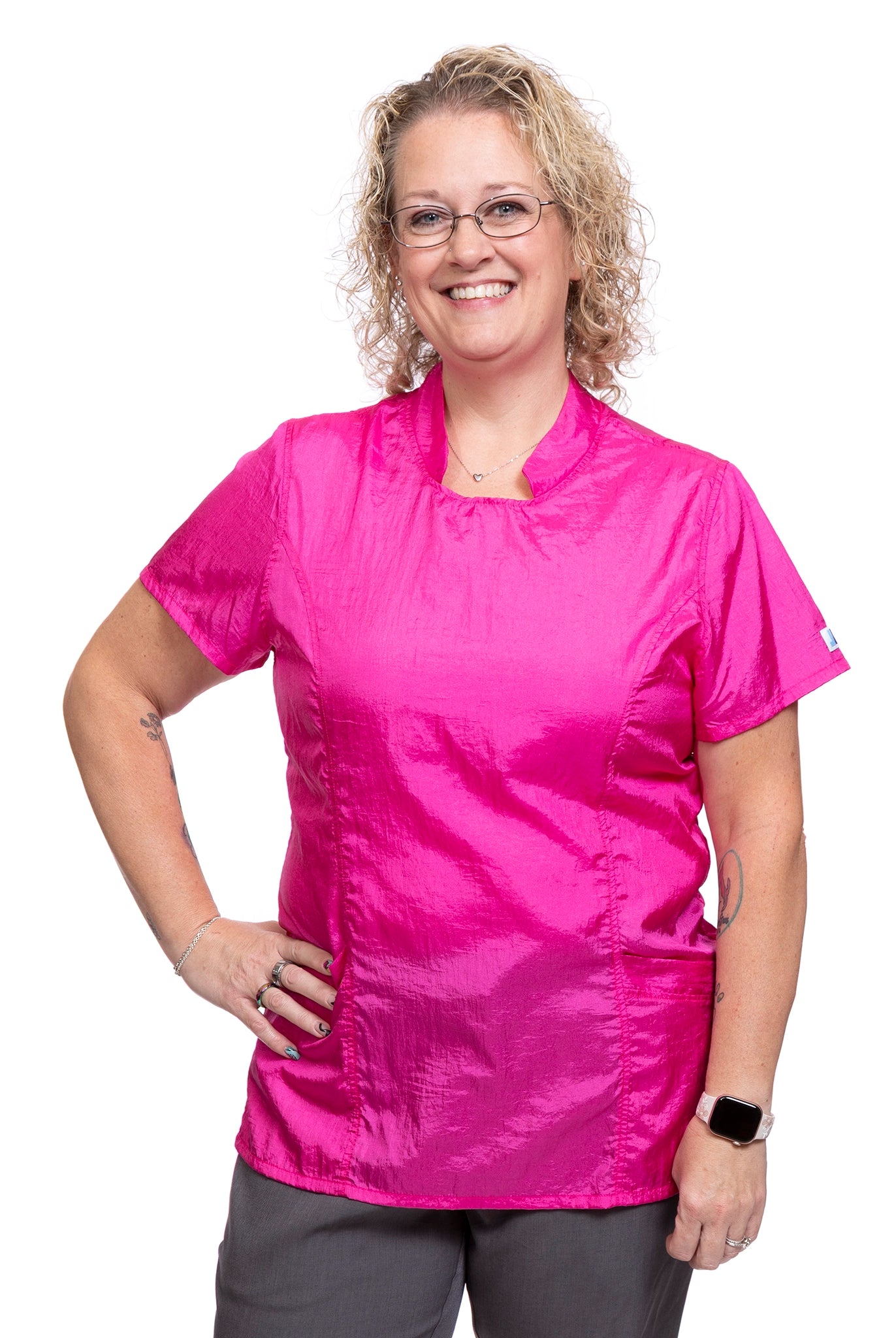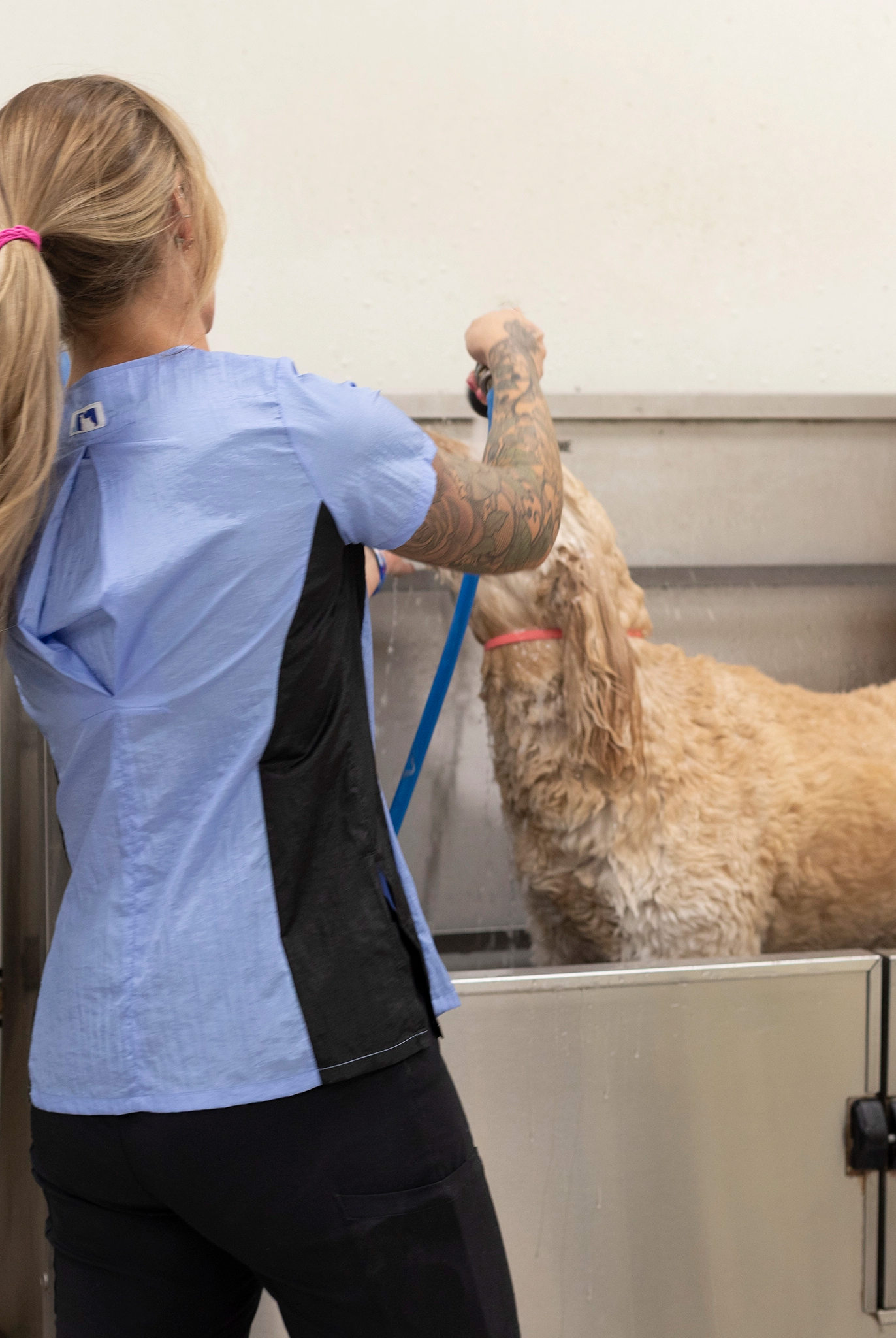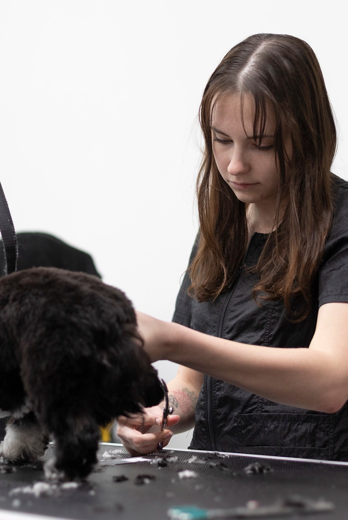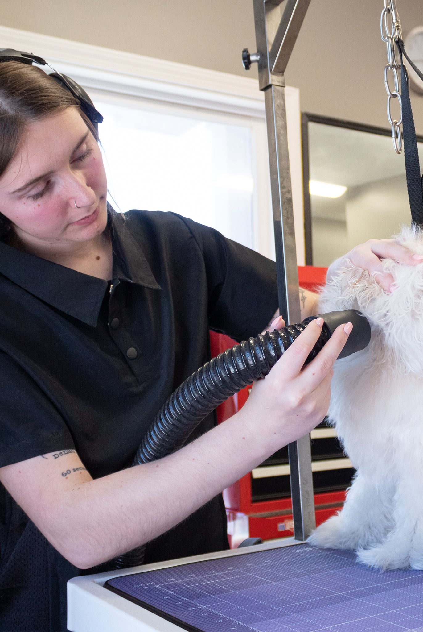 Most of our grooming apparel is crafted from 100% polyester, known for its water-wicking and hair-repellent properties. This fabric is also light and cool, making it perfect for a busy grooming environment.