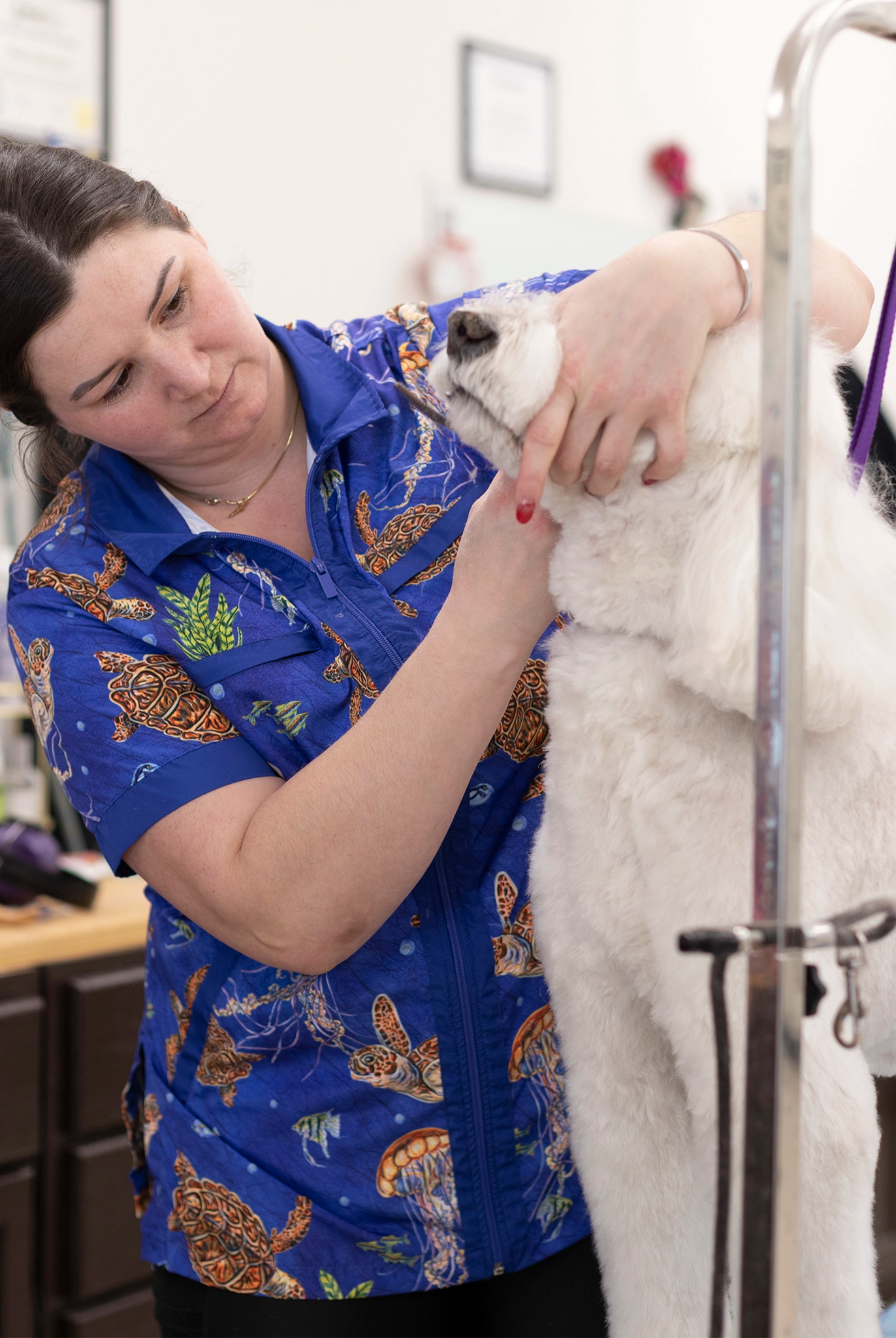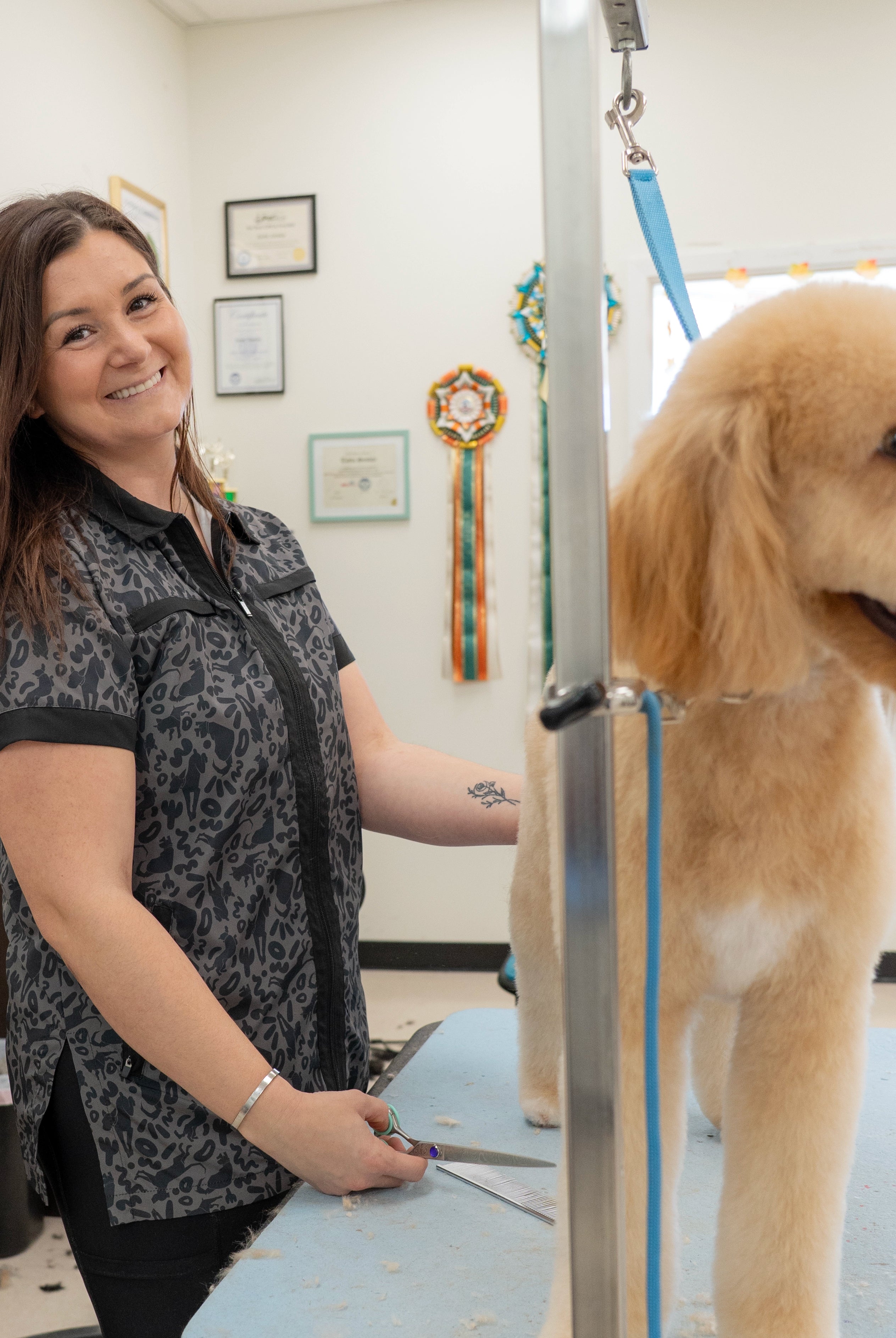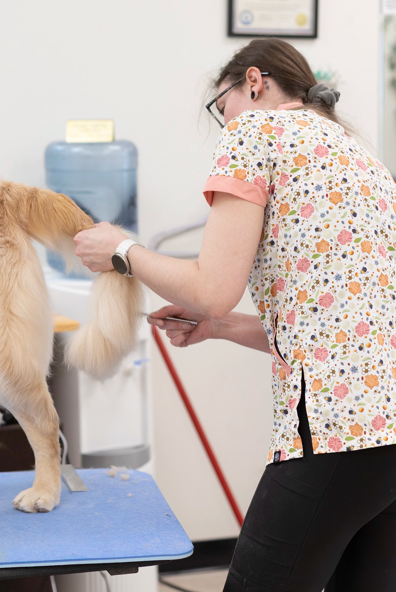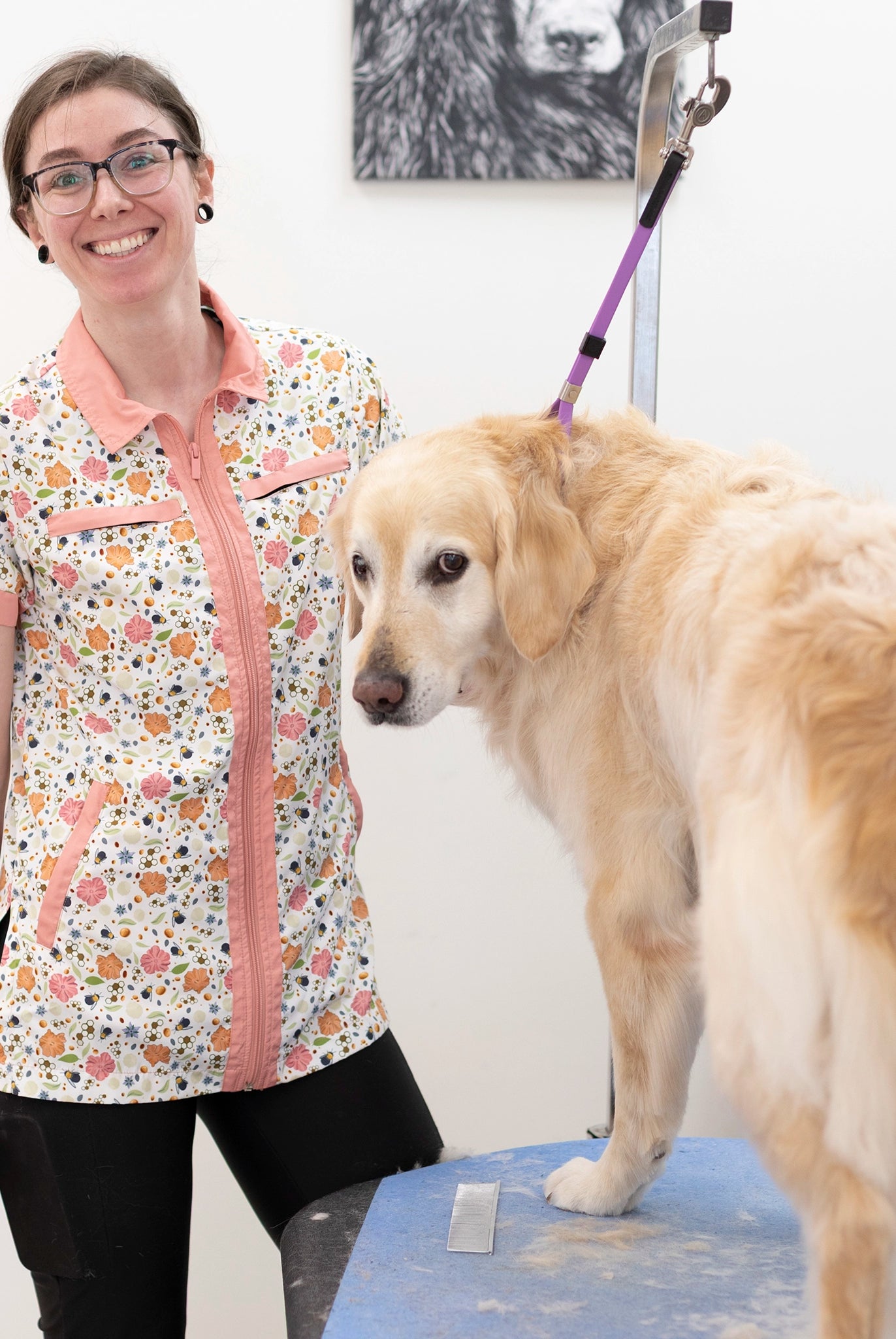 - Suzy and Charlotte: Fitted women's dog grooming smocks that are true to size. If you have a curvier figure, consider sizing up.