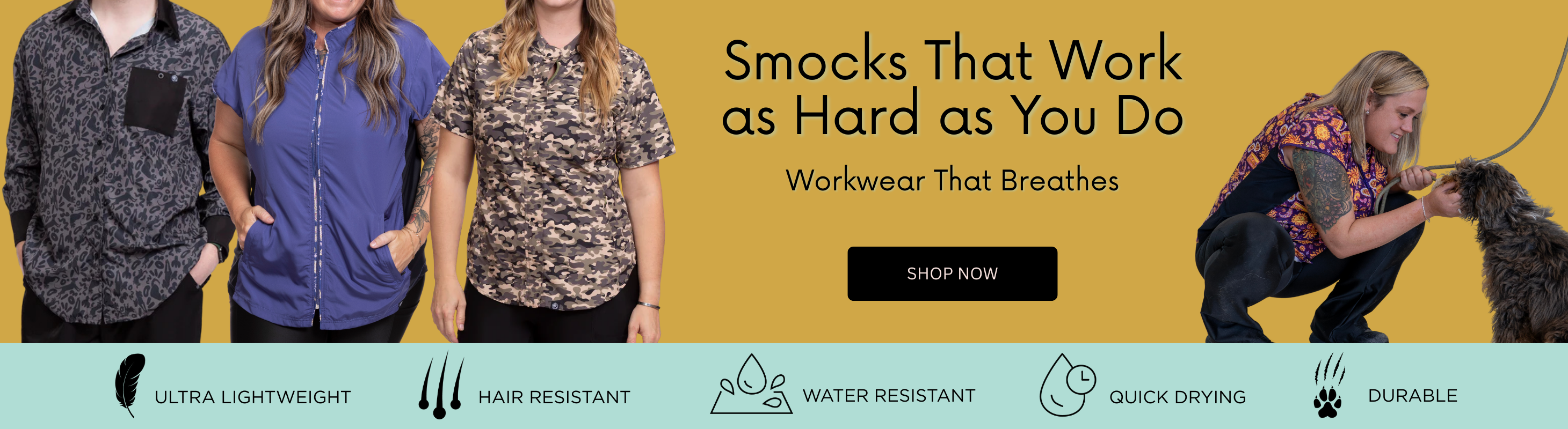 Yes, our smocks are both water-resistant and hair-resistant. They are made from high-quality 100% polyester, which effectively wicks away water and repels hair, keeping you dry and clean throughout your grooming tasks. Our athletic line, made from a blend of 82% polyester and 18% spandex, also ensures that hair and water fall right off, providing added durability and stretch for maximum comfort and functionality.