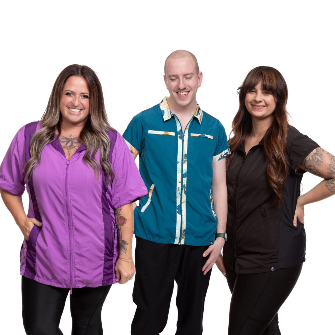 Pet groomers and hair stylists get wet! Protect your undergarments from getting soaked with our water-resistant smocks, pants & athletic apparel. Bathe away and worry not about those dog shakes. We got you!