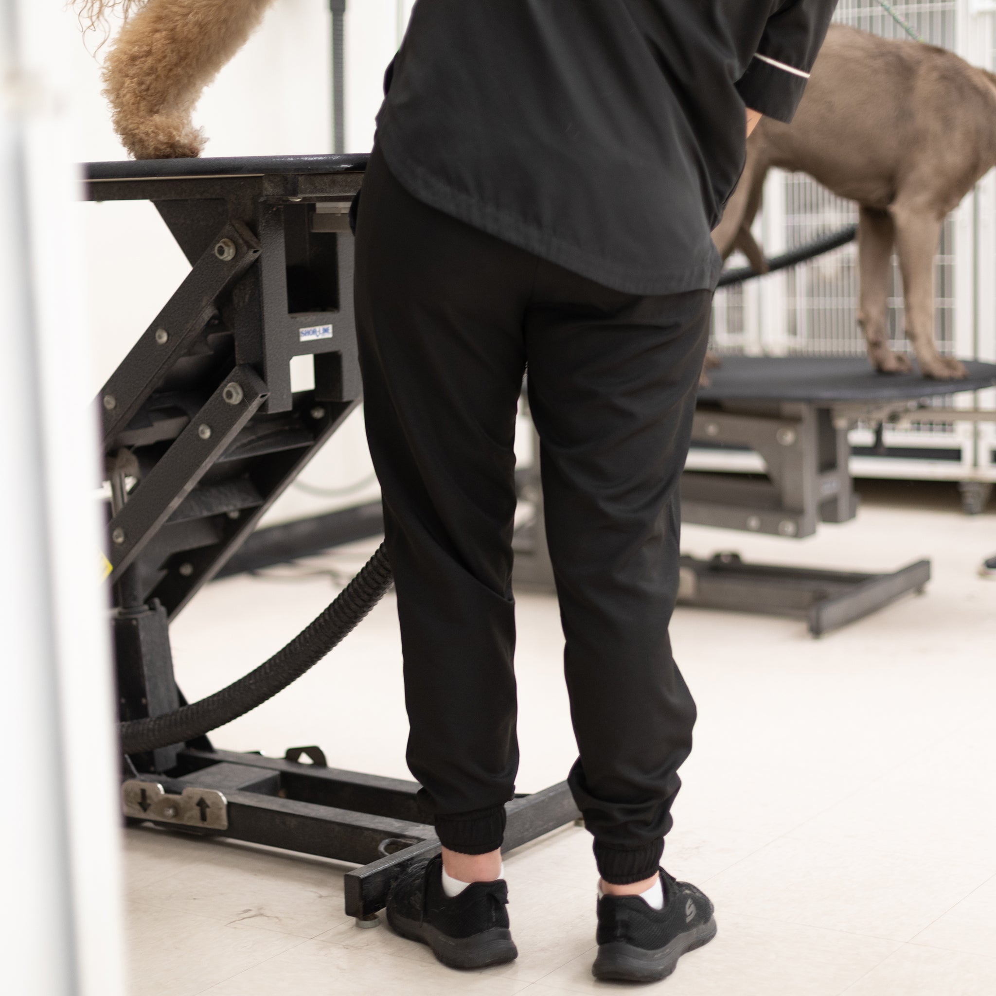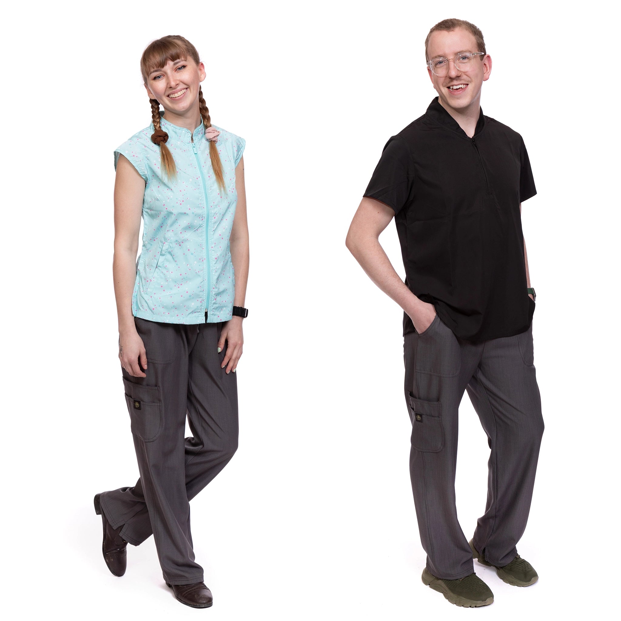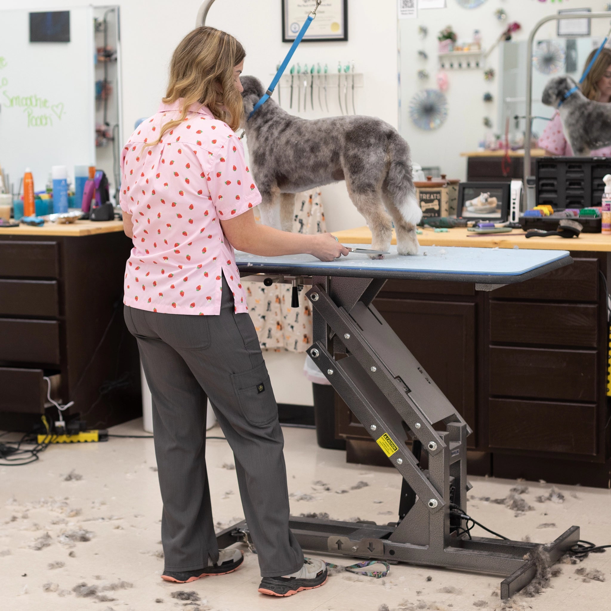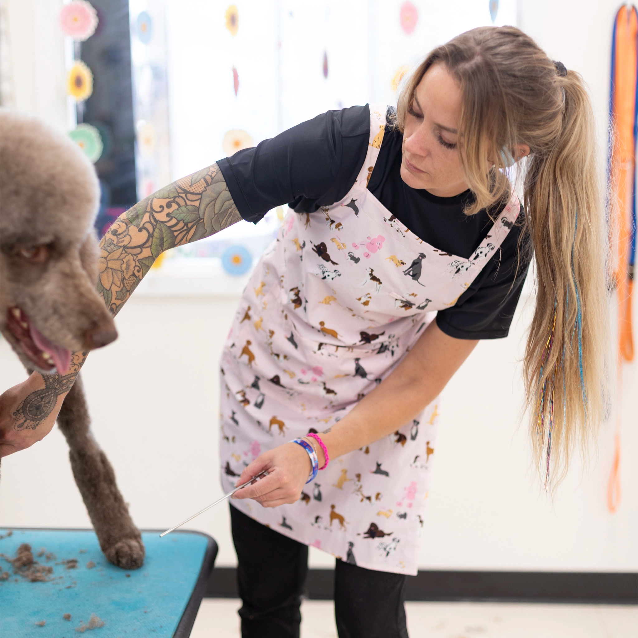 Quality pet grooming apparel designed by groomers for groomers. Our stylish grooming smocks, aprons and pants are water resistant, hair resistant, dye resistant and durable to withstand the wear and tear of professional dog grooming and cat grooming. Shop our fresh looks for women's and unisex grooming clothes in a variety of colors, patterns and styles with pockets and zippers.