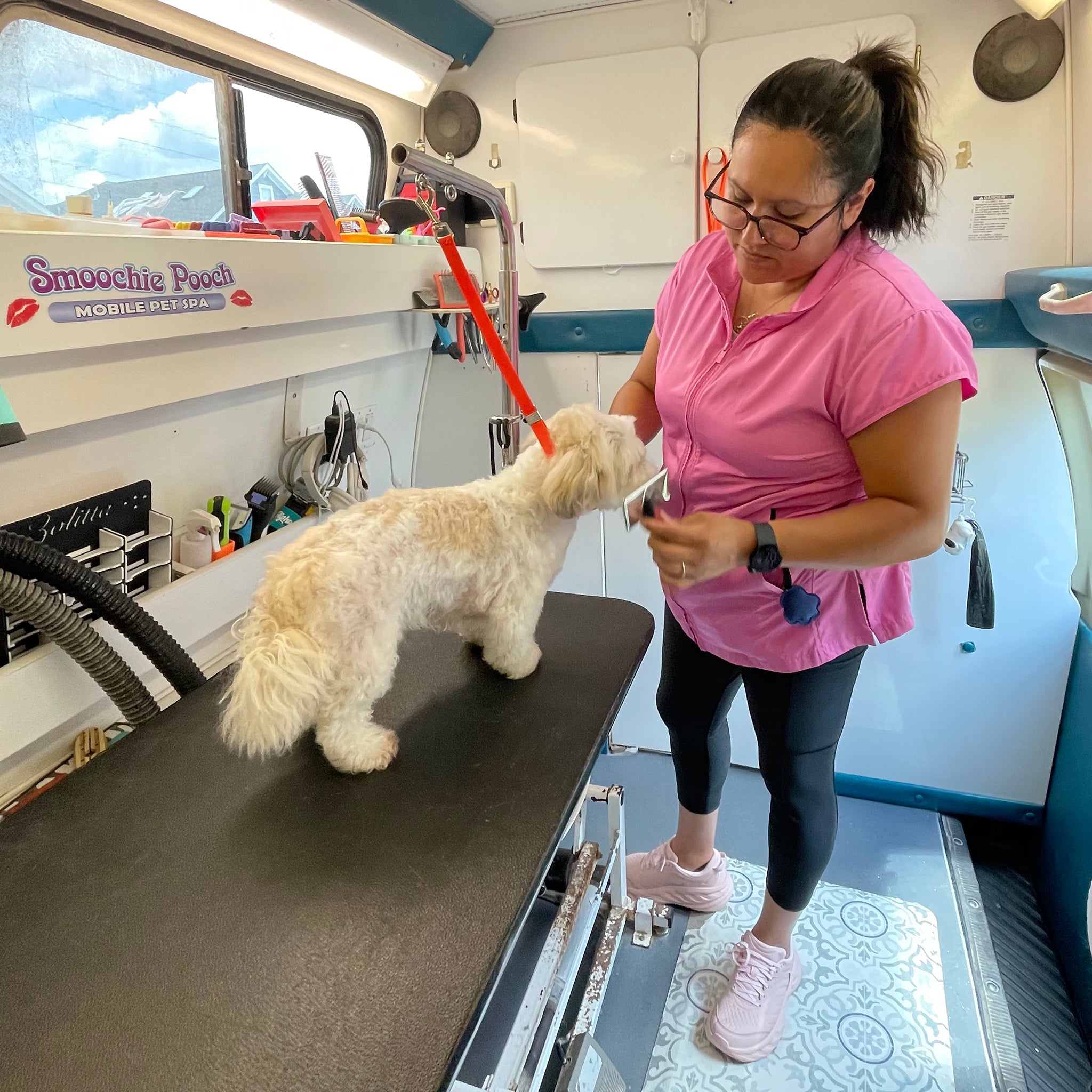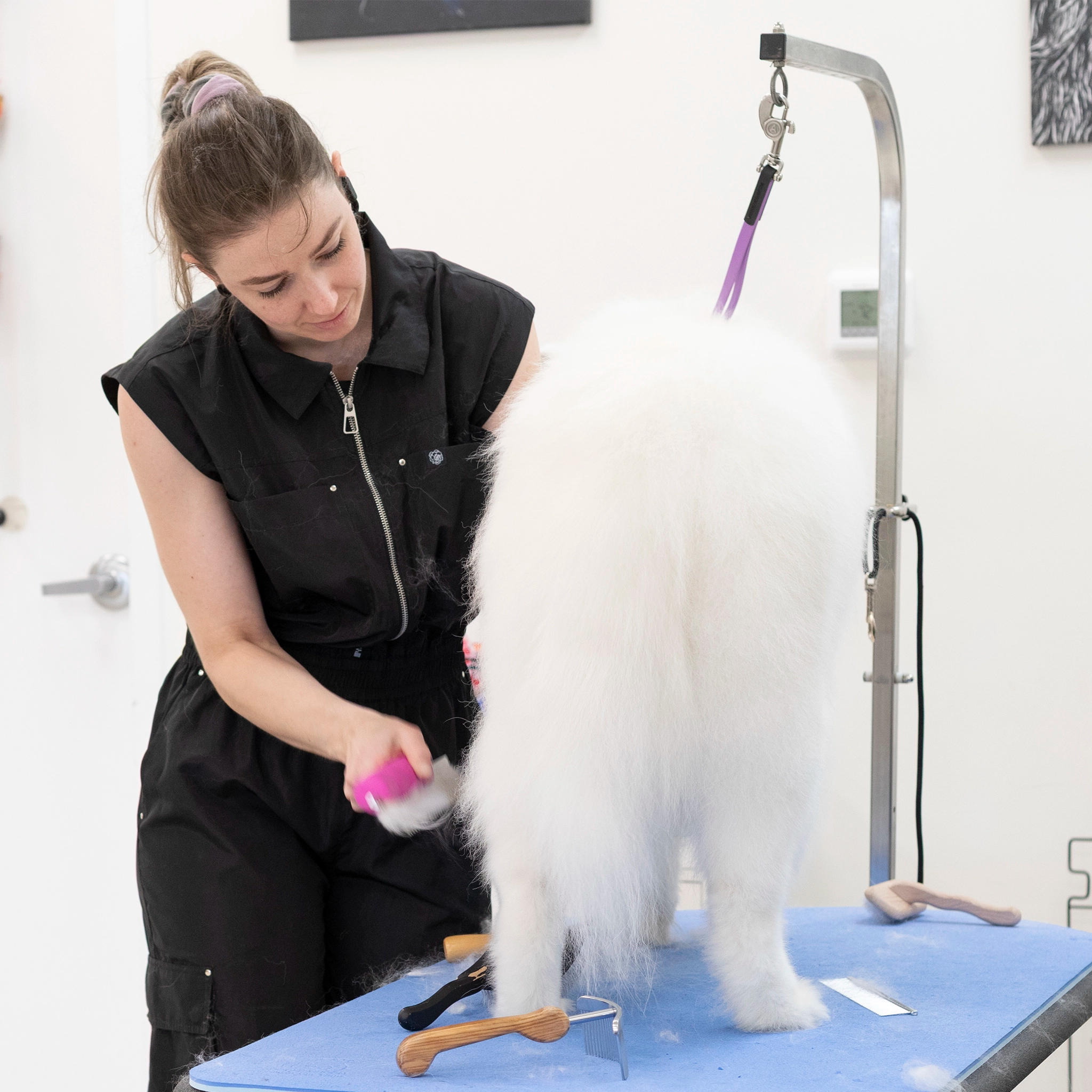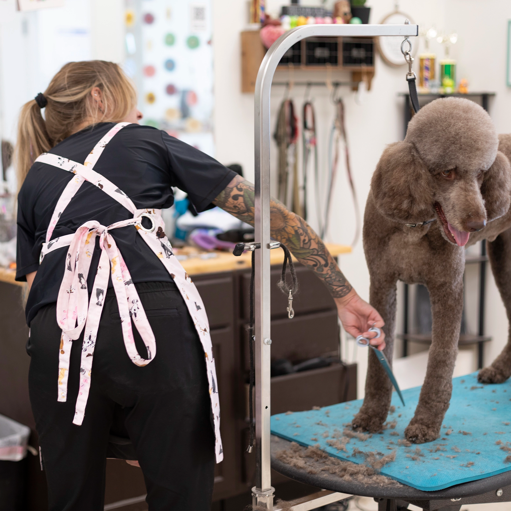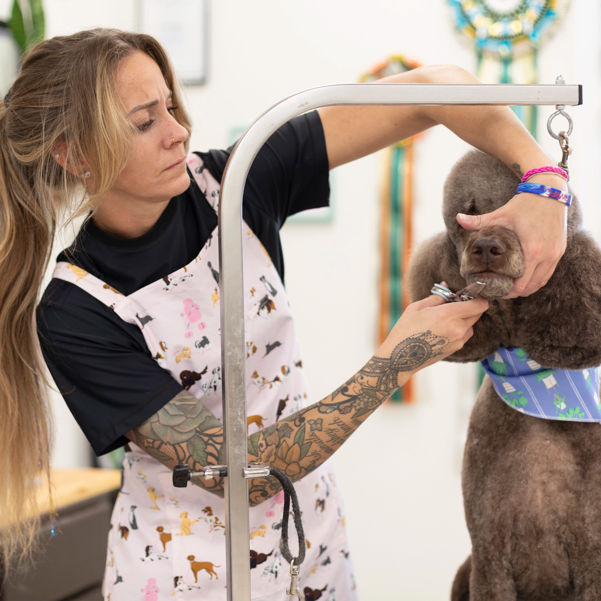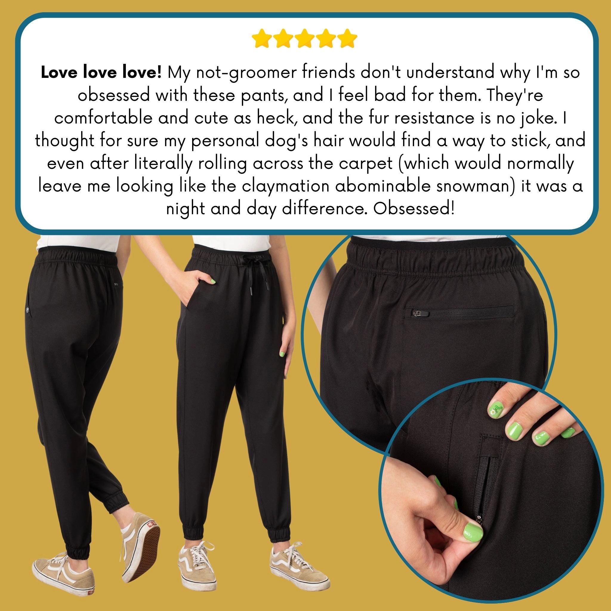Quality pet grooming apparel designed by groomers for groomers. Our stylish grooming smocks, aprons and pants are water resistant, hair resistant, dye resistant and durable to withstand the wear and tear of professional dog grooming and cat grooming. Shop our fresh looks for women's and unisex grooming clothes in a variety of colors, patterns and styles with pockets and zippers.