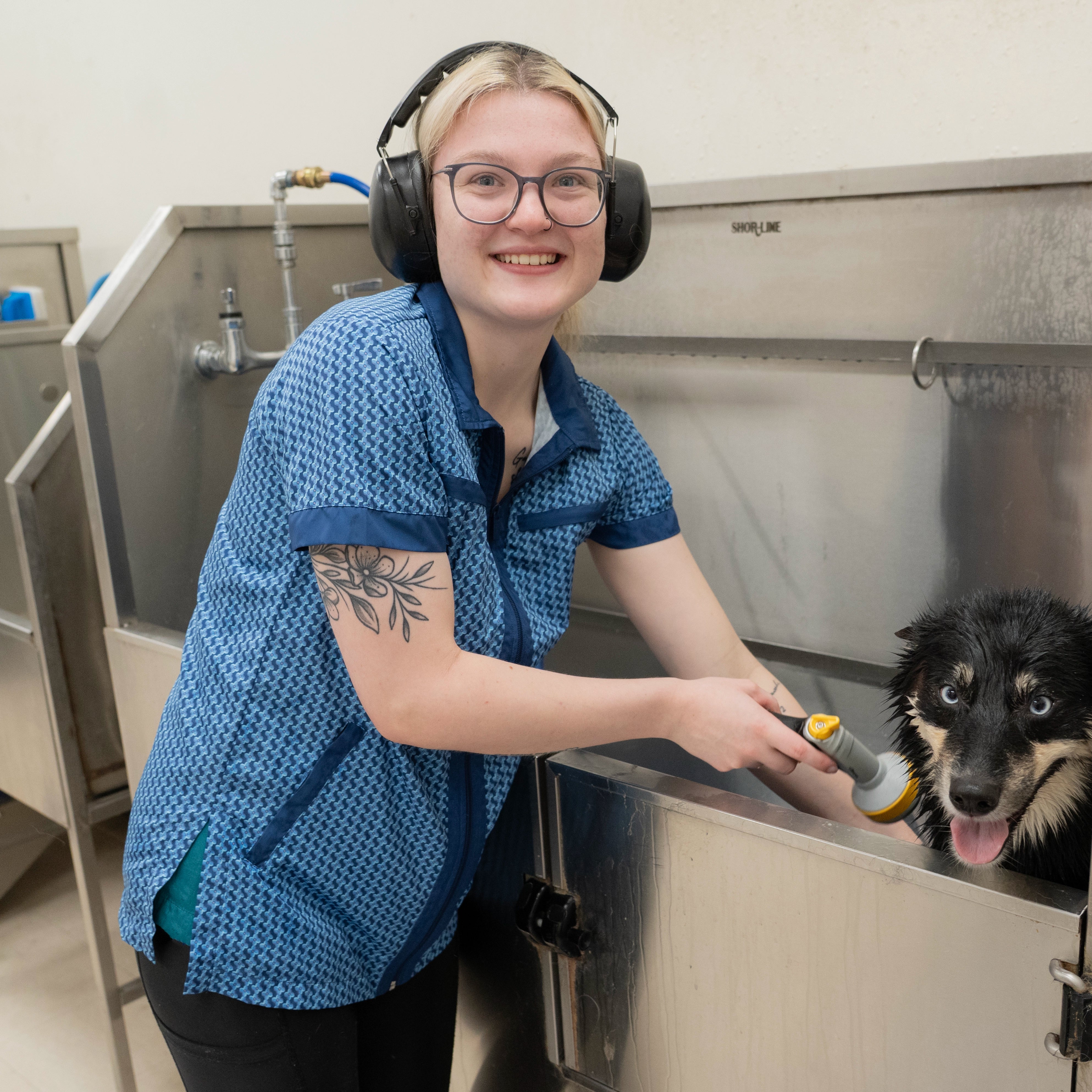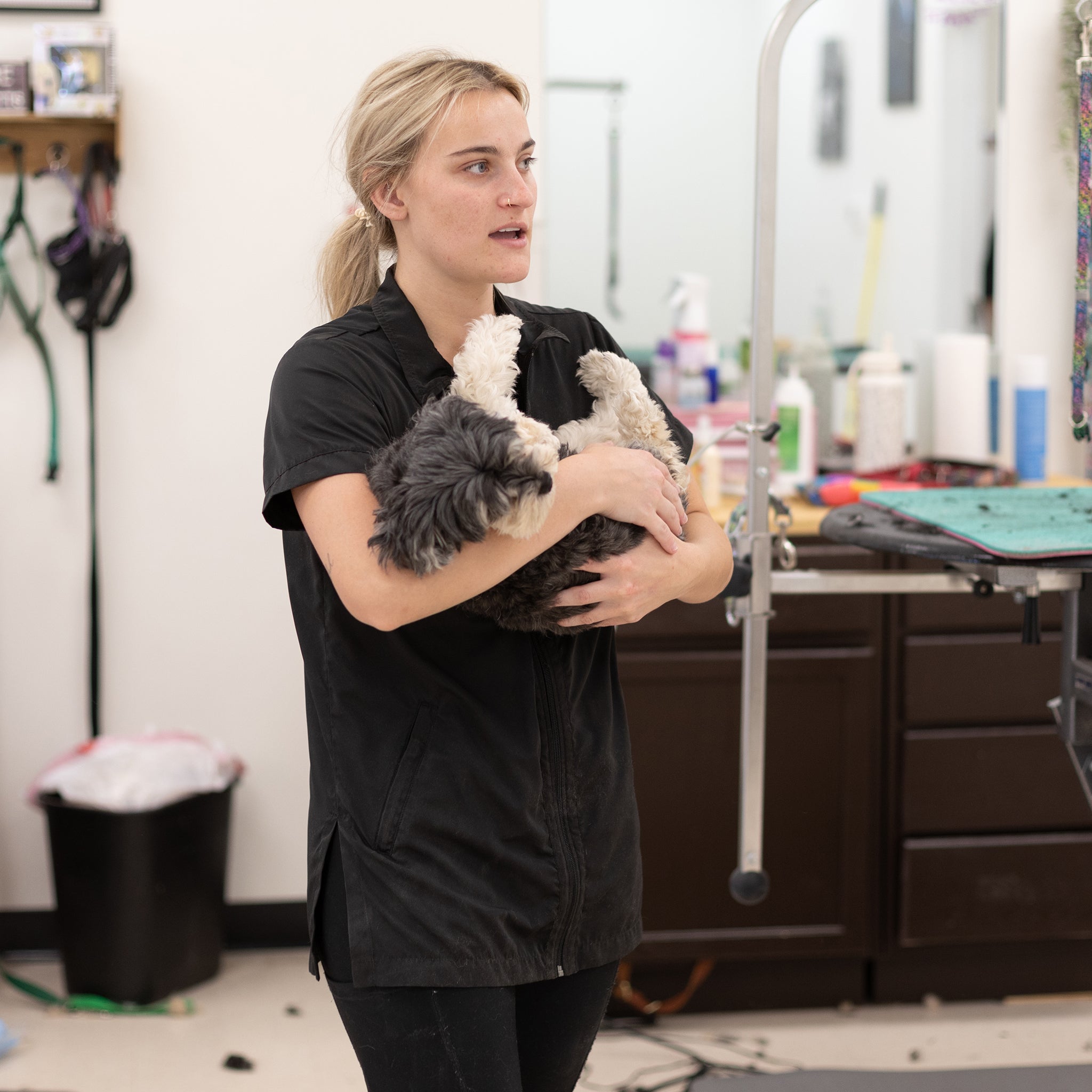 Our proprietary fabric repels fur and water. Quick drying and low maintenance, Clean Finish keeps you clean, confident and focused on the groom—not your smock.