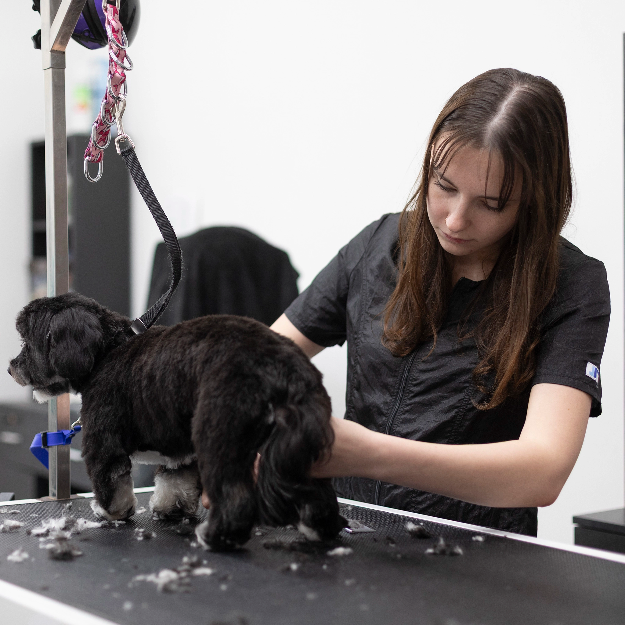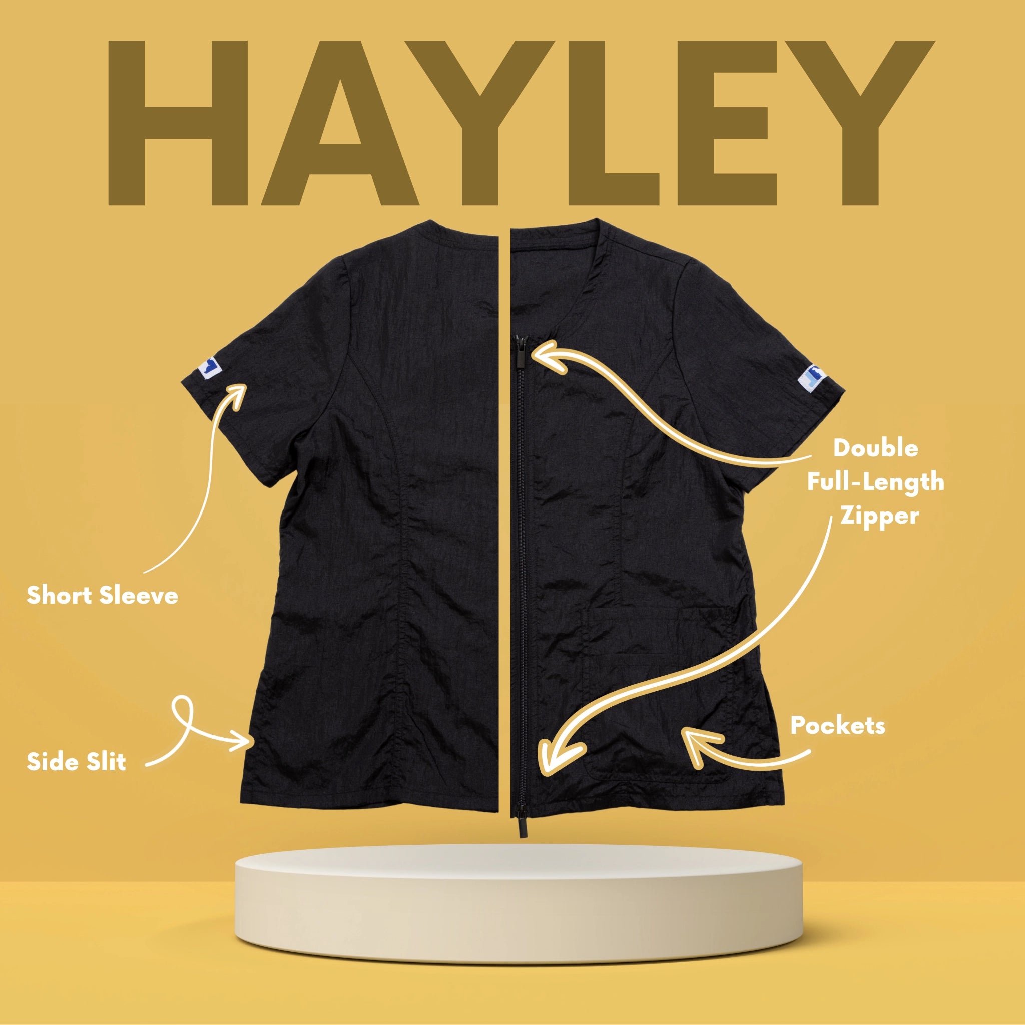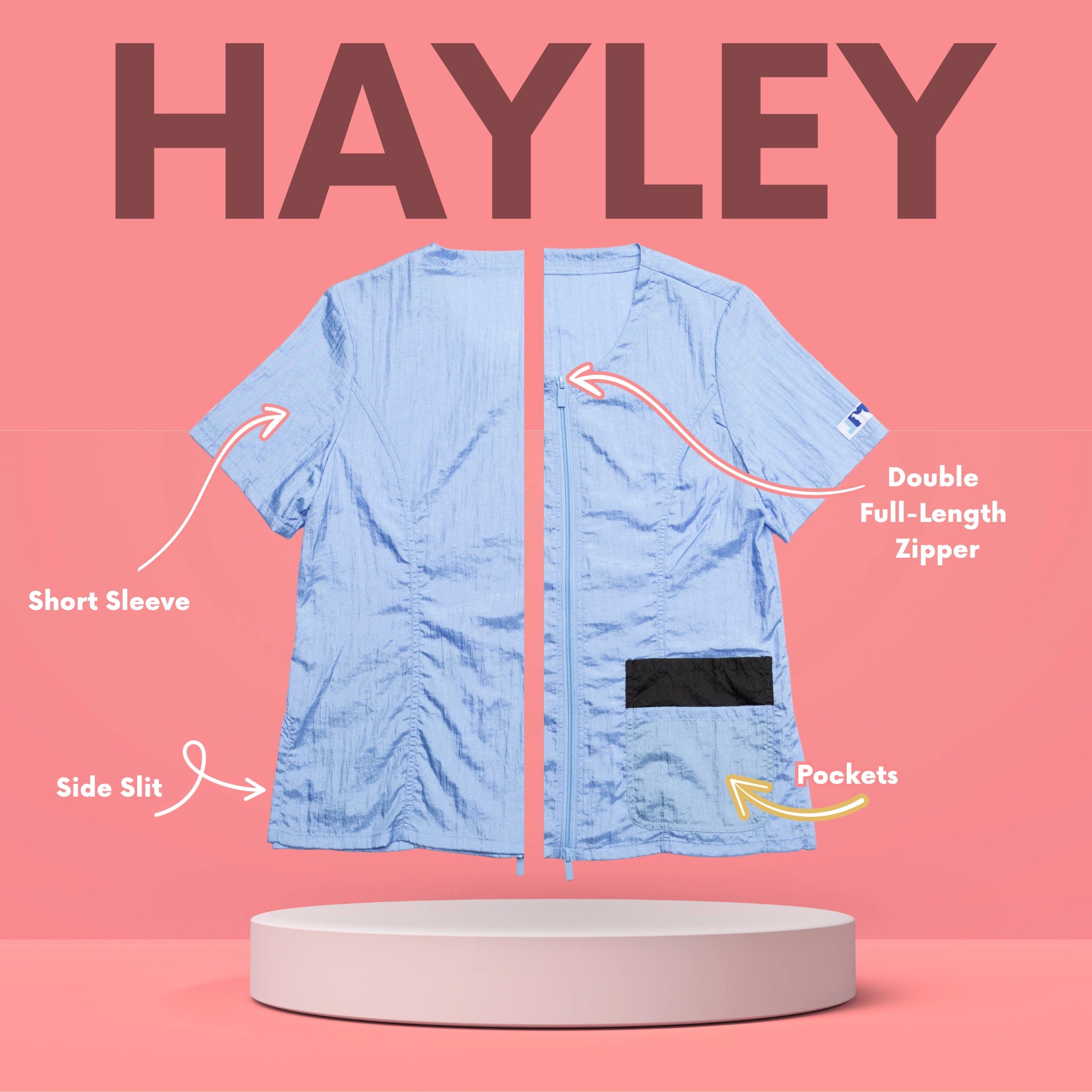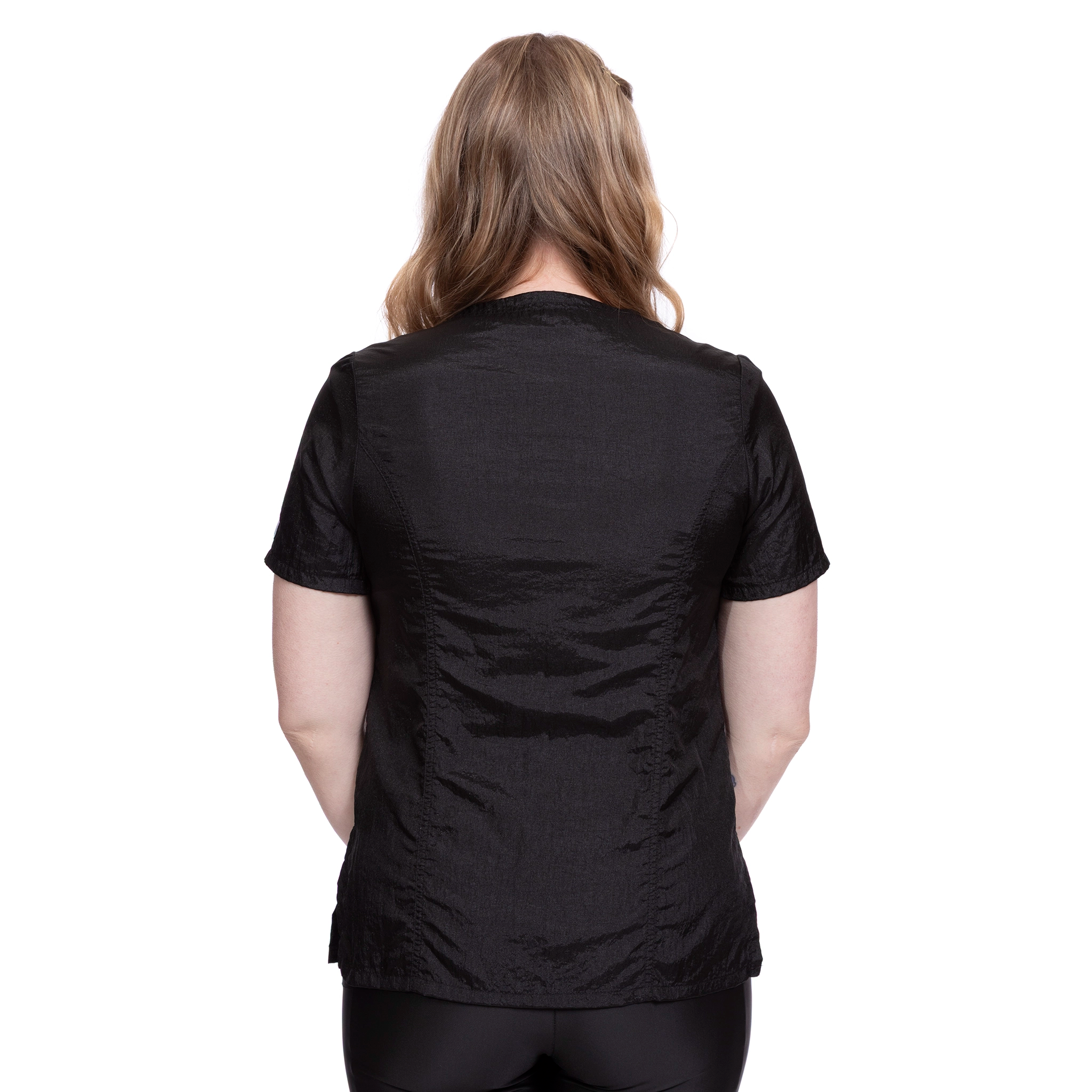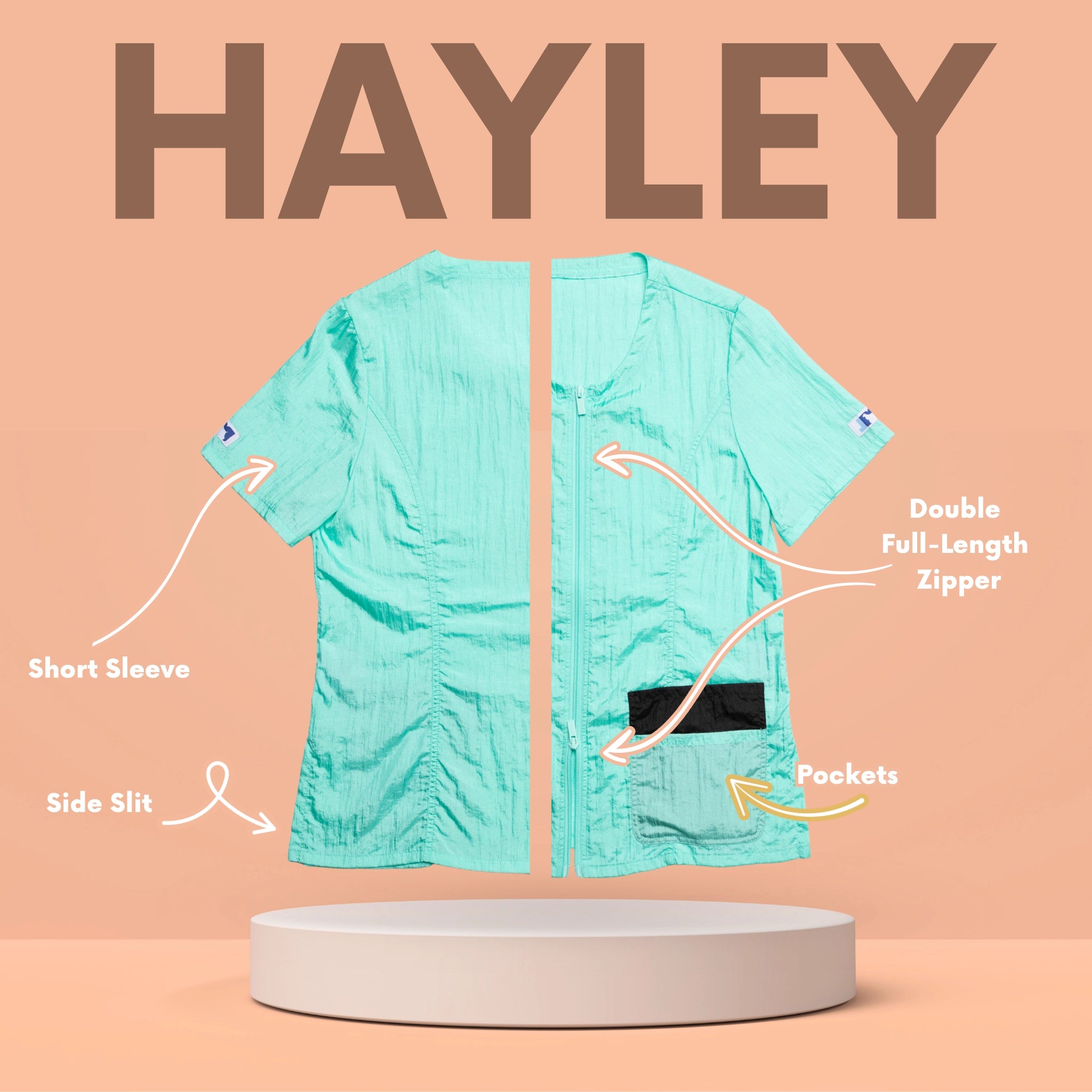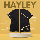 Outfit your entire salon with Jodi Murphy's water- and hair-resistant pet grooming tops. The Hayley style has double front pockets, a double zipper, comfortable short sleeves and side slits which comforts bending and sitting. Sizes range from XS through 3X. Please check the size chart as Jodi’s various styles fit differently to accommodate various body shapes.