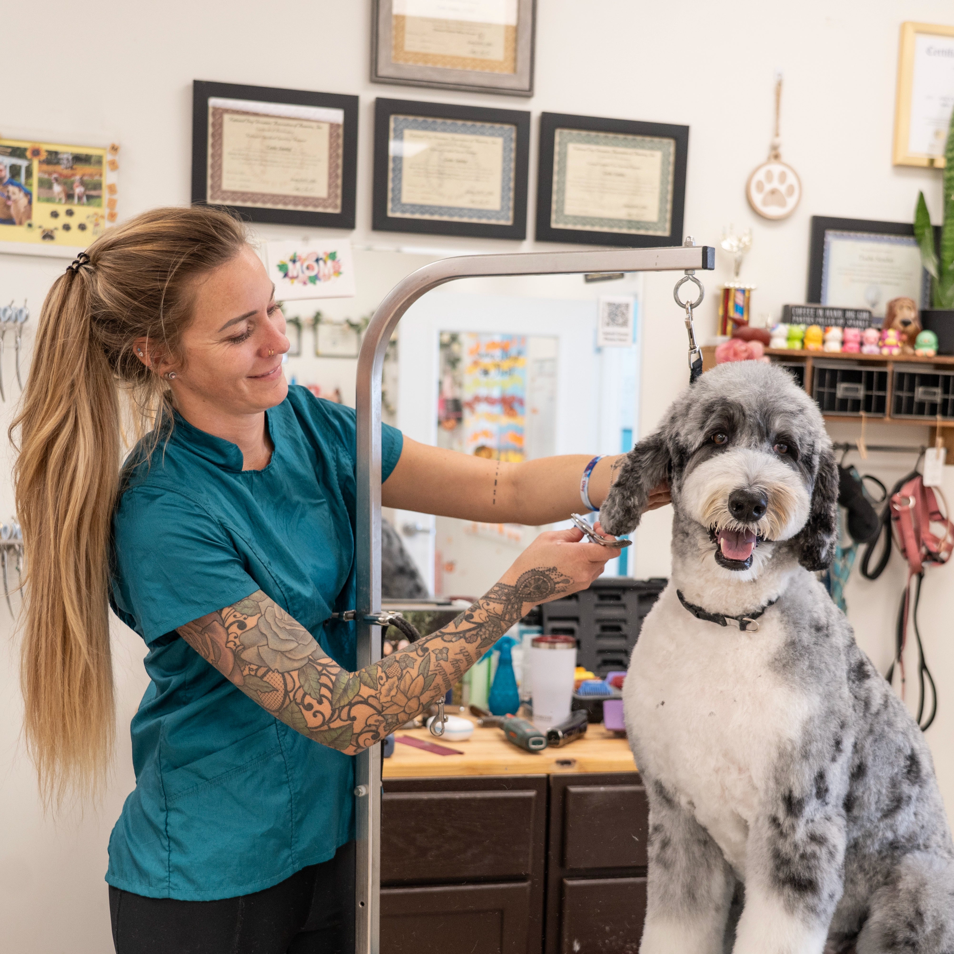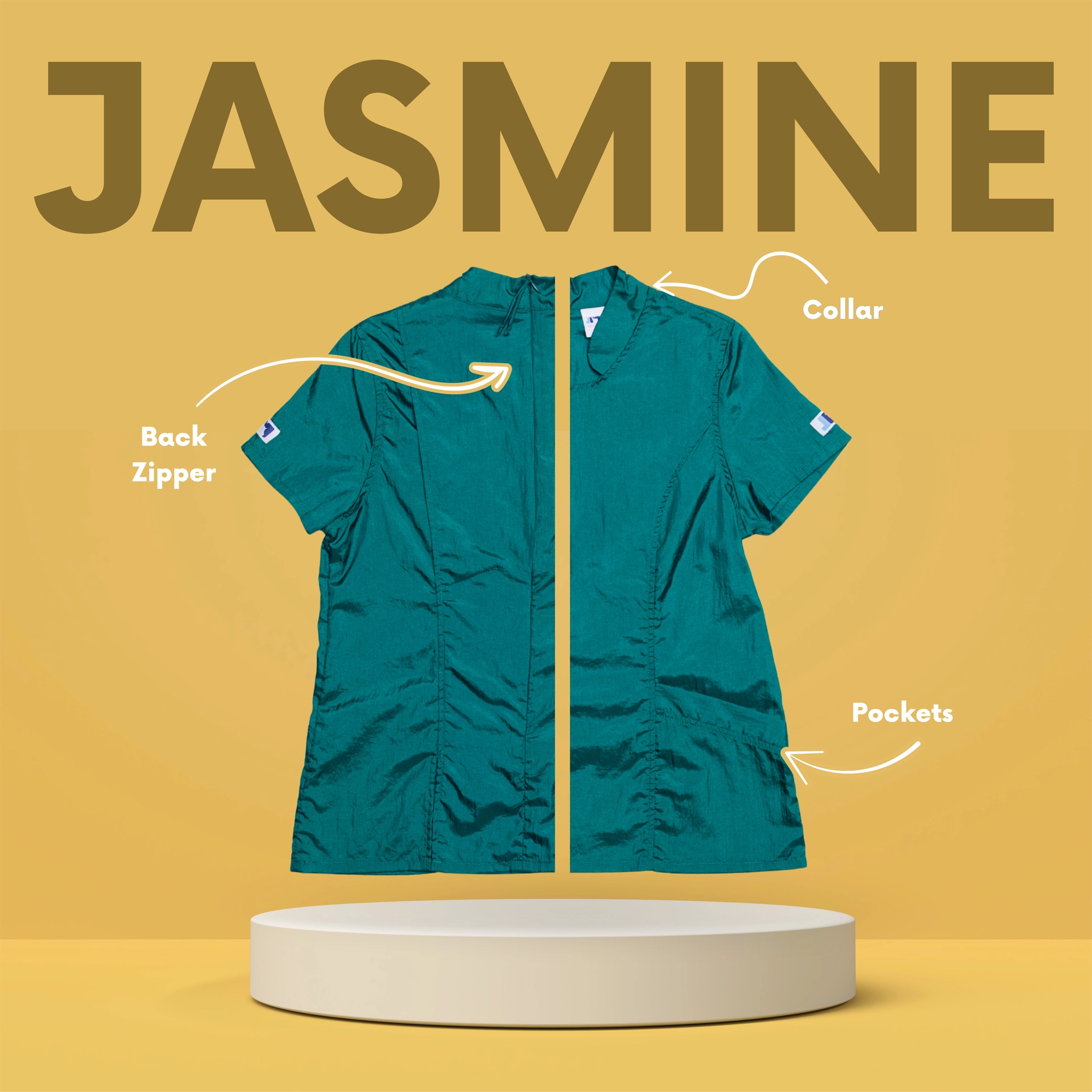 Designed for the modern groomer who values style as much as performance, the Jasmine features a high neckline, clean lines, and a bold zip-back closure for a polished, fashion-forward look that stands out in the salon. Crafted from our signature hair-resistant, lightweight nylon, it keeps you cool, comfortable, and fur-free all day long.
