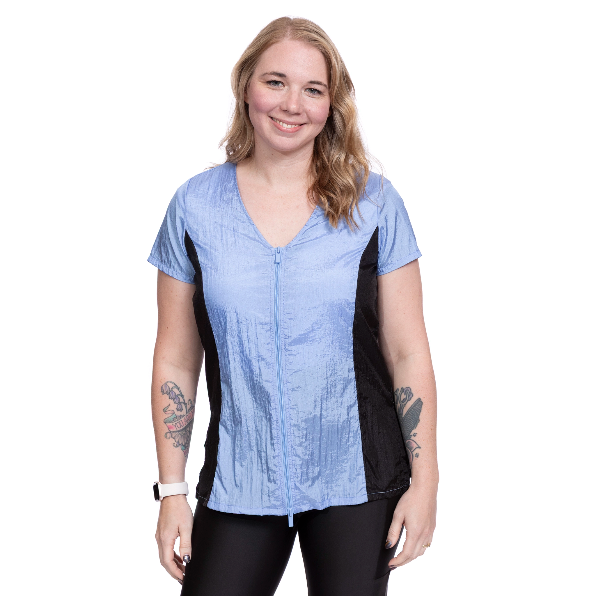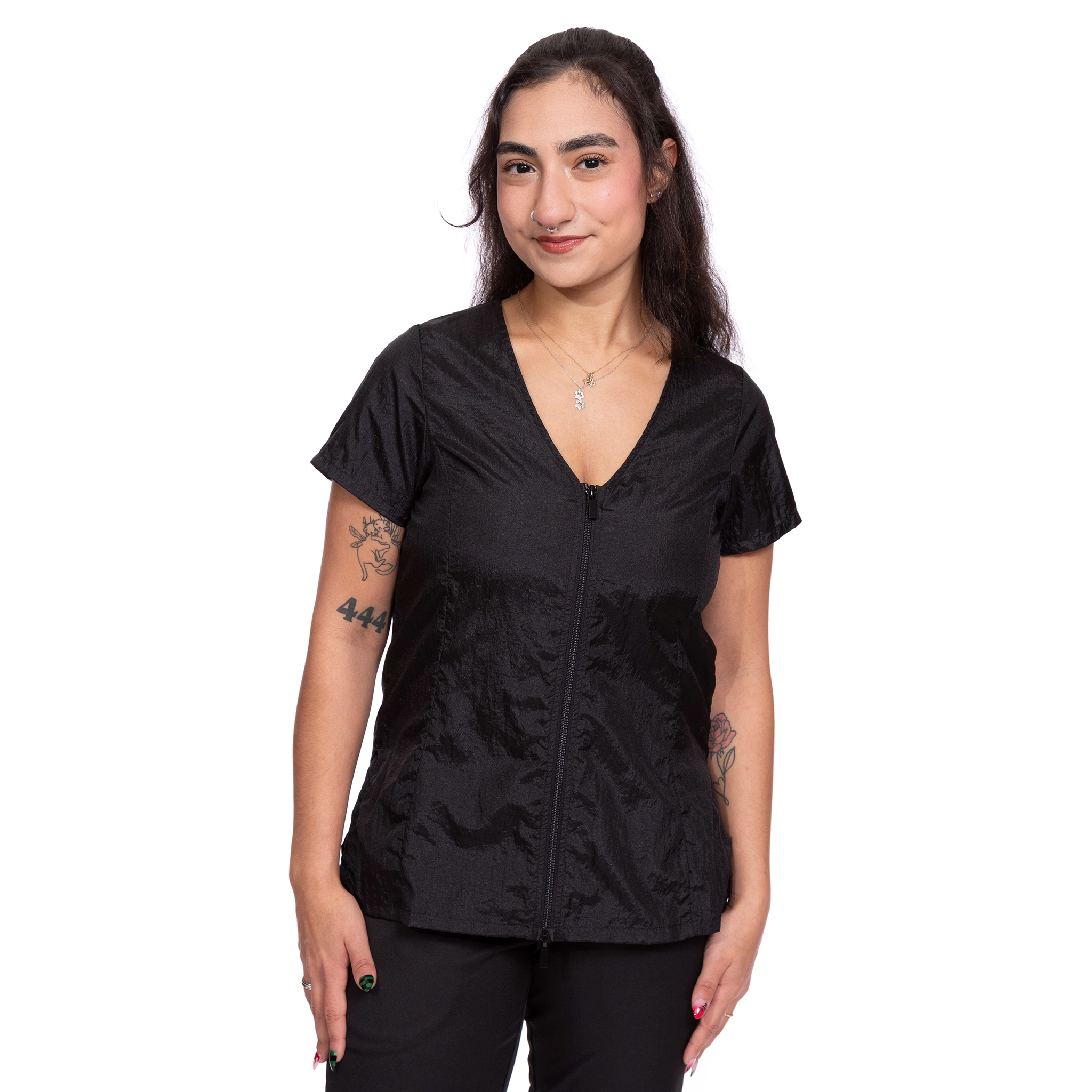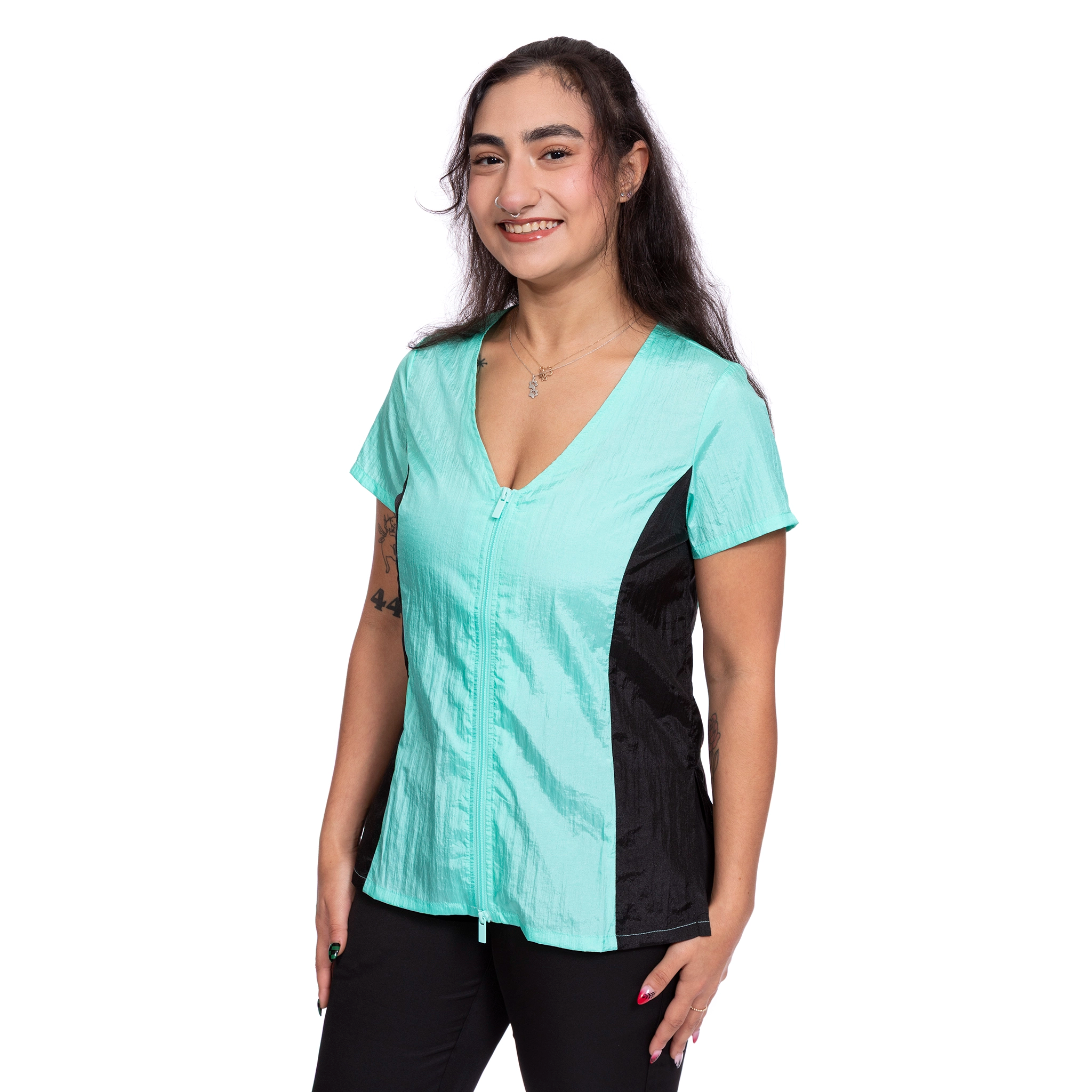 This stylish dog groomer’s top has black panels on the sides that gives a nice slimming look. This top has a full-length double zipper and side slits. This short sleeve pet groomer’s apparel top is slightly fitted with a pleated back for unrestricted movement and comfort. This smock does not have pockets.