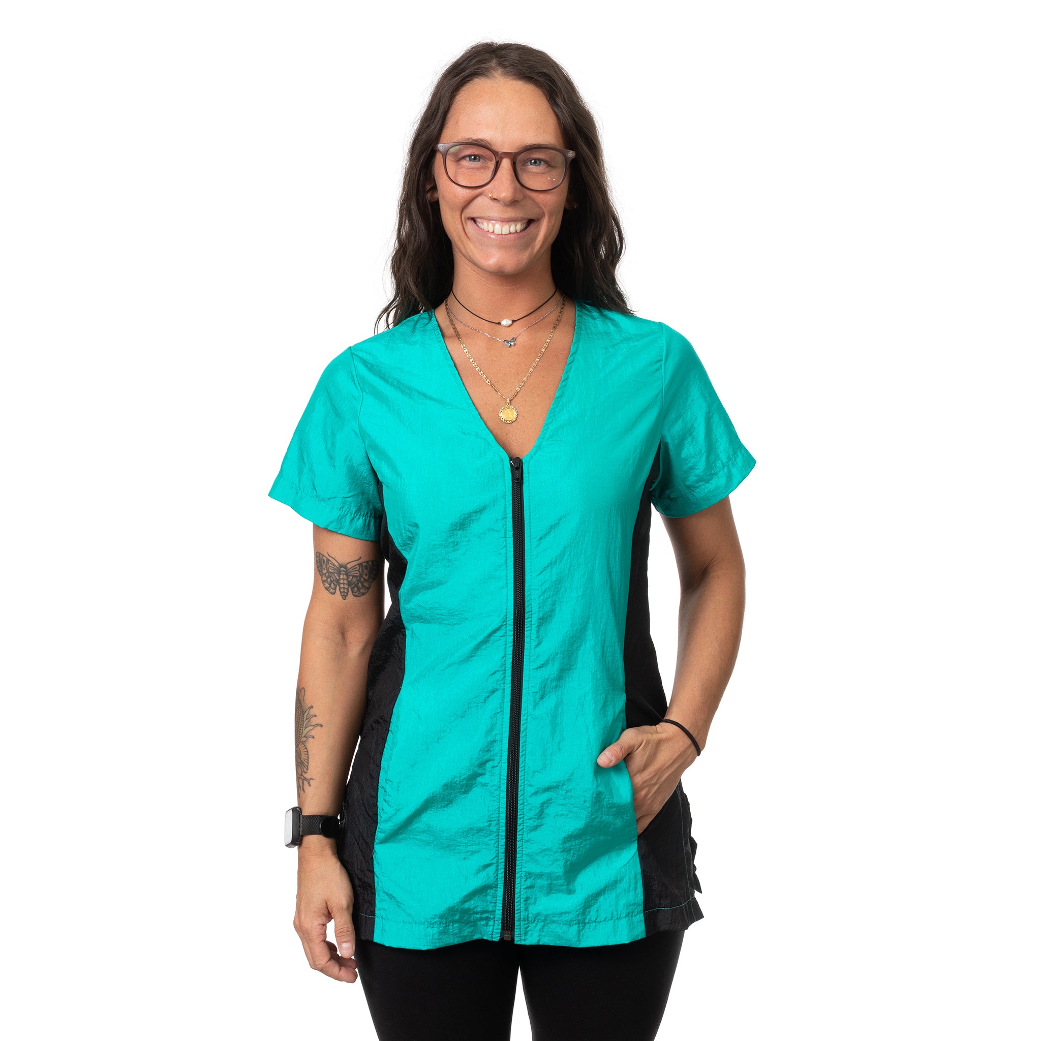 This stylish dog groomer’s top has black panels on the sides that gives a nice slimming look. This top has a full-length zipper as well as hidden side pockets to eliminate animal hair from entering. This short sleeve pet groomer’s apparel top runs true to size and is slightly fitted for a professional appearance.