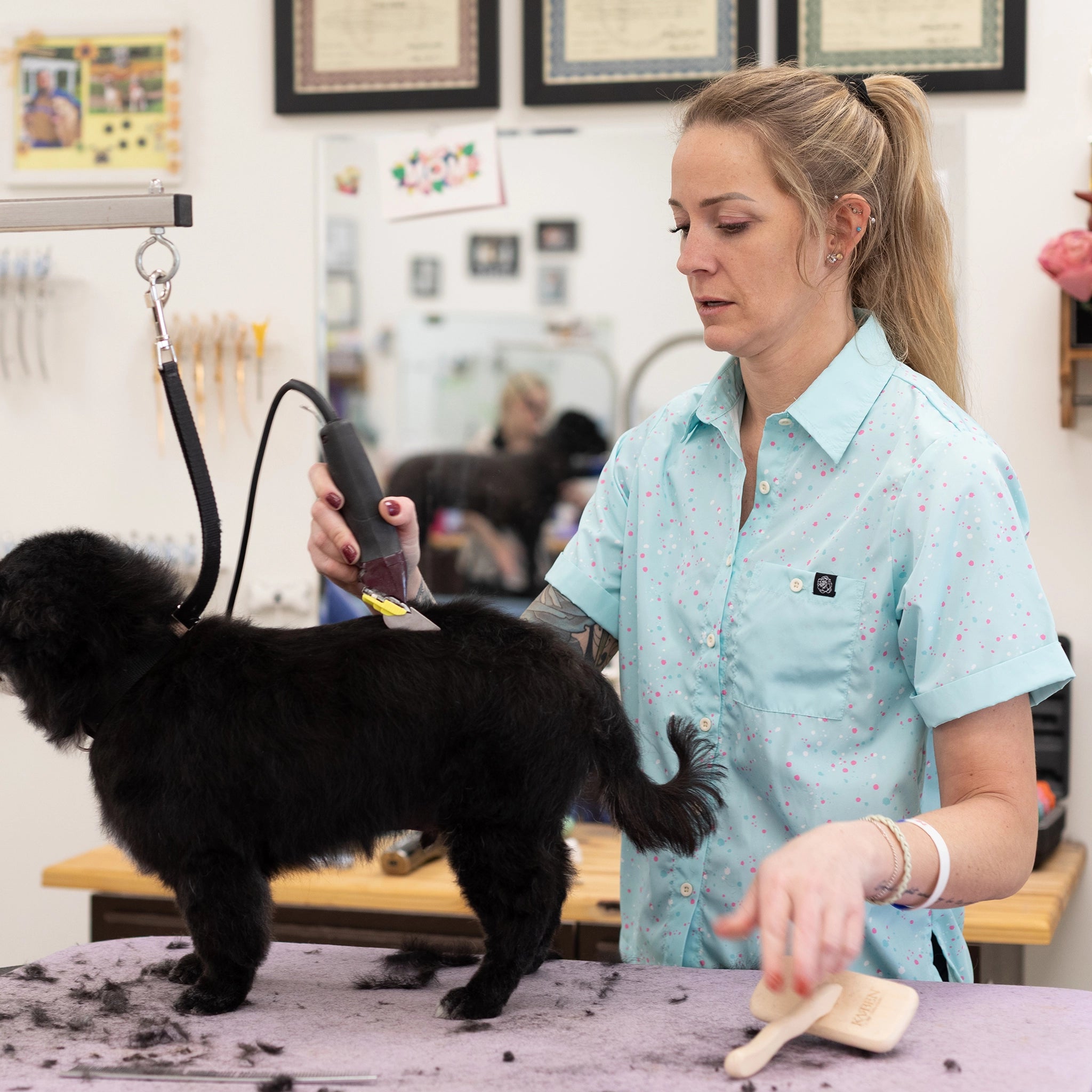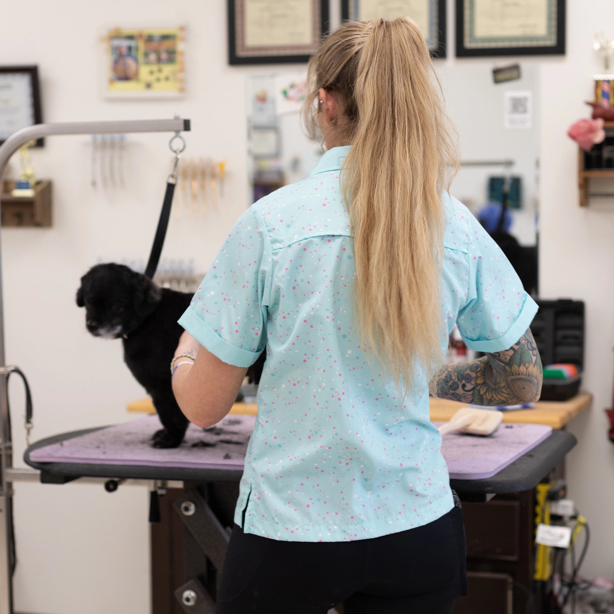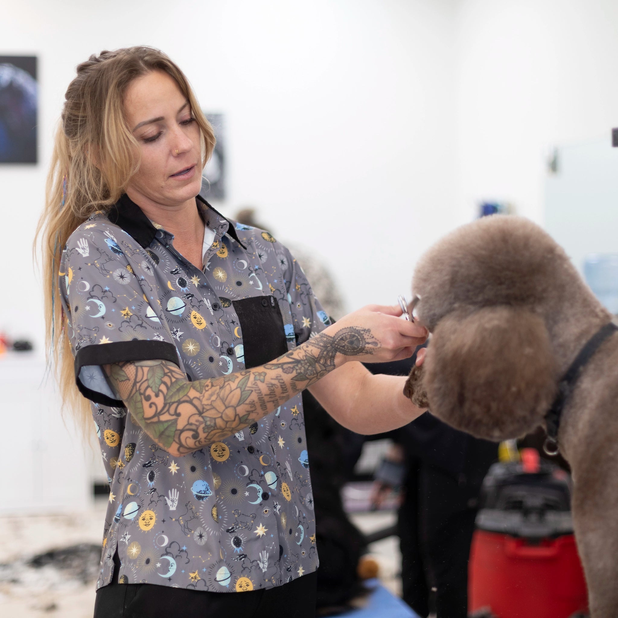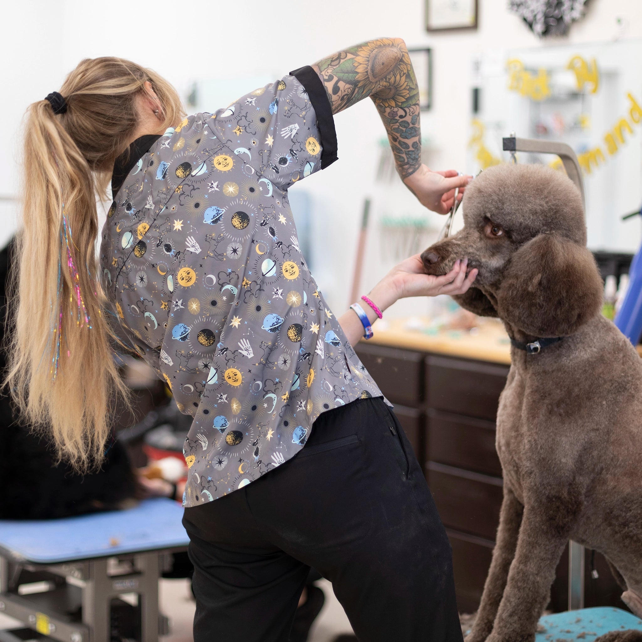 Today, Retro designs are shaped by real grooming experience. From breathable fabrics and secure zippered pockets to designs that allow for movement and all-day comfort, every detail is thoughtfully developed with working groomers in mind.