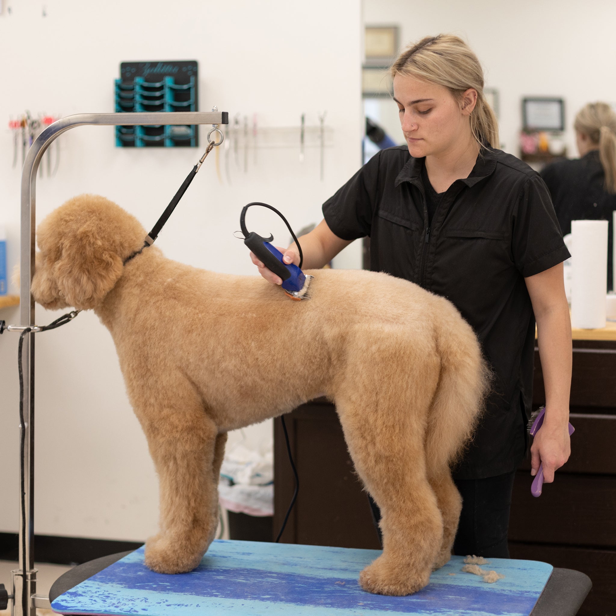 Our proprietary fabric repels fur and water. Quick drying and low maintenance, Clean Finish keeps you clean, confident and focused on the groom—not your smock.