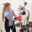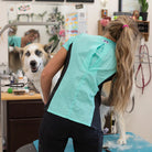 This stylish dog groomer’s top has black panels on the sides that gives a nice slimming look. This top has a full-length double zipper and side slits. This short sleeve pet groomer’s apparel top is slightly fitted with a pleated back for unrestricted movement and comfort. This smock does not have pockets.