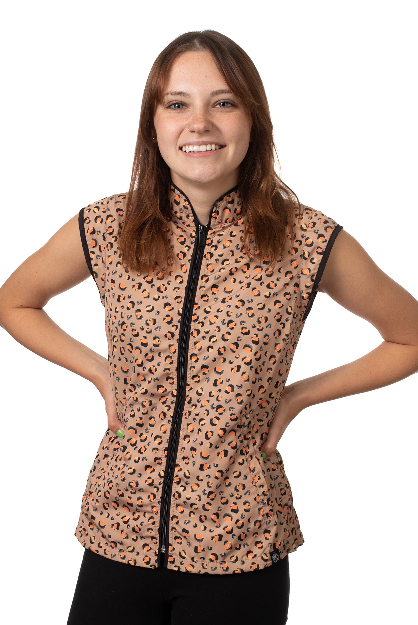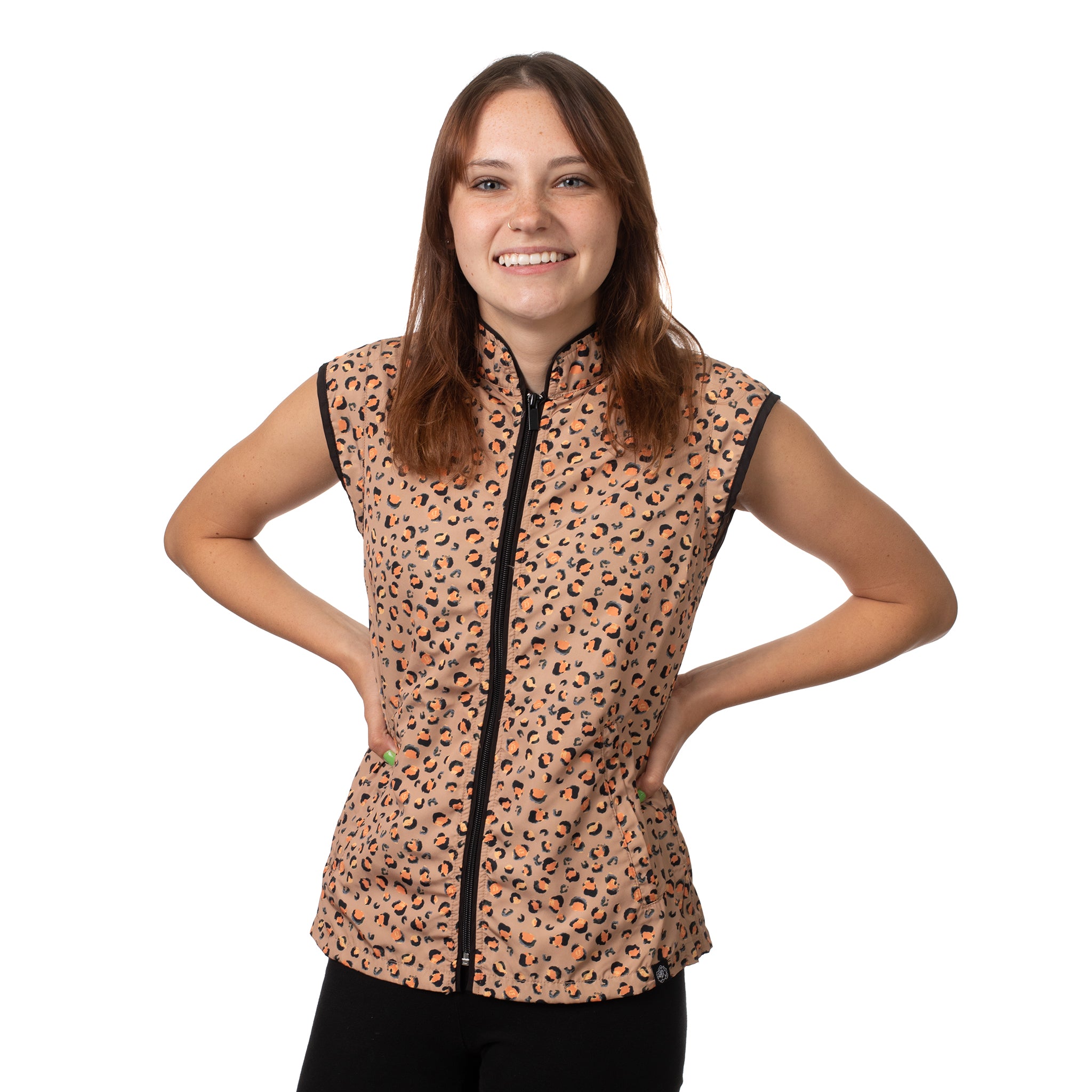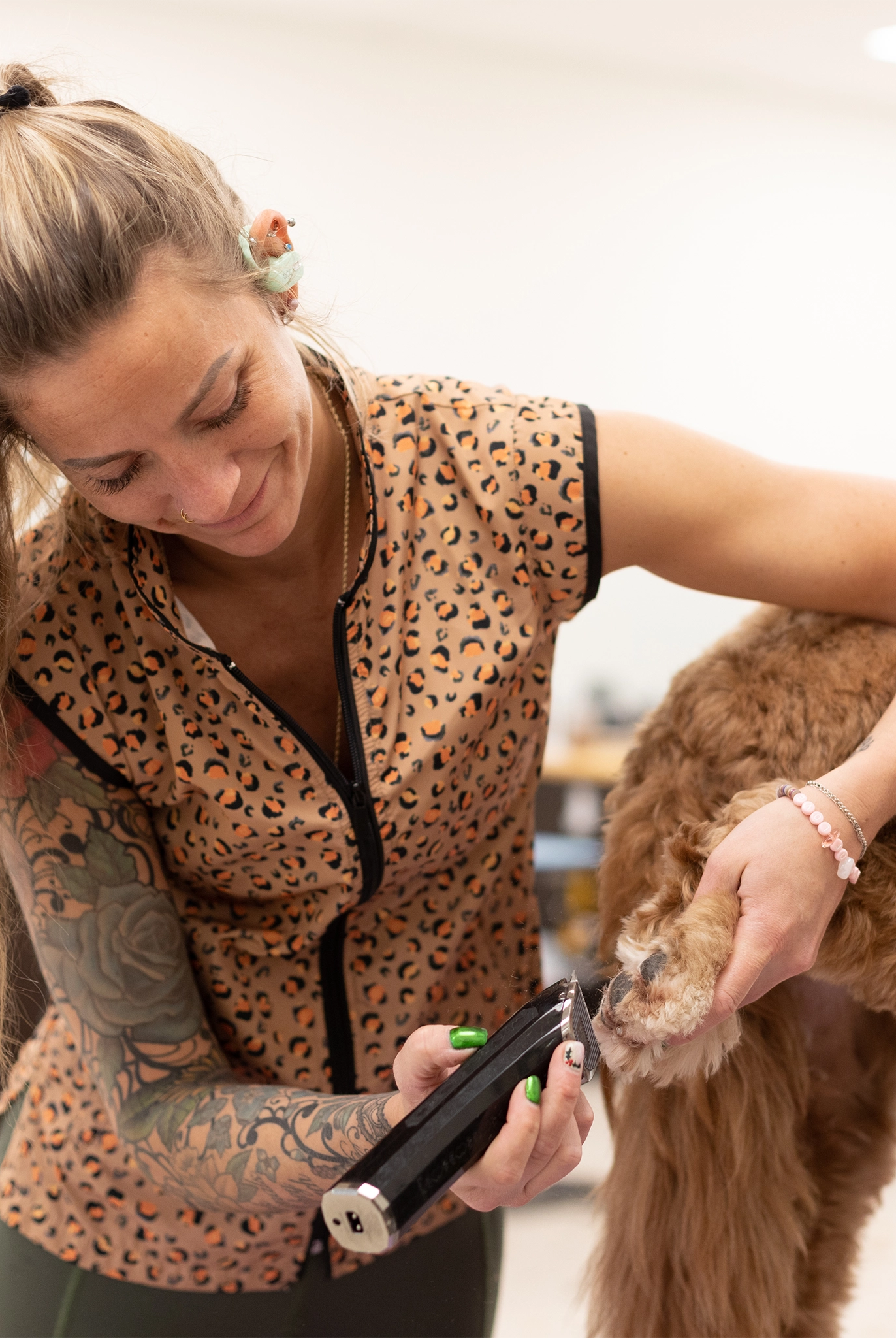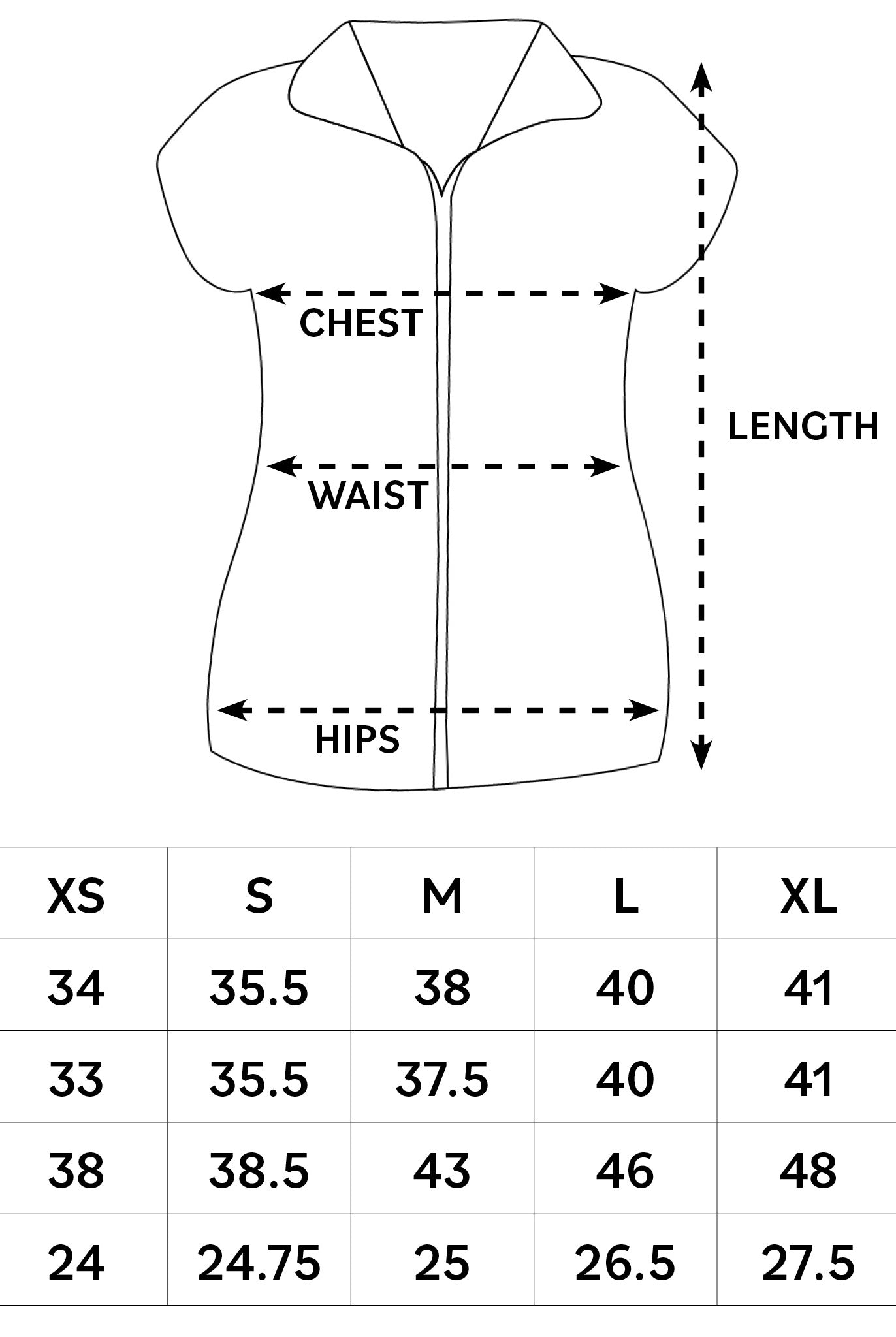 The Sophia pet grooming smock: Fitted design featuring slimming darts, cap sleeves, a polished collar and zippered pockets.