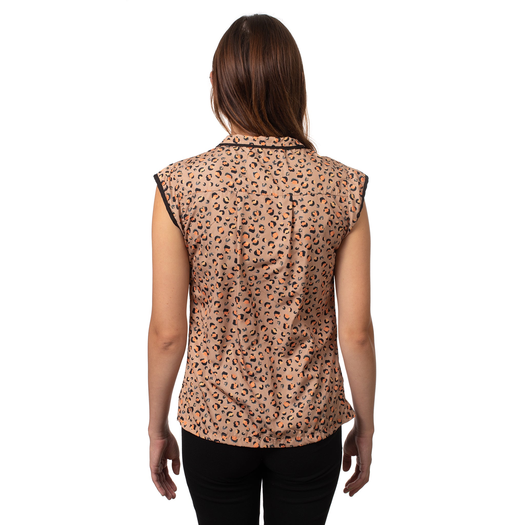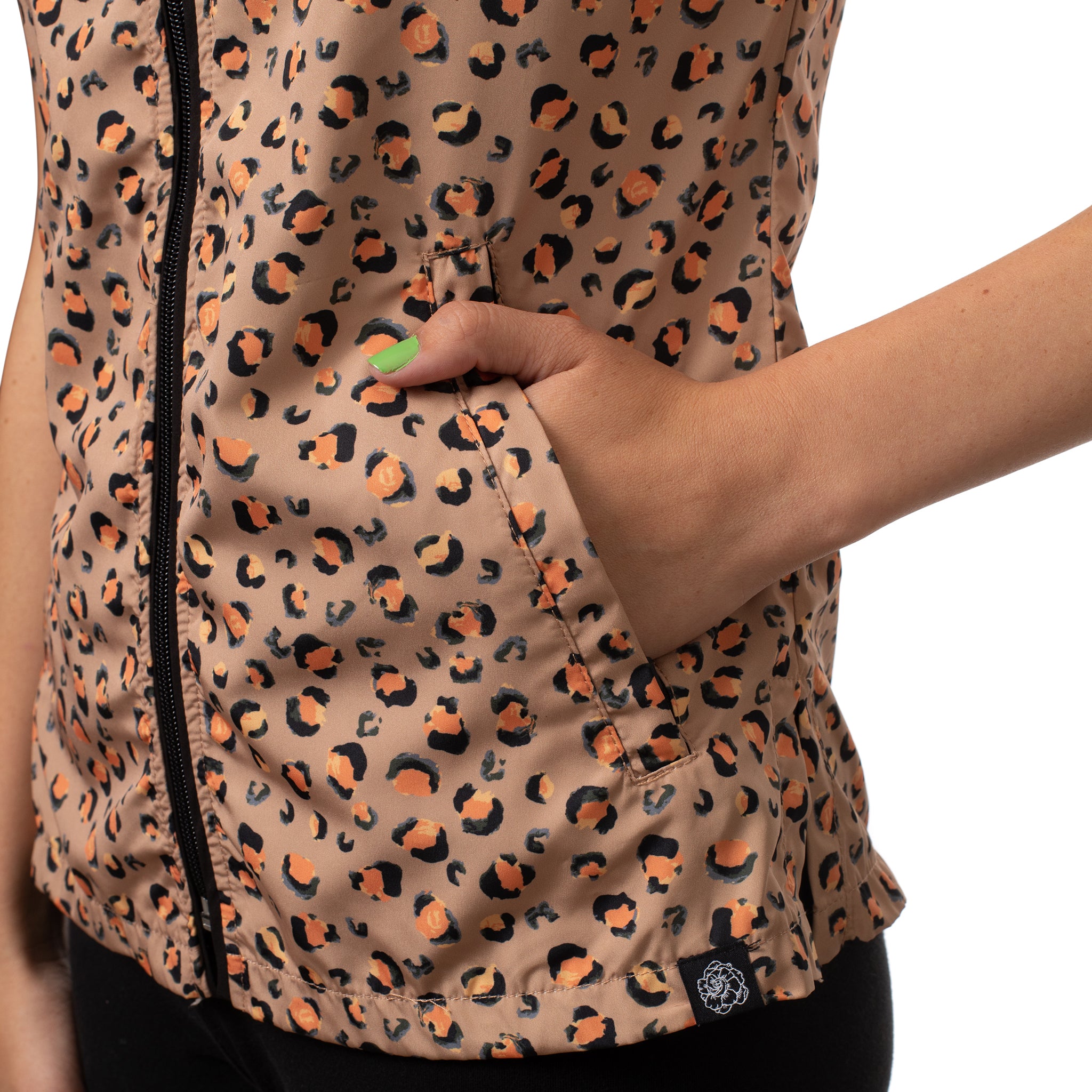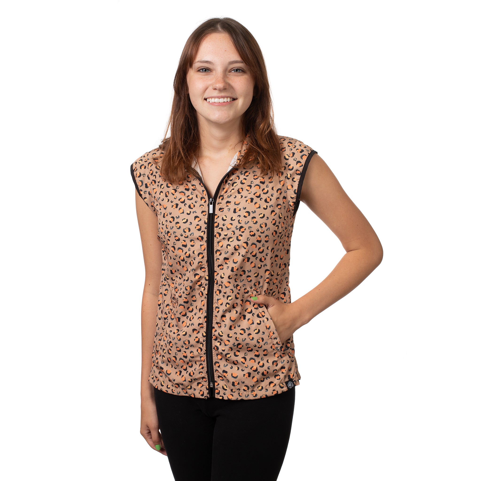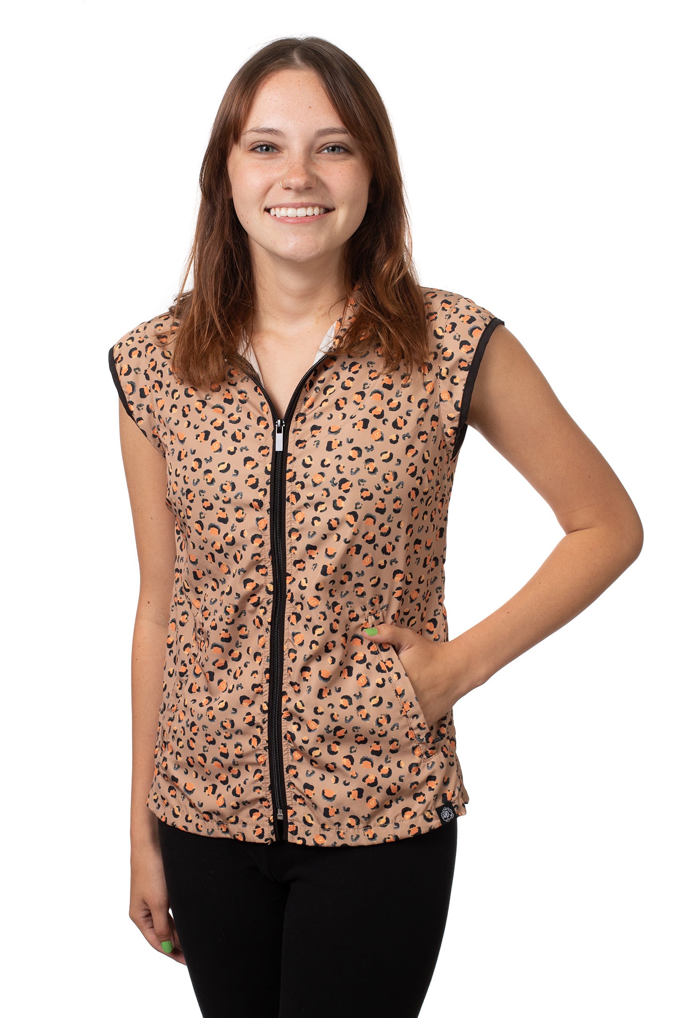 The Sophia pet grooming smock: Fitted design featuring slimming darts, cap sleeves, a polished collar and zippered pockets.