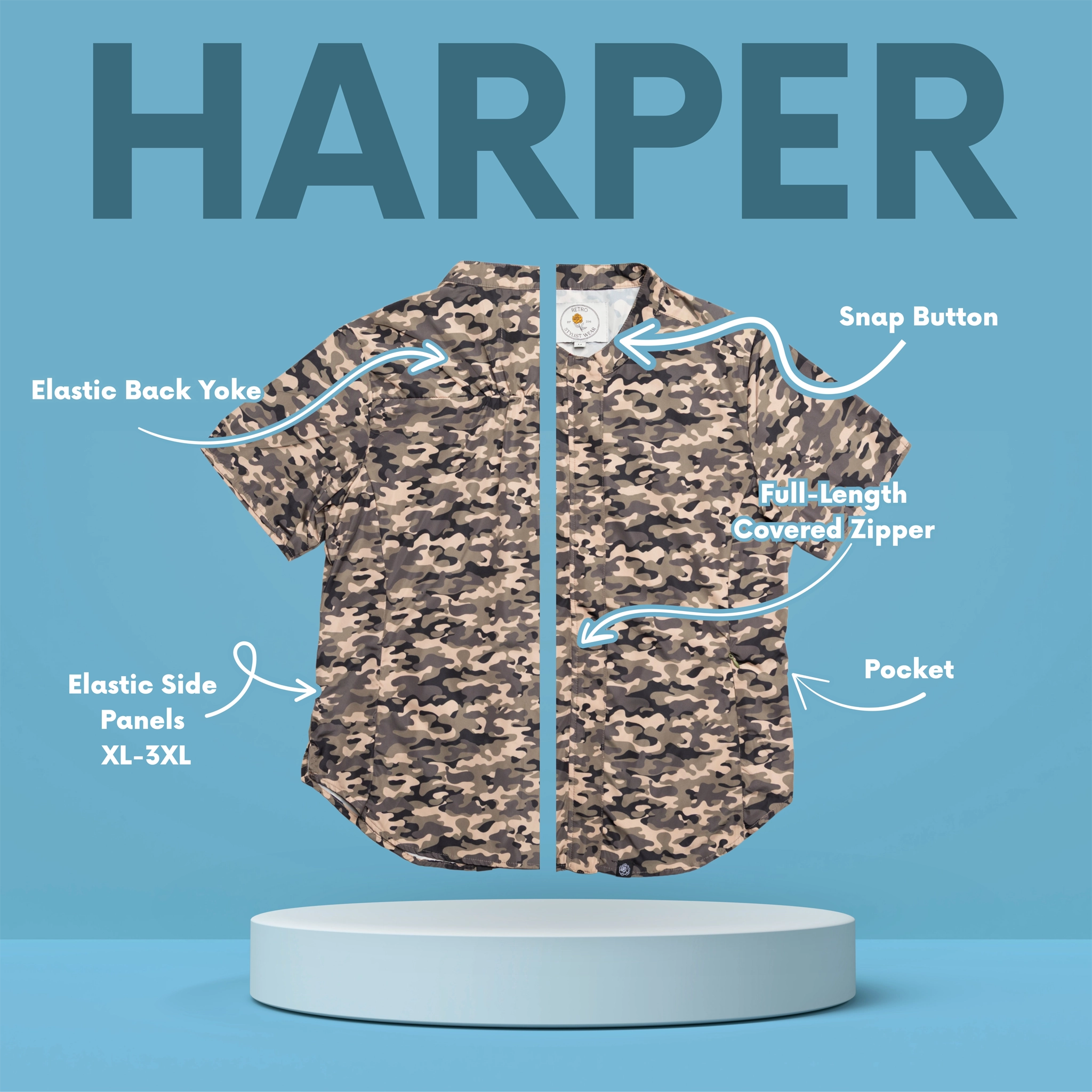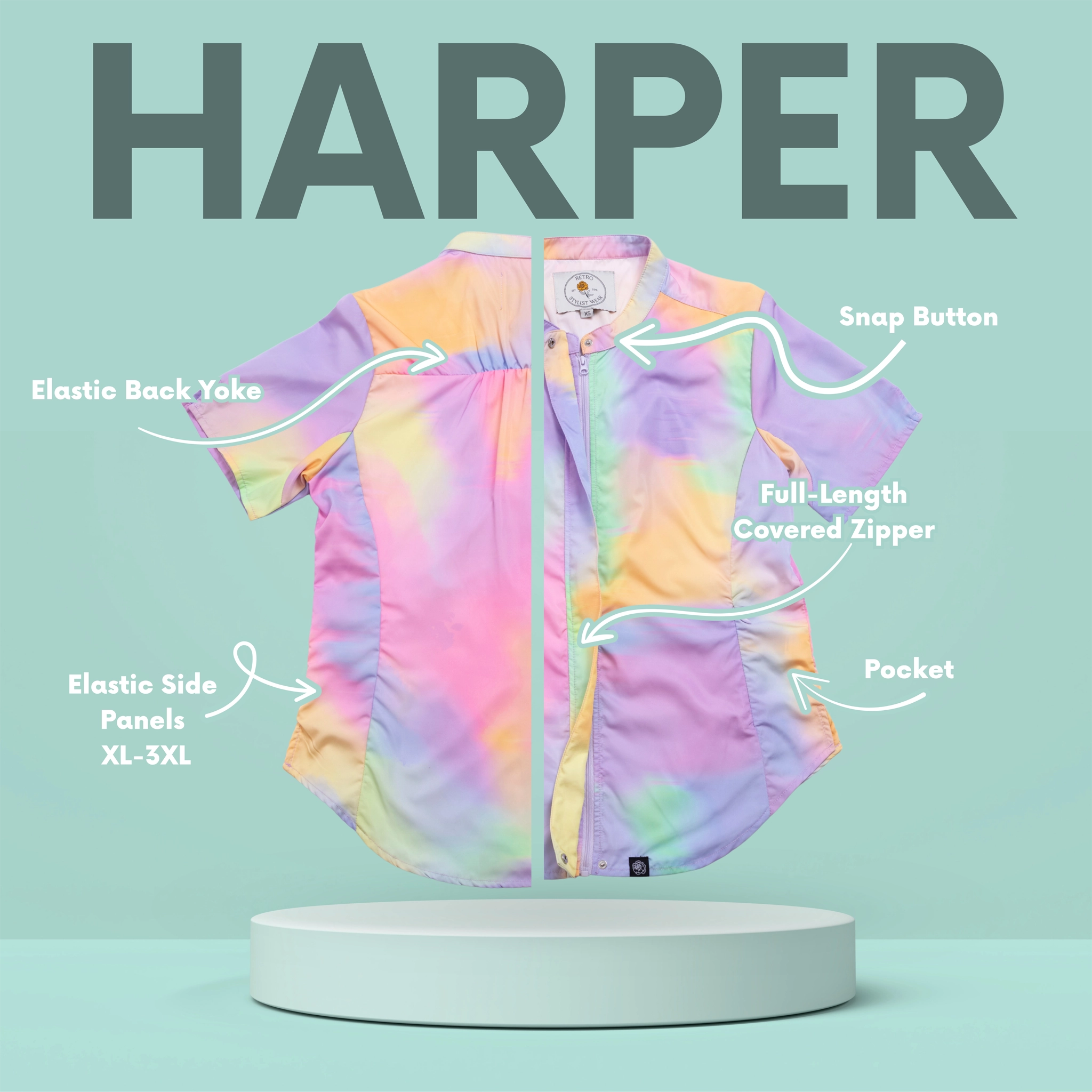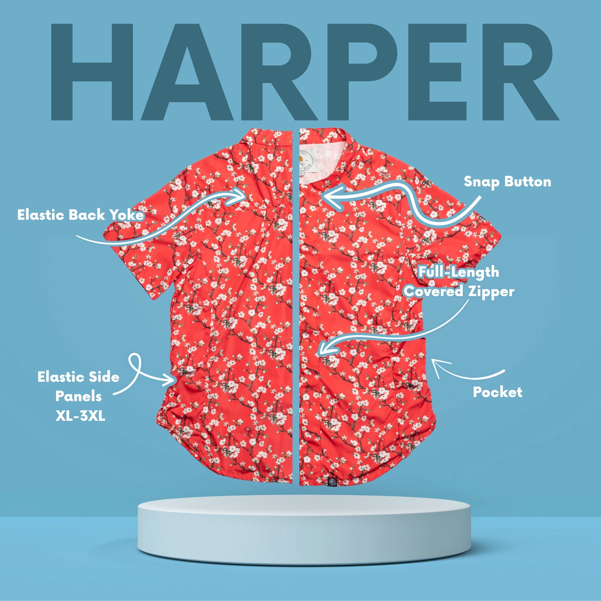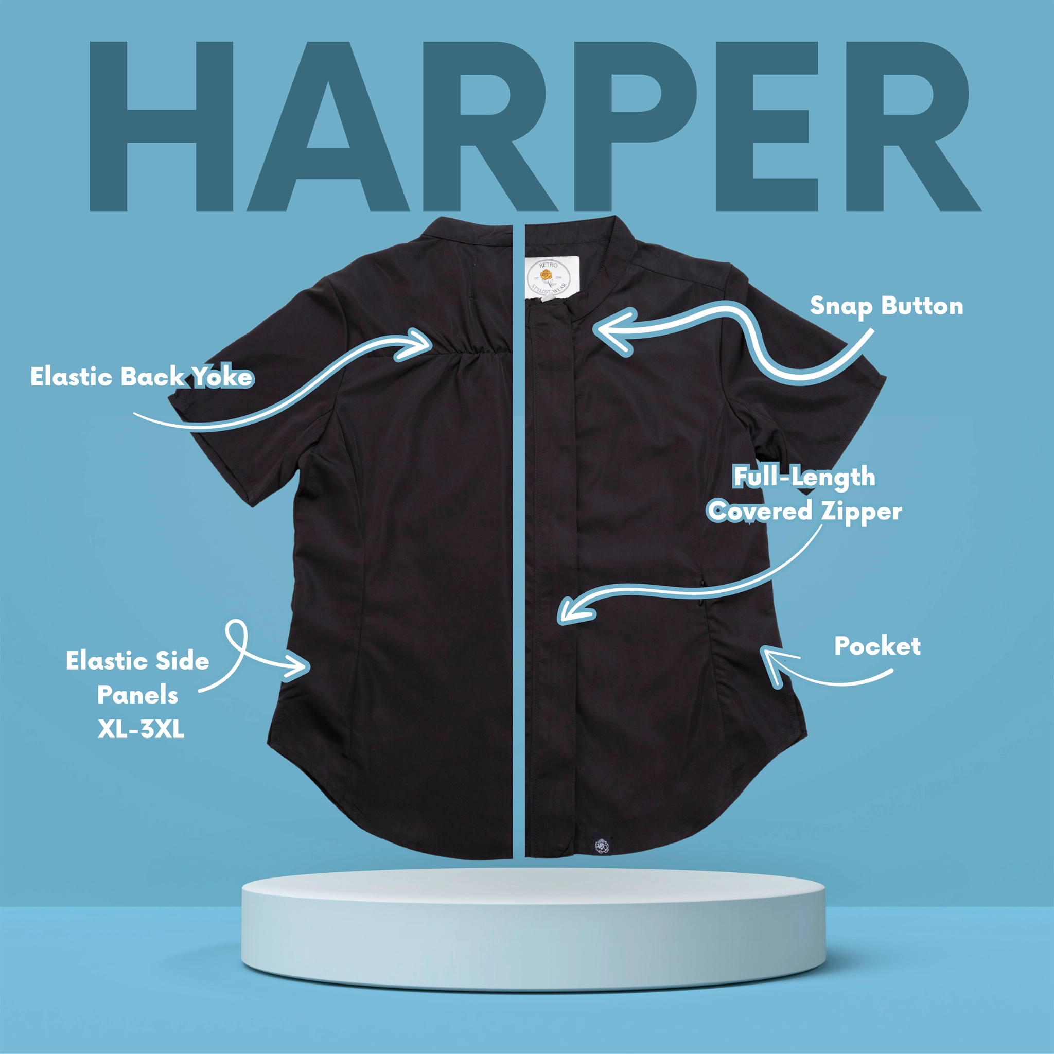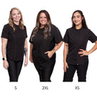Unlike our relaxed fit apparel, the Harper smock is fitted and contours more to your body. Sizes XL-3XL have elastic sides for extra comfort. All measurements listed in our size chart reflect the garment measurements before accounting for stretch.