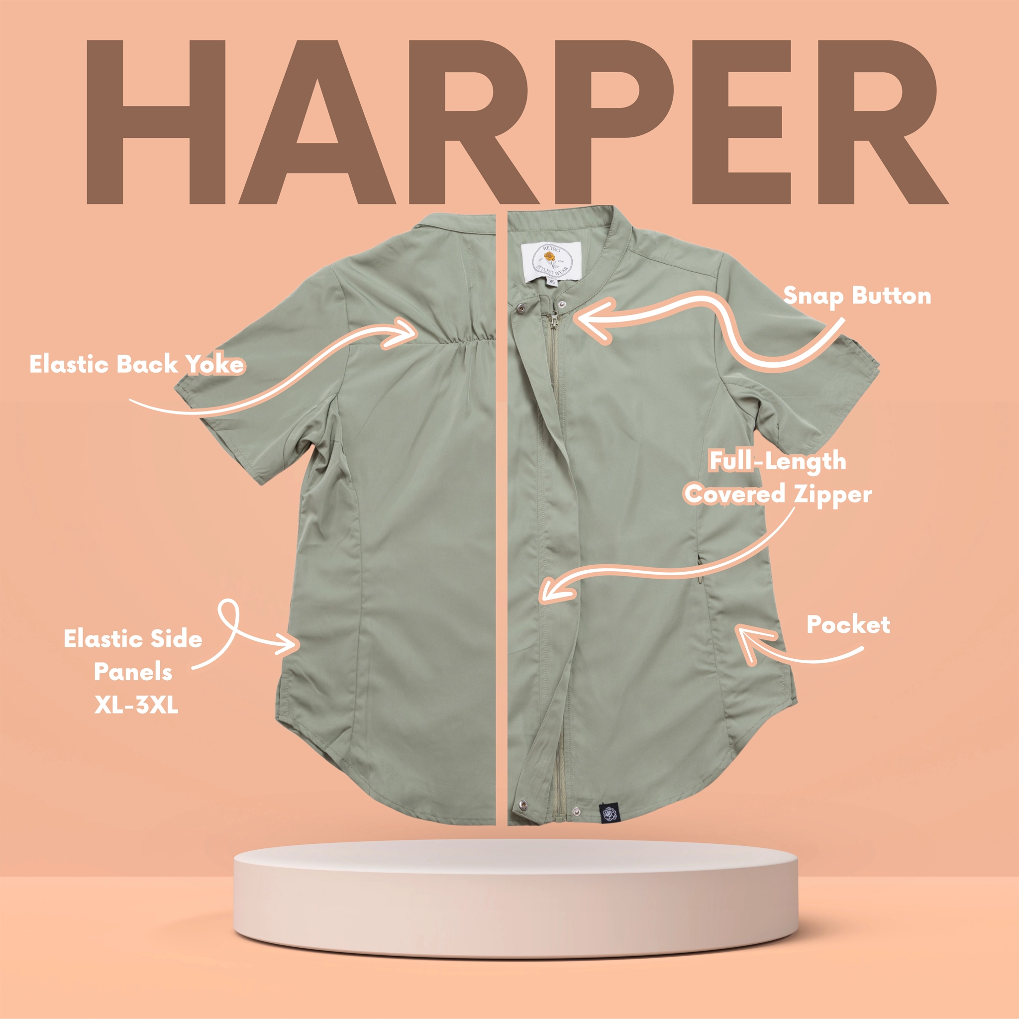 This Harper style offers a tailored silhouette with thoughtful adjustments by size. Sizes XS–L feature solid fabric with subtle side vents at the hips for easy movement. Sizes XL–3XL include elastic stretch side panels that flex with you for comfort and a customized fit. A single zippered pocket on the left keeps essentials secure without bulk. Elastic across the back shoulders enhances range of motion, so you can move effortlessly all day.