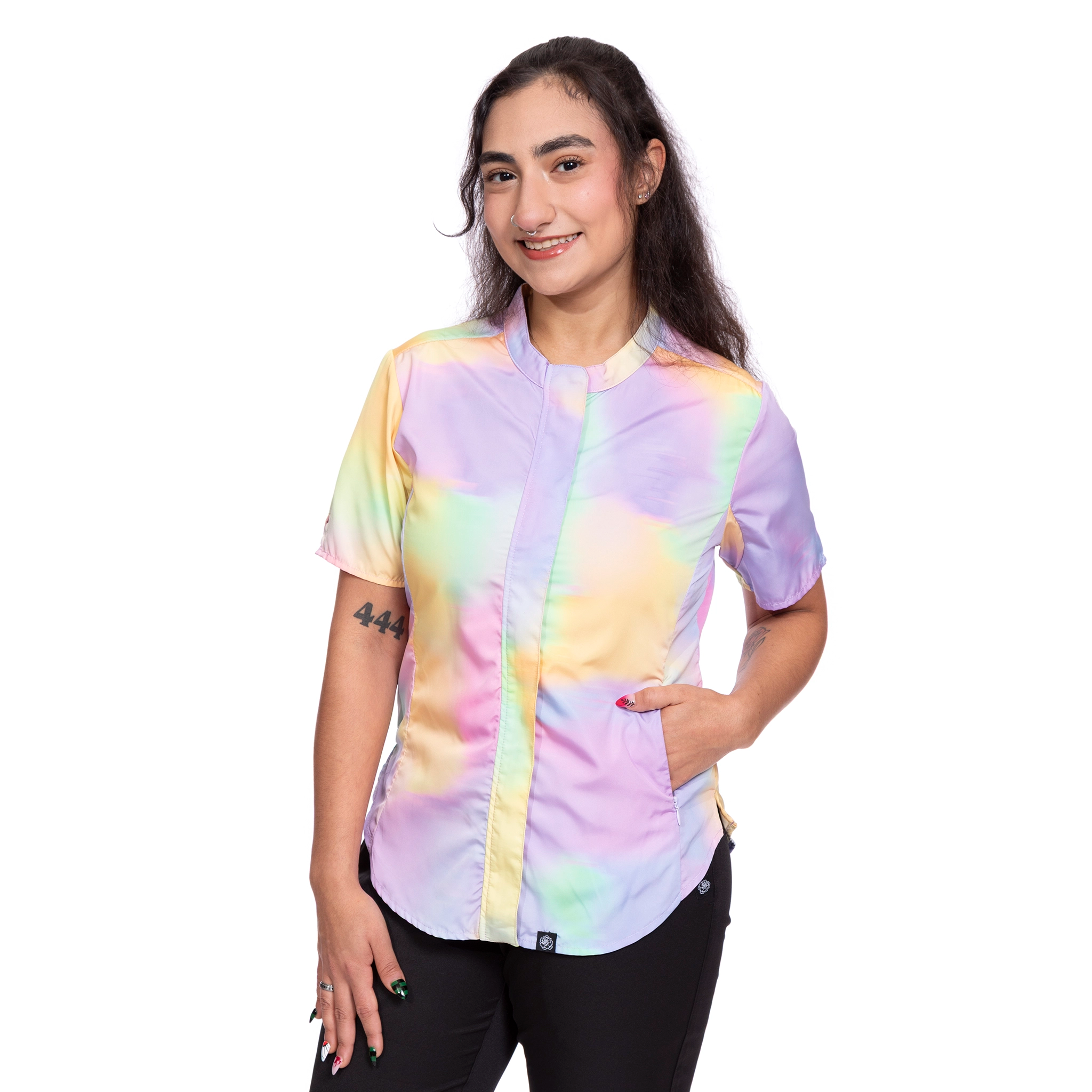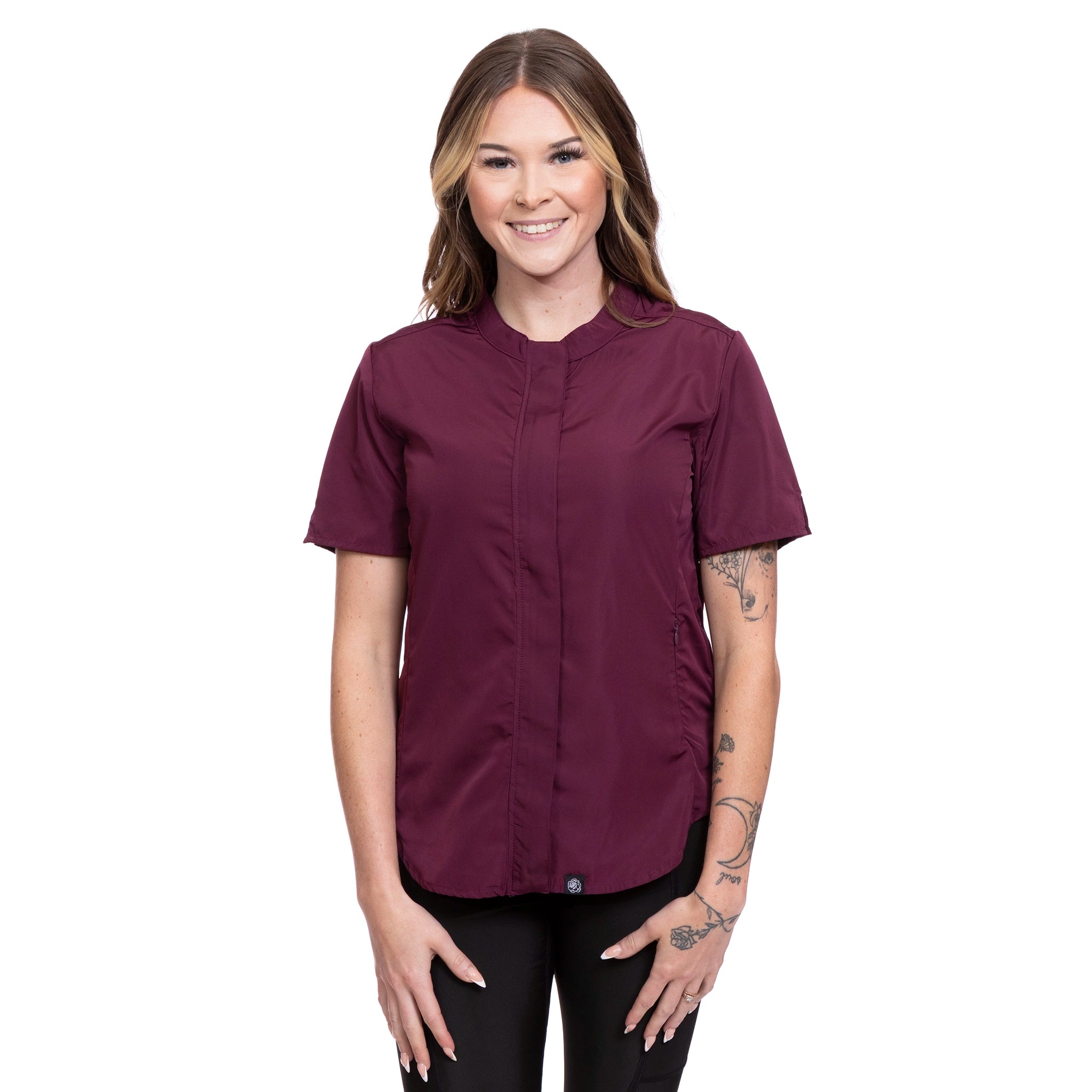 The Harper pet grooming smock: Sleek design featuring a hidden zippered front, polished placket with button closures, short sleeves with notch detail, and a flattering women’s fit.
