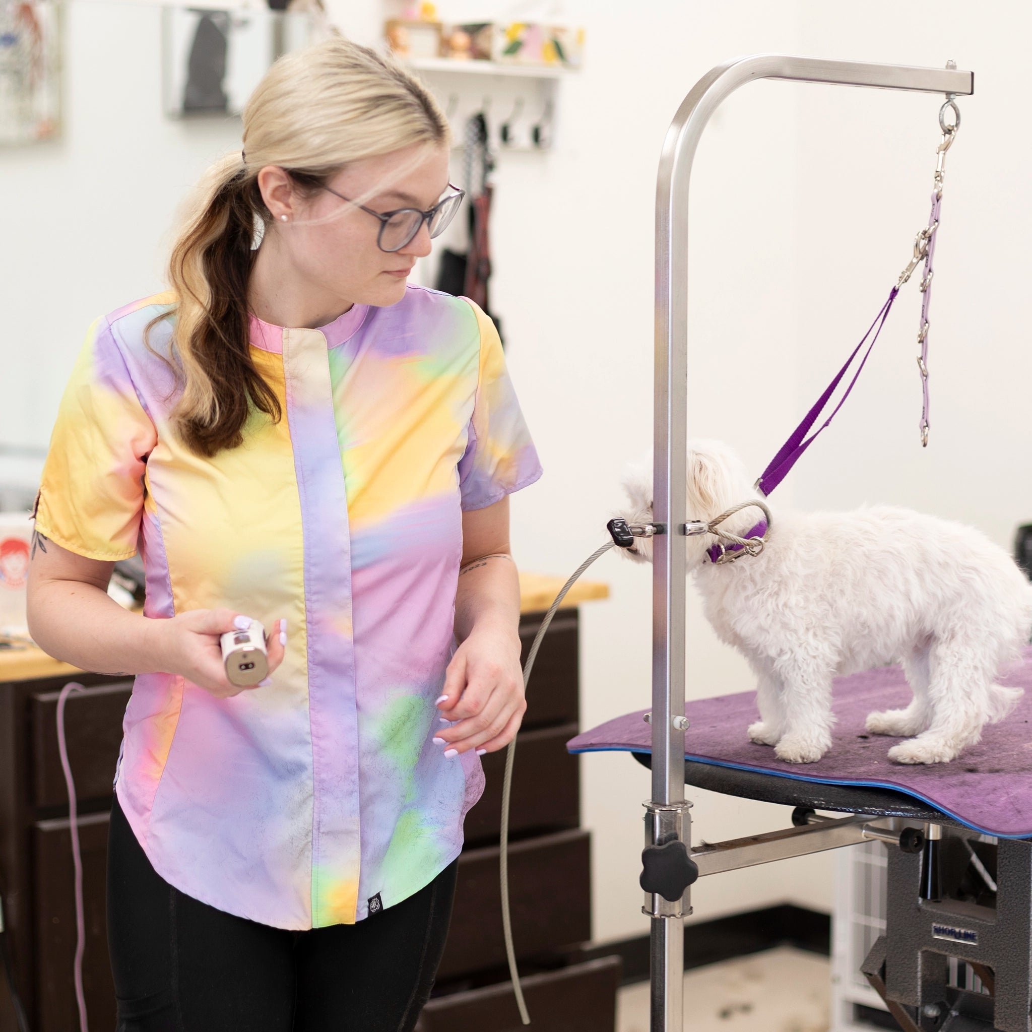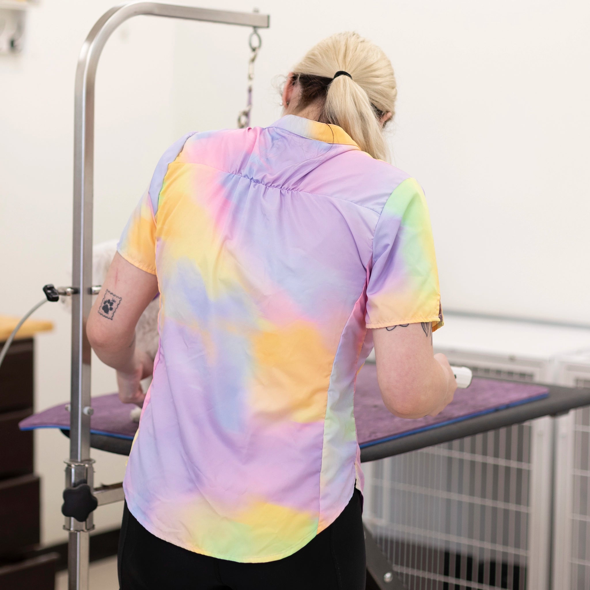 The Harper combines function and finesse with details that move with you—bend, twist, lift, and groom without restriction. The notch sleeve detail adds both style and flexibility, making long grooming days more comfortable.