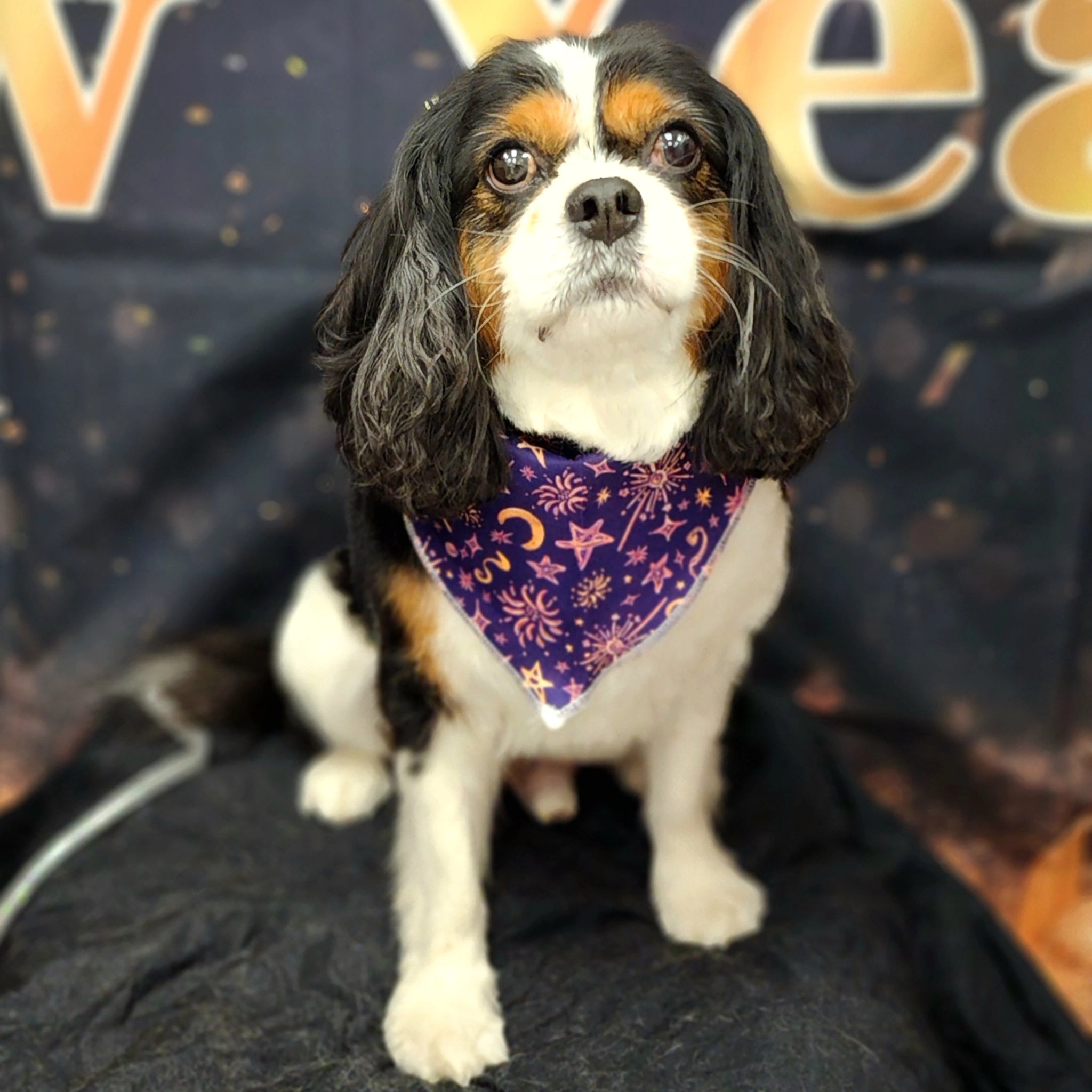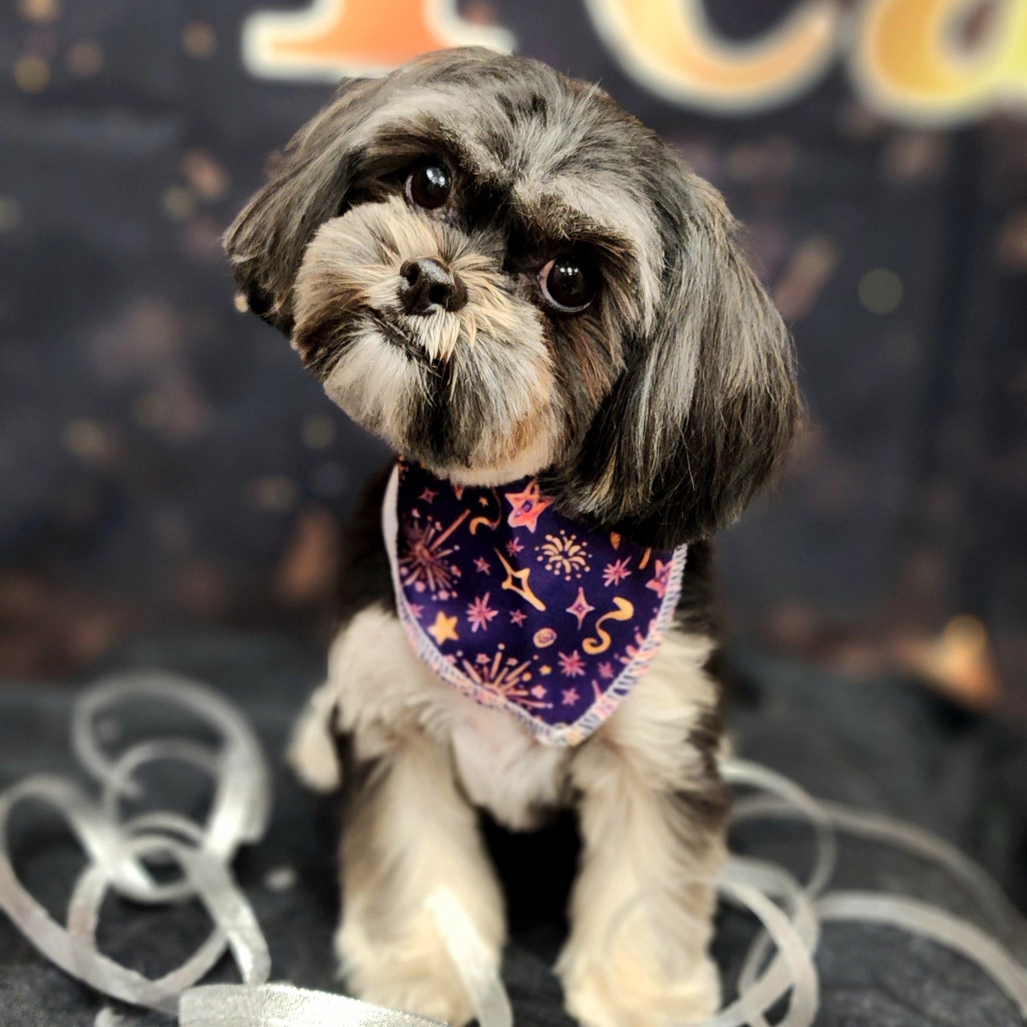 Perfect for milestone moments and seasonal celebrations, this professional dog bandana adds instant impact to the final groom. The New Year’s Starscape print features stars, moons, and firework accents that photograph beautifully and feel special year-round.