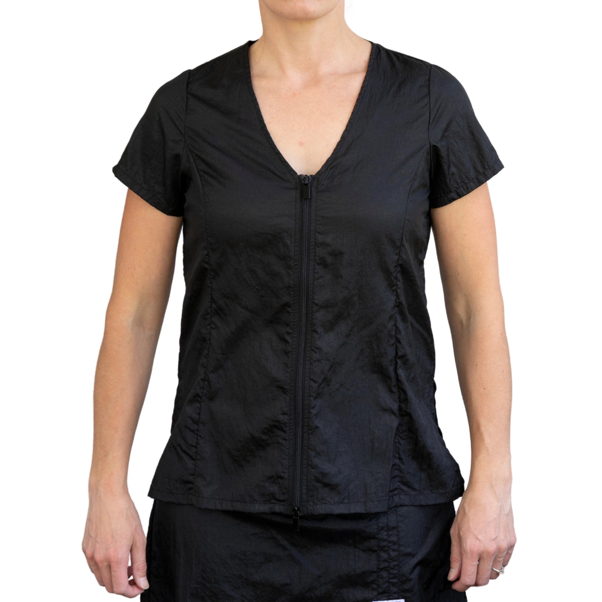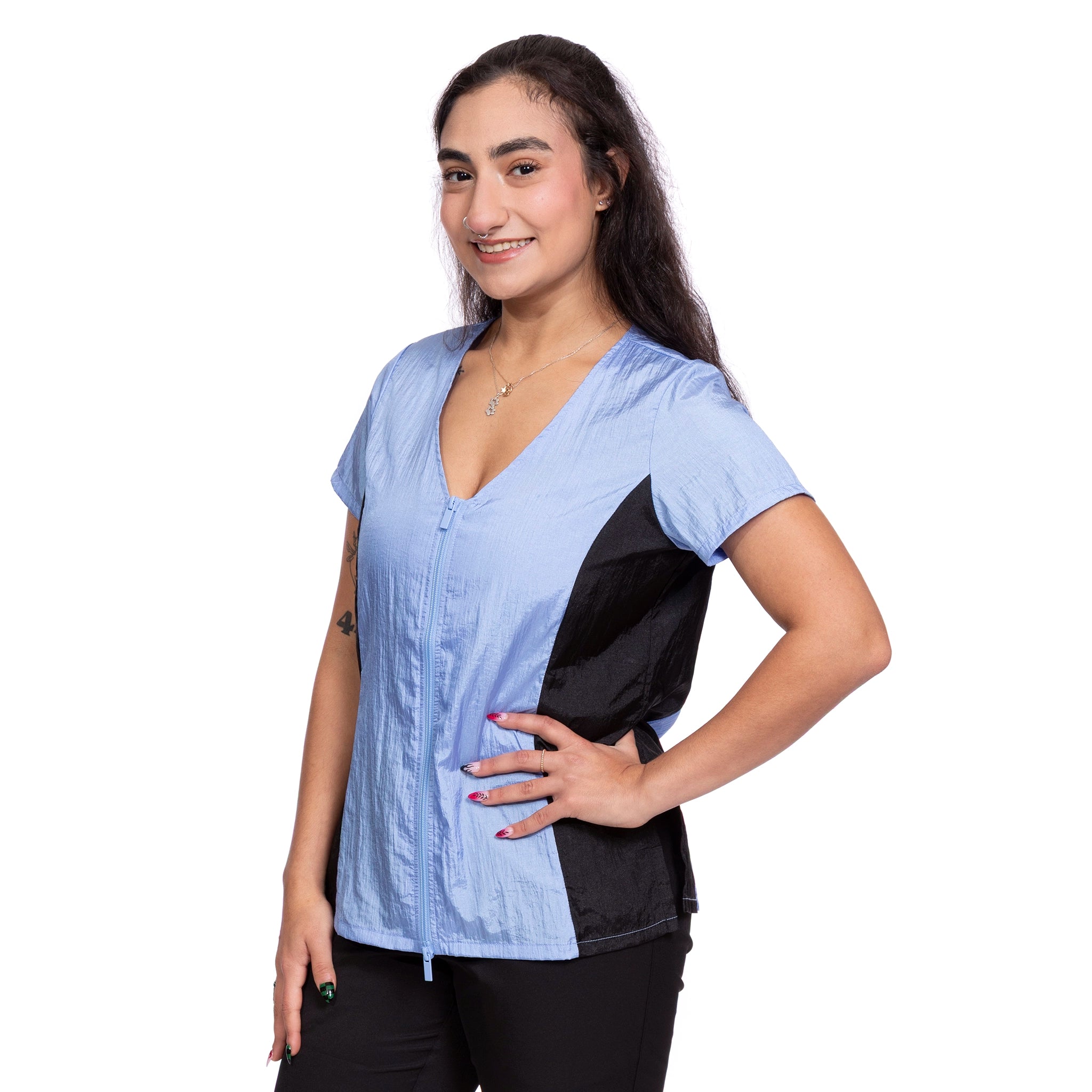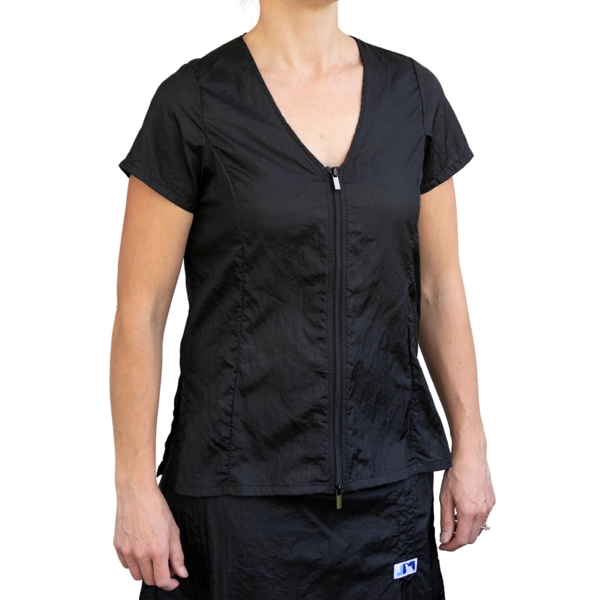 This stylish dog groomer’s top has black panels on the sides that gives a nice slimming look. This top has a full-length double zipper and side slits. This short sleeve pet groomer’s apparel top is slightly fitted with a pleated back for unrestricted movement and comfort. This smock does not have pockets.
