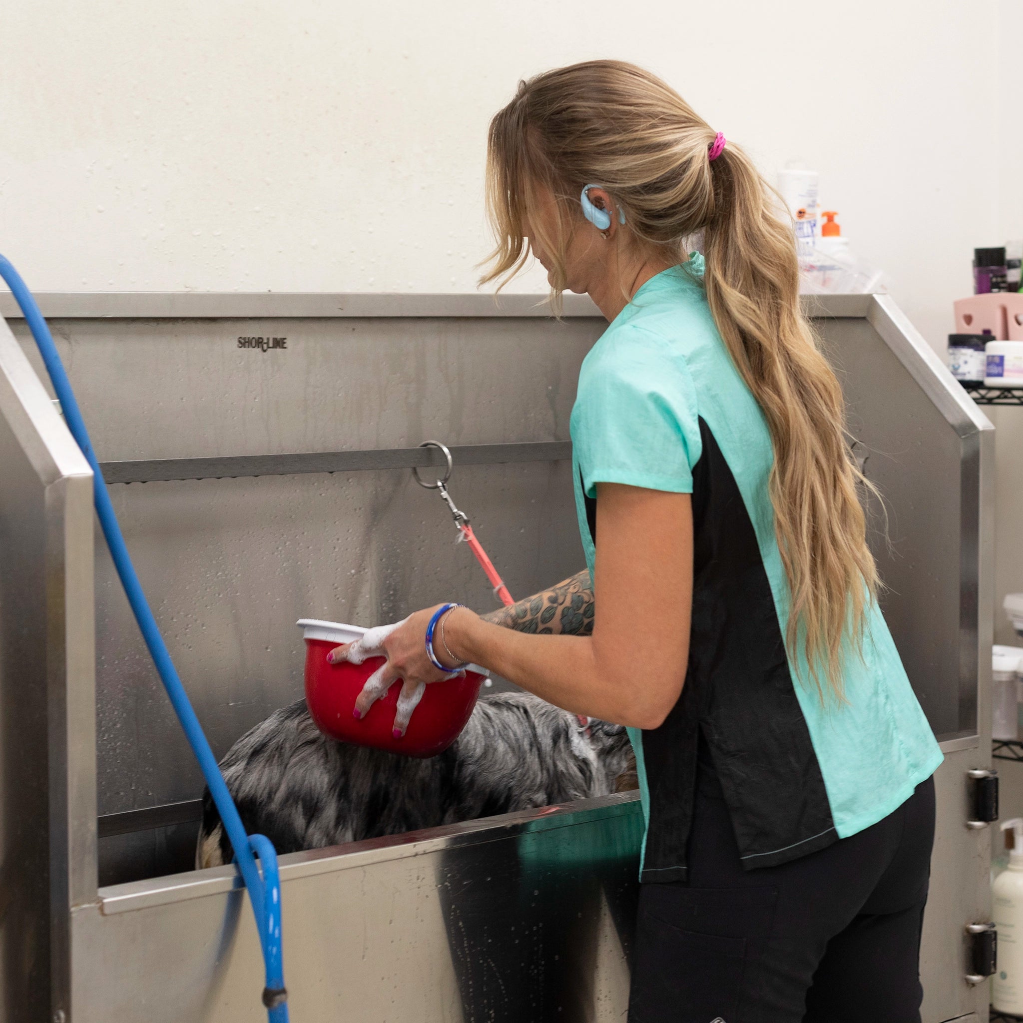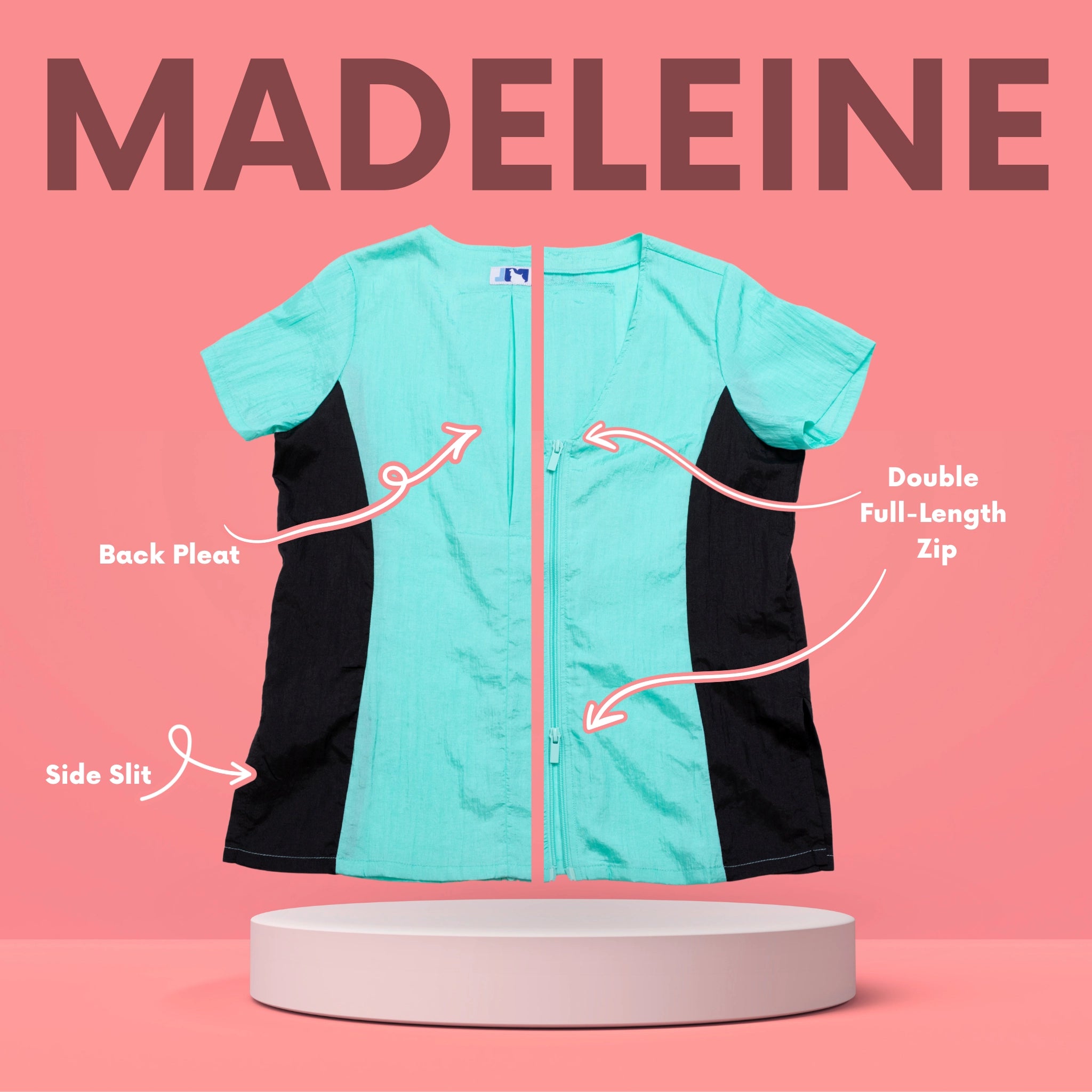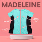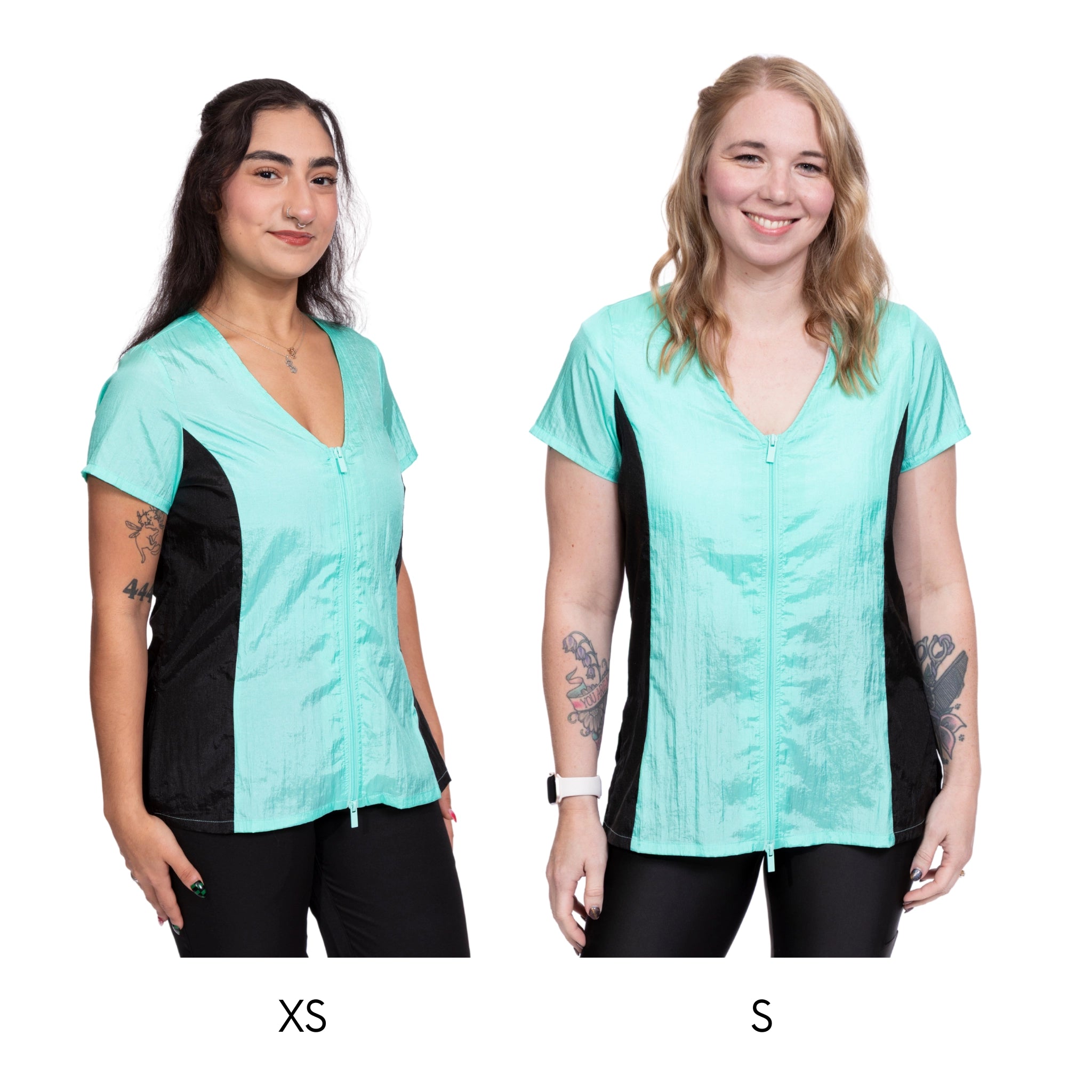 This stylish dog groomer’s top has black panels on the sides that gives a nice slimming look. This top has a full-length double zipper and side slits. This short sleeve pet groomer’s apparel top is slightly fitted with a pleated back for unrestricted movement and comfort. This smock does not have pockets.