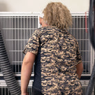 The Harper pet grooming smock: Sleek design featuring a hidden zippered front, polished placket with button closures, short sleeves with notch detail, and a flattering women’s fit.