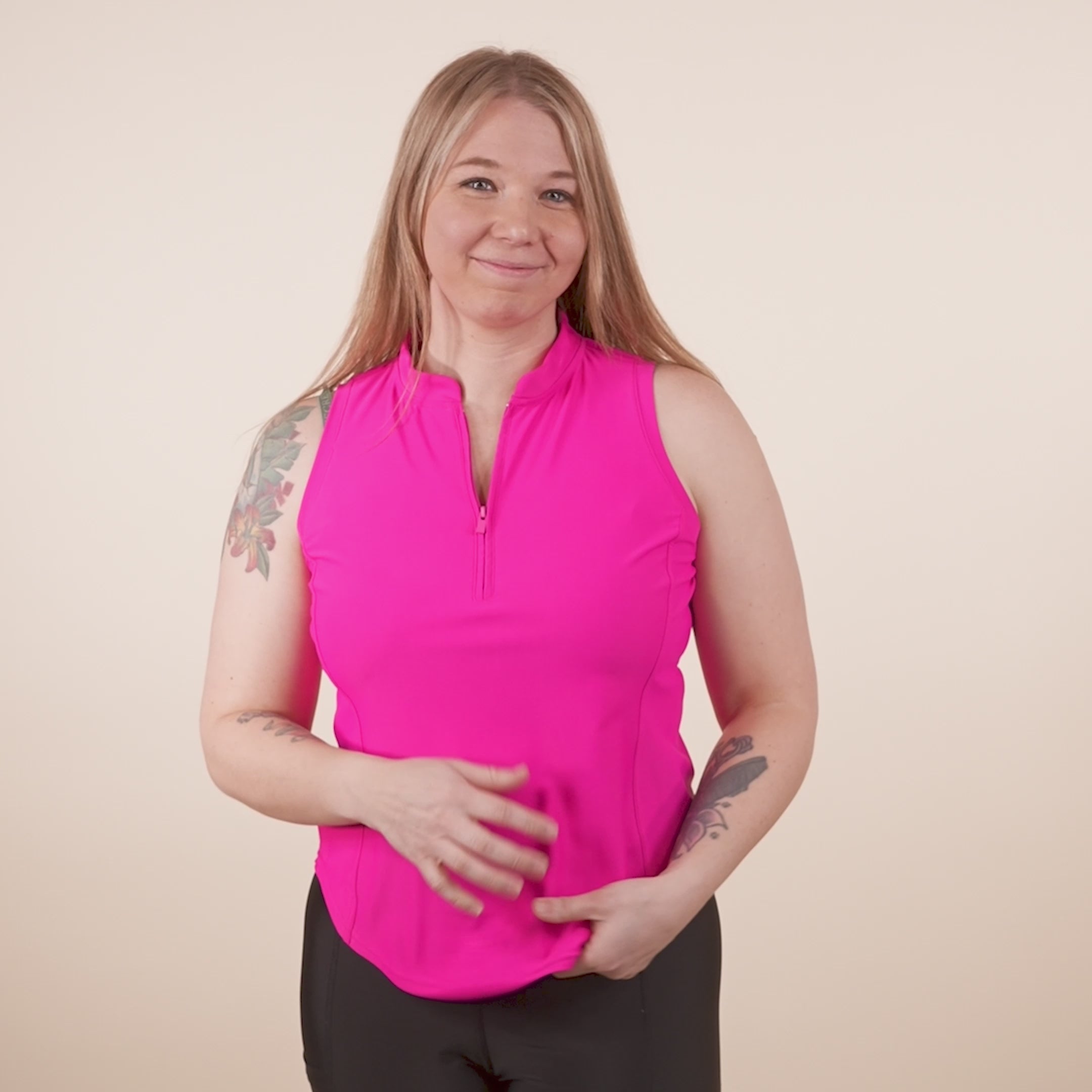 With an athletic sleeveless cut, a curved hem, and a short, fashionable collar, this grooming top offers a modern, fitted silhouette that flatters your professional look. The hidden quarter-zip with a sleek pull adds a polished touch while keeping stray hairs out, blending practicality with effortless style.