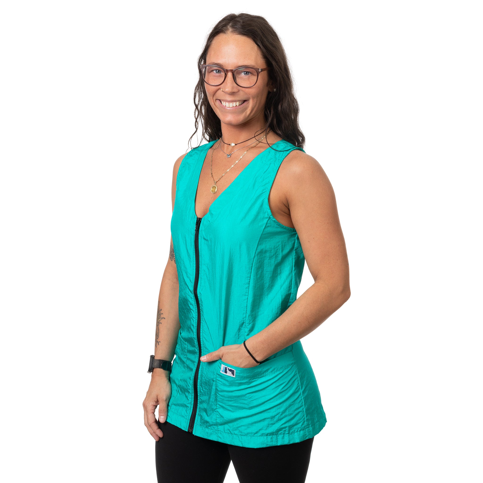 The is a women's sleeveless vest with two roomy front pockets with a “v” neck and full-length zipper. It is a fuller fit yet is very slimming. This vest is very fashionable for the summer months.