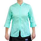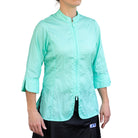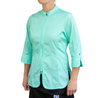 This grooming top features a mandarin-style collar with a three-quarter sleeve and double zipper. Nicely fitted with a pleated back for unrestricted movement and comfort. This top does not have pockets.