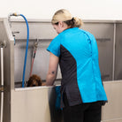 This stylish dog groomer’s top has black panels on the sides that gives a nice slimming look. This top has a full-length zipper as well as hidden side pockets to eliminate animal hair from entering. This short sleeve pet groomer’s apparel top runs true to size and is slightly fitted for a professional appearance.