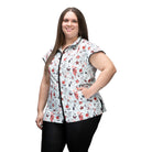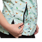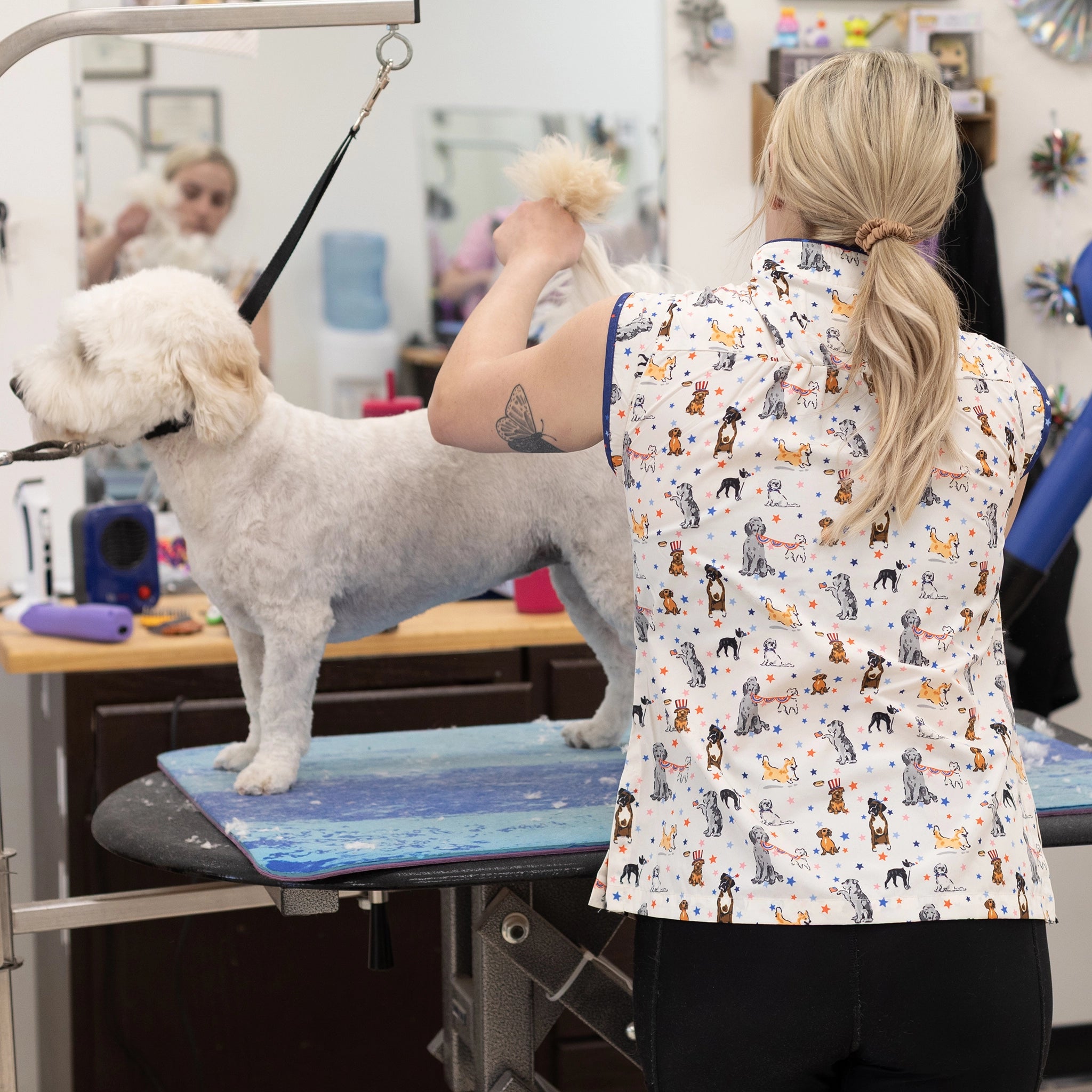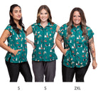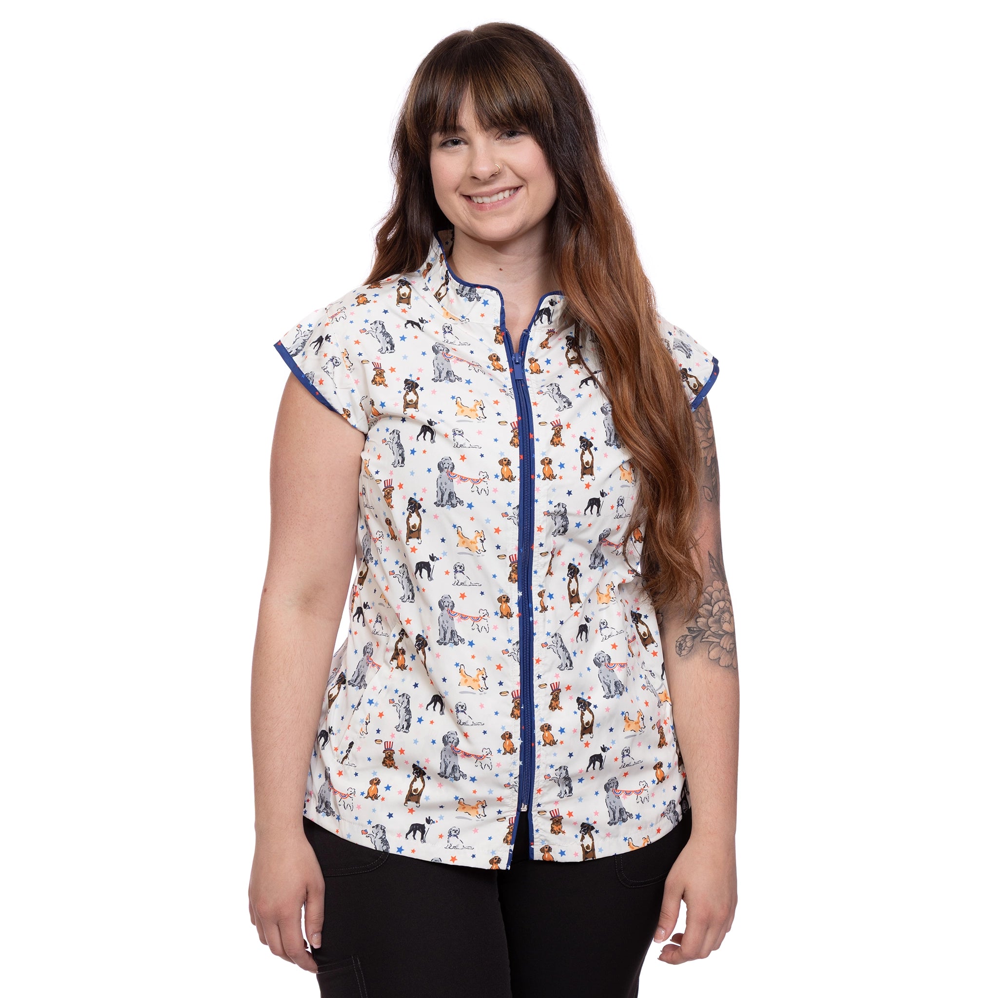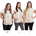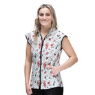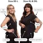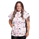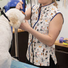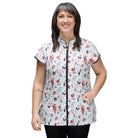 The Sophia pet grooming smock: Fitted design featuring slimming darts, cap sleeves, a polished collar, back yoke and zippered pockets.