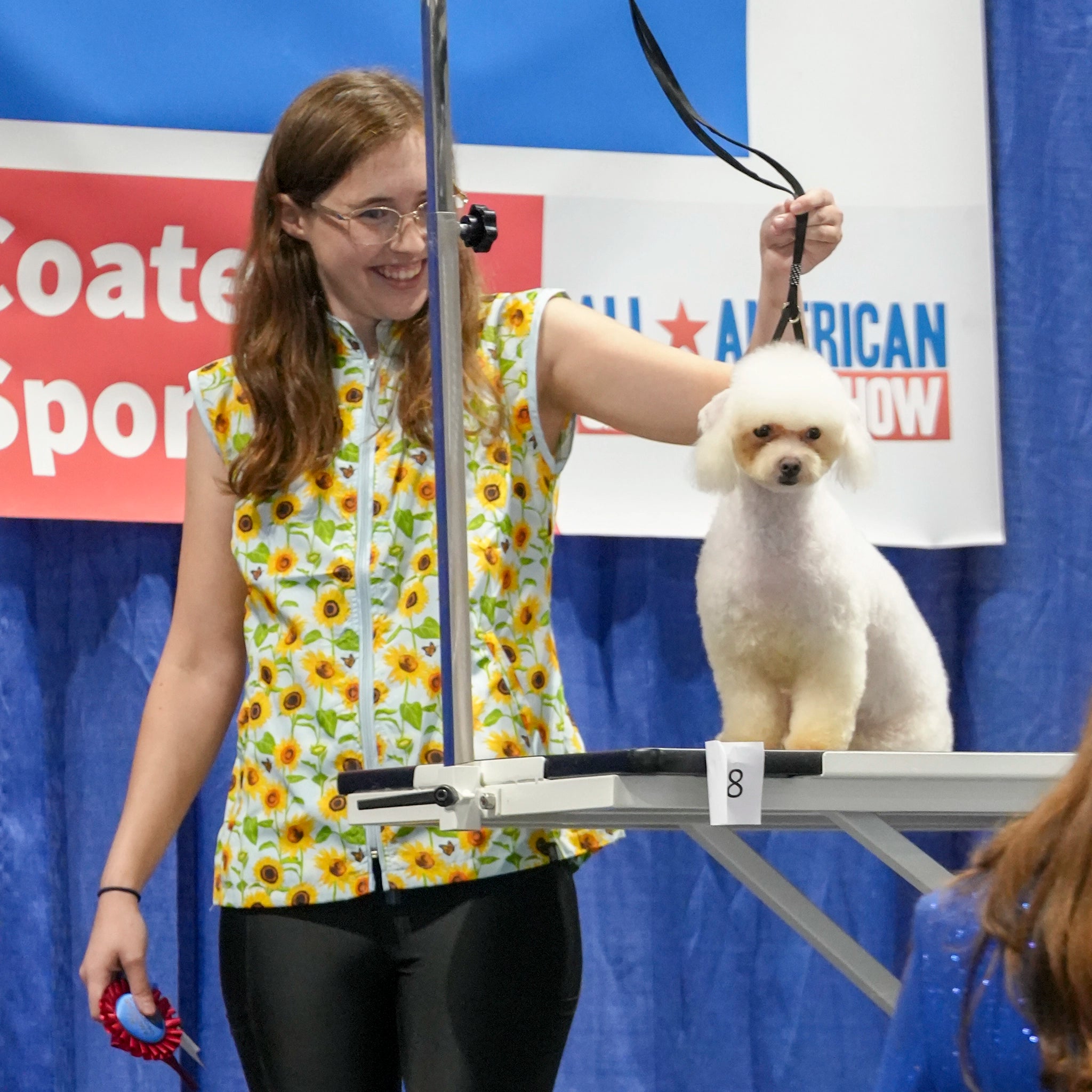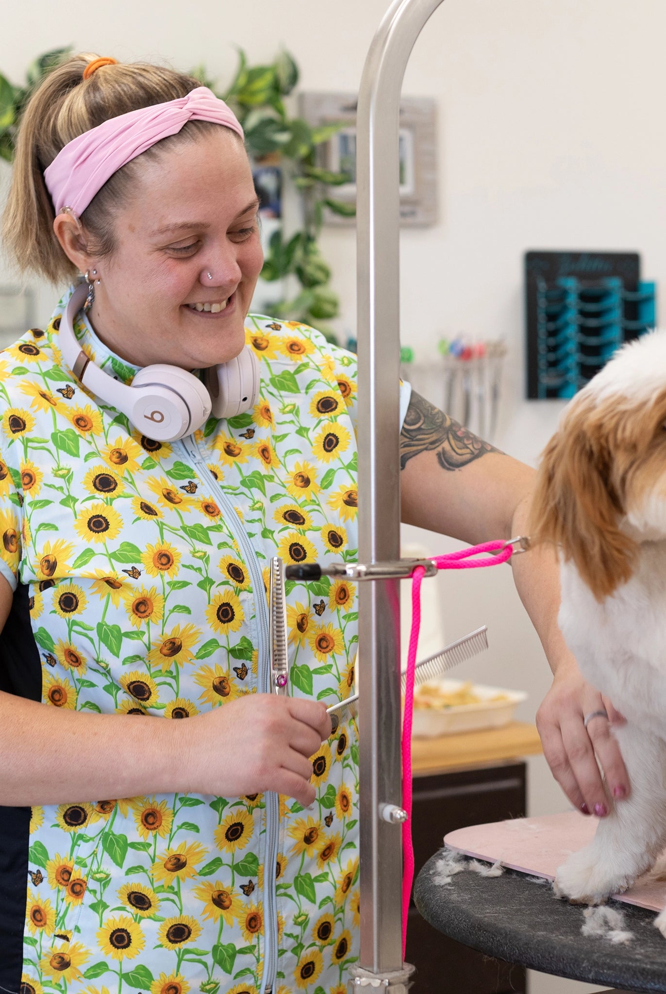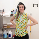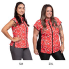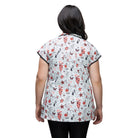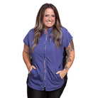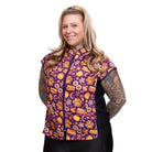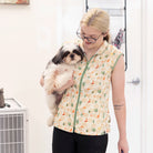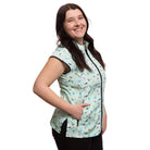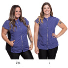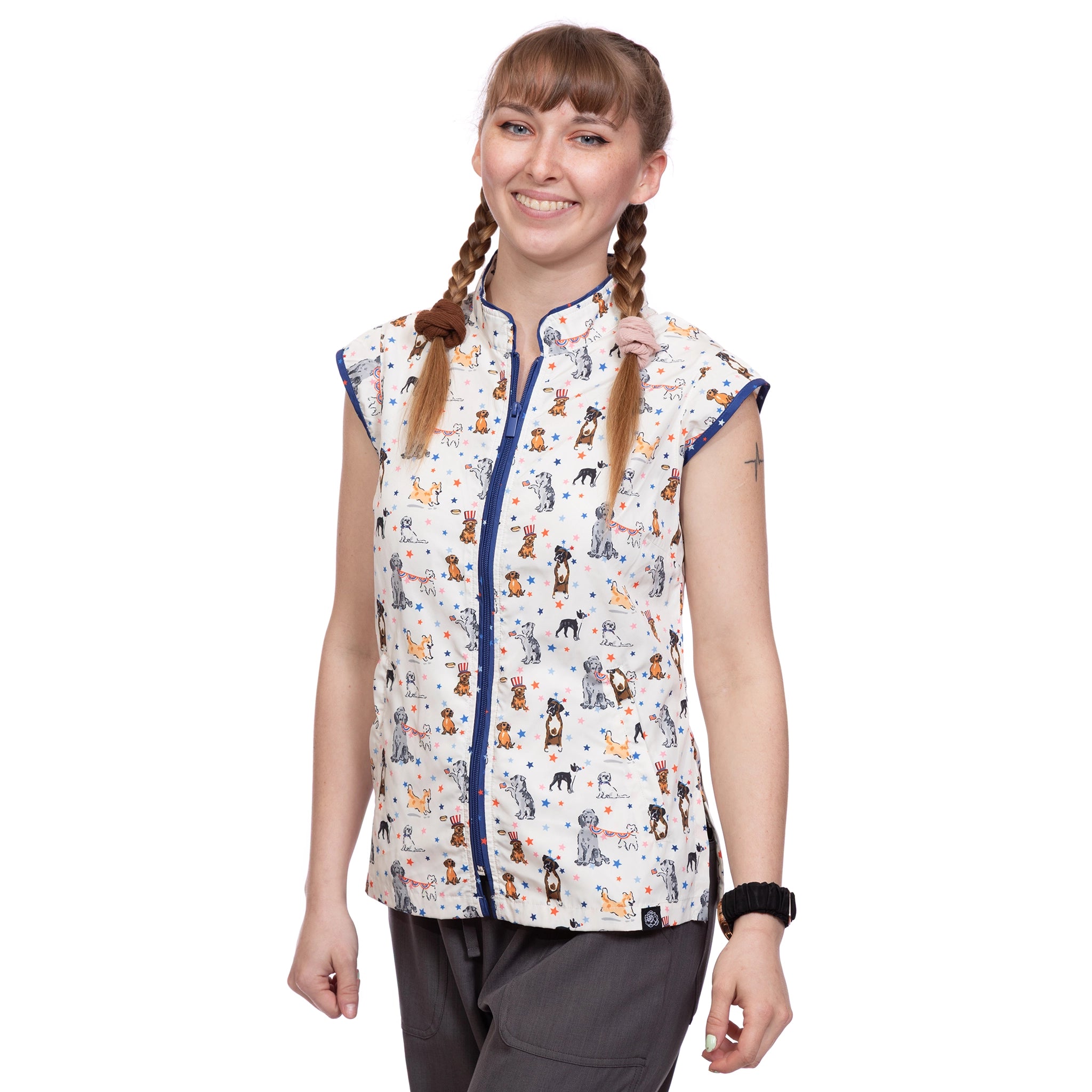 The Sophia pet grooming smock: Fitted design featuring slimming darts, cap sleeves, a polished collar, back yoke and zippered pockets.