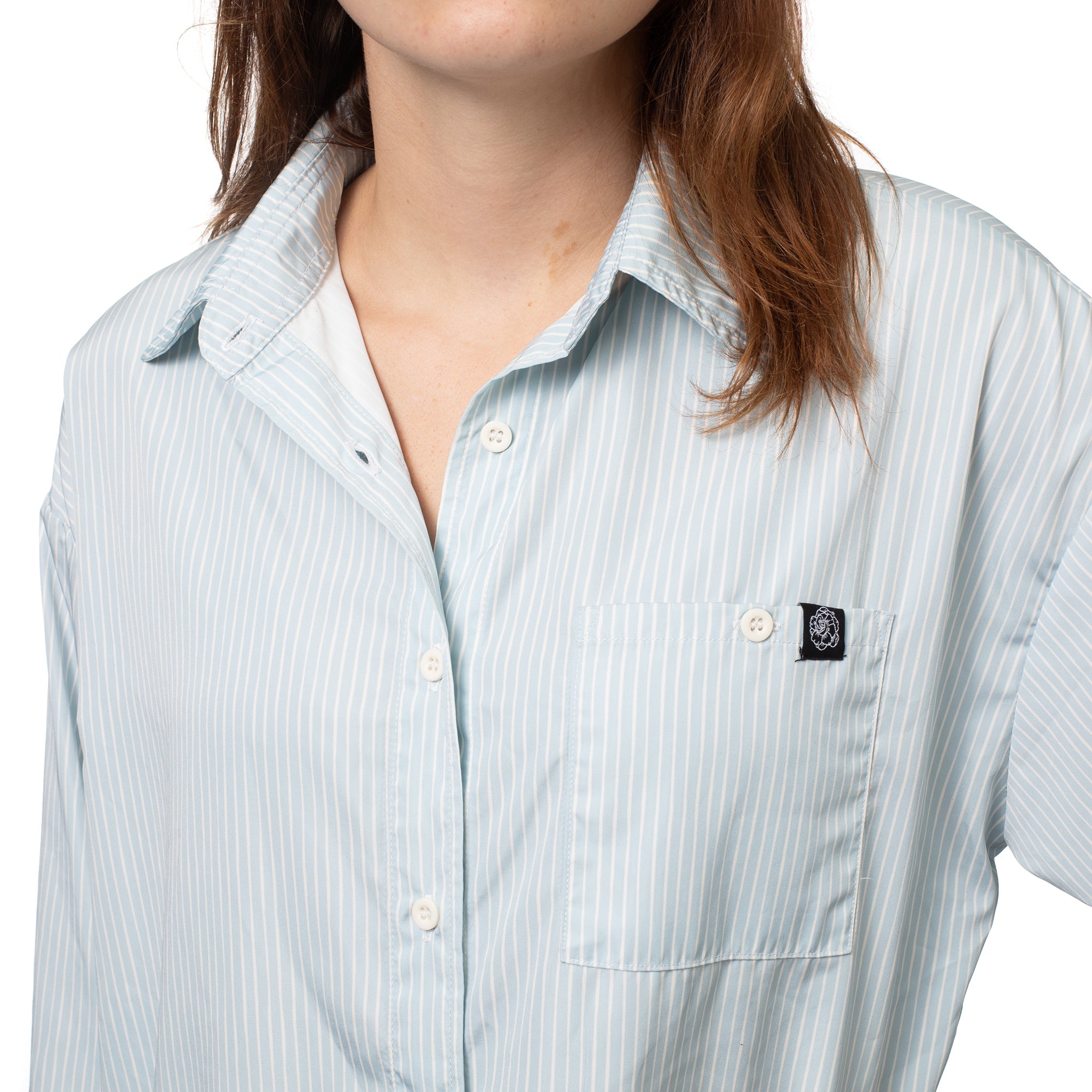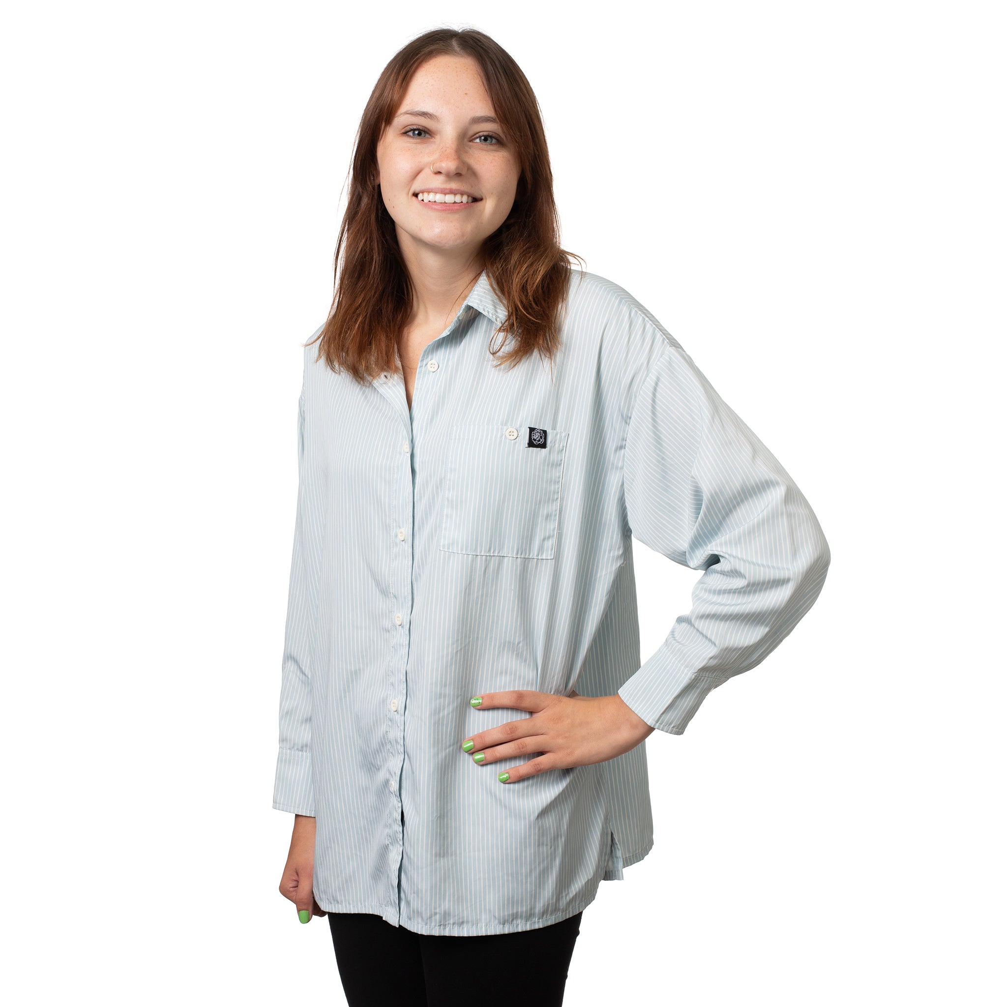 This oversized top is a water-resistant, hair-resistant unisex smock with long-sleeves, buttons & collar. Wear loose, tucked in, or tied in front. Wear sleeves down or rolled up. Great for both female groomers & male groomers!