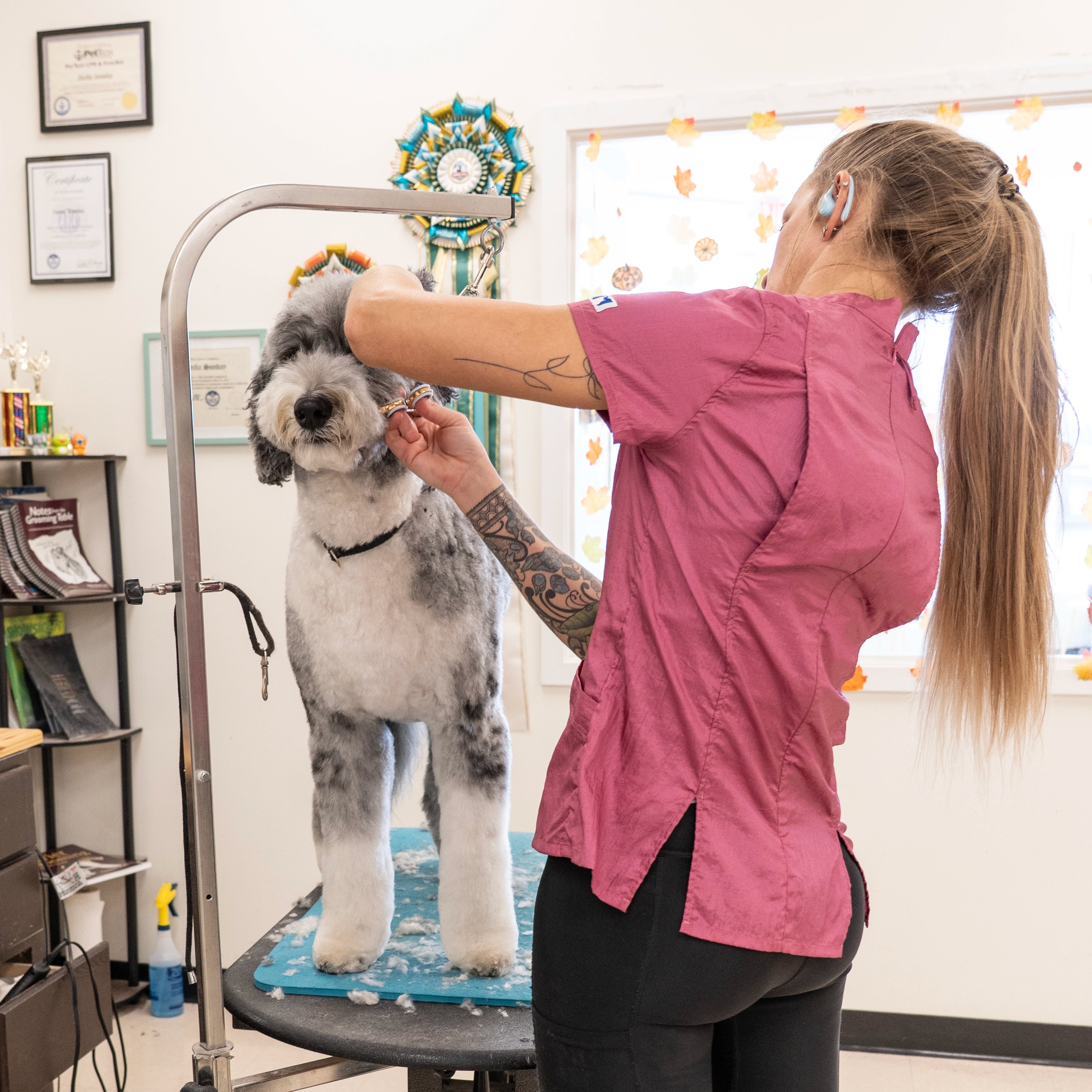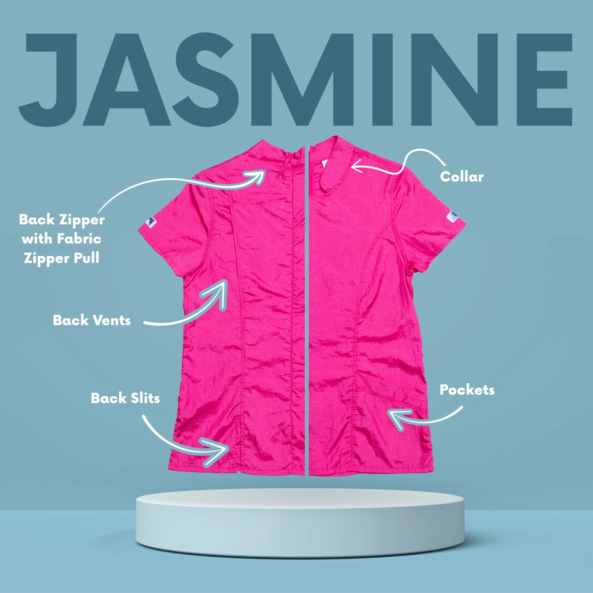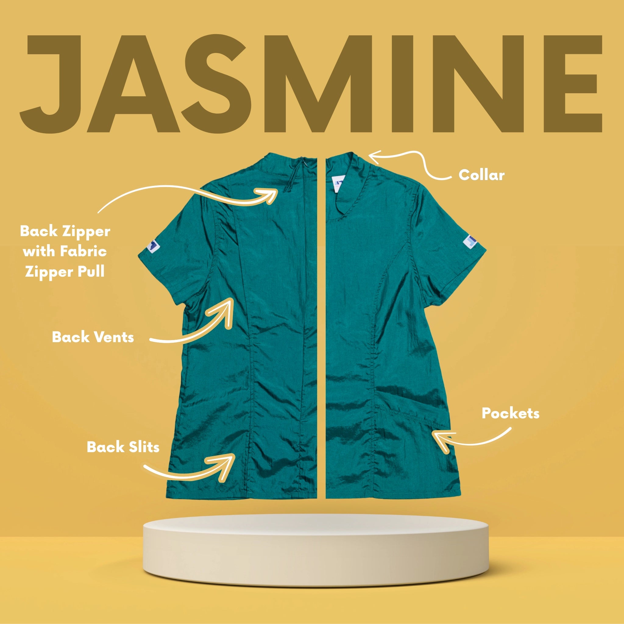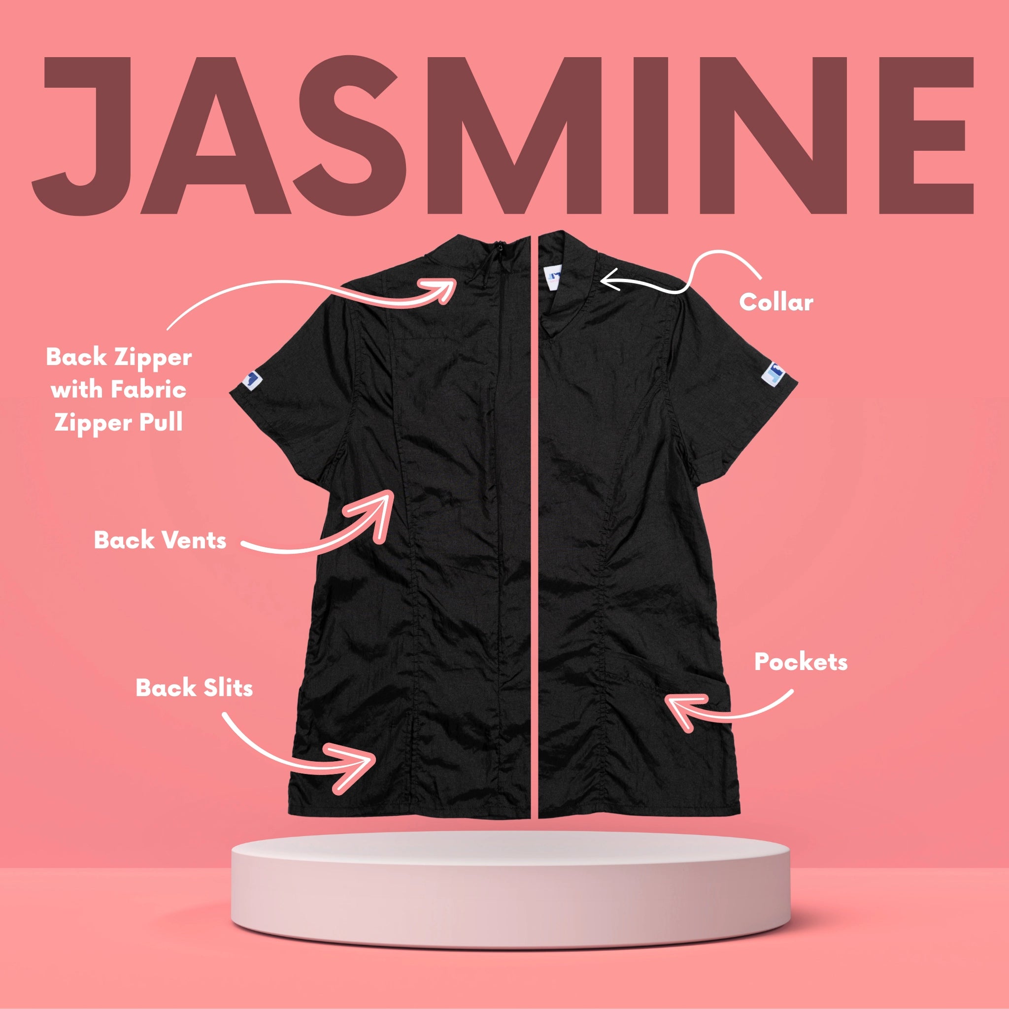 Designed for the modern groomer who values style as much as performance, the Jasmine features a high neckline, clean lines, and a bold zip-back closure for a polished, fashion-forward look that stands out in the salon. Crafted from our signature hair-resistant, lightweight nylon, it keeps you cool, comfortable, and fur-free all day long.
