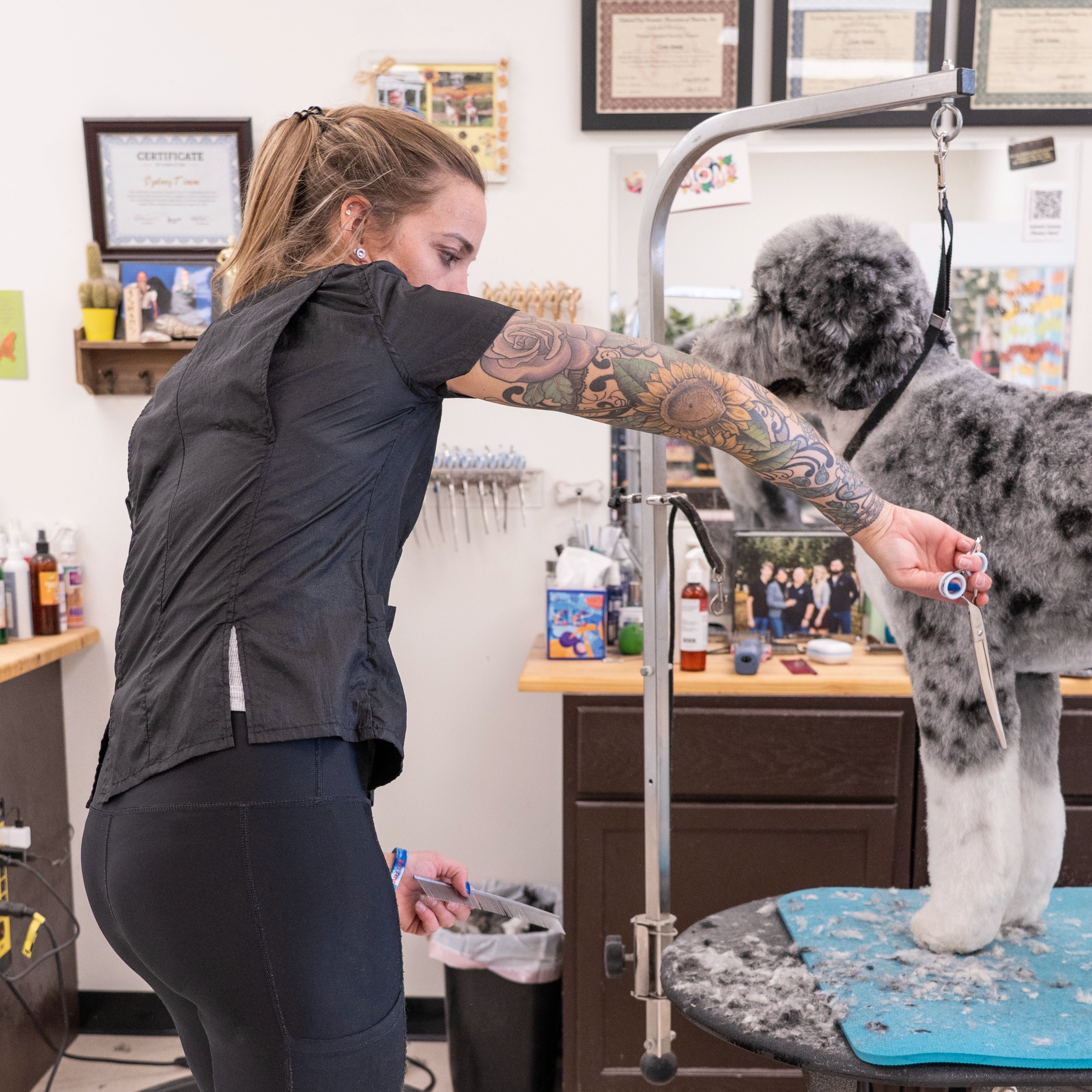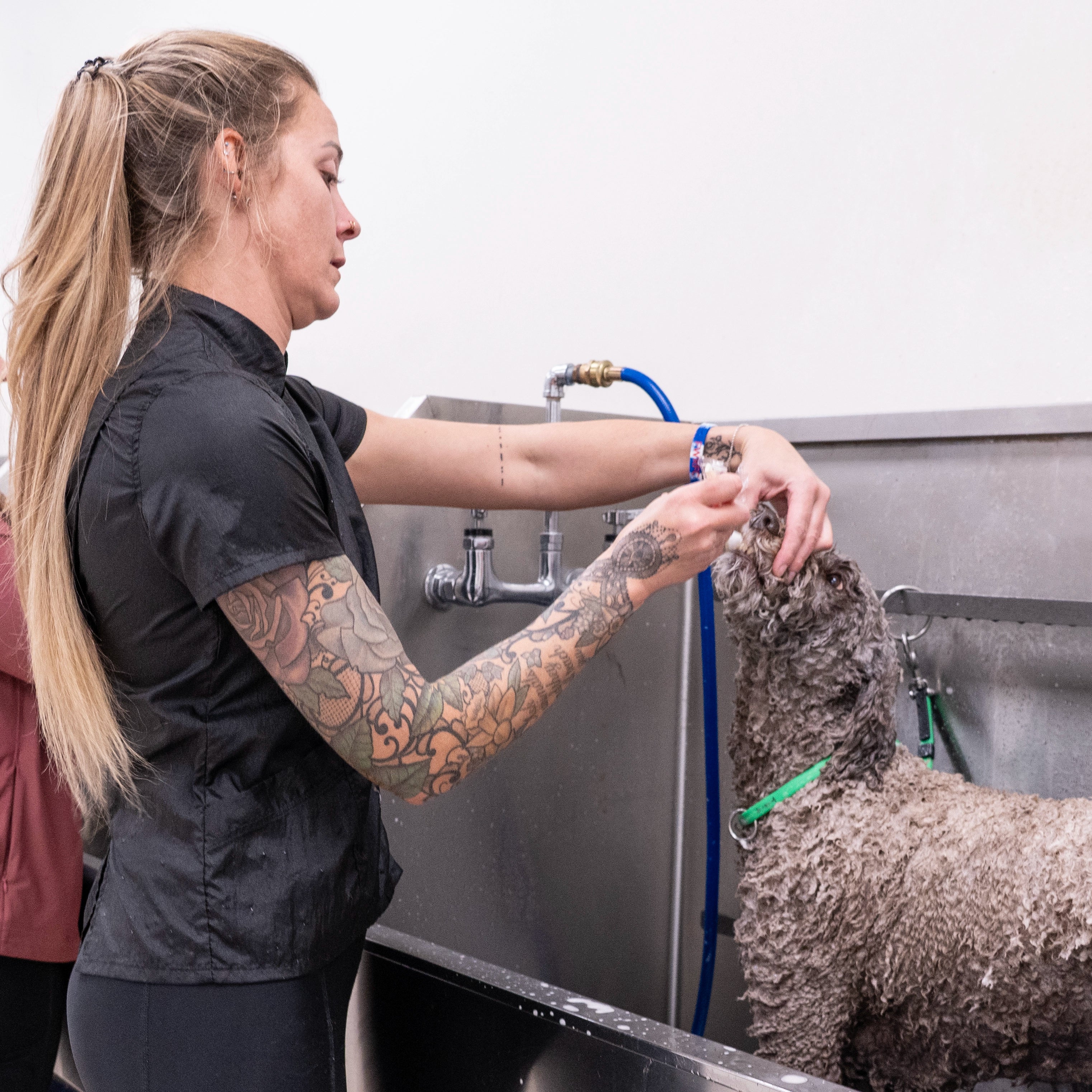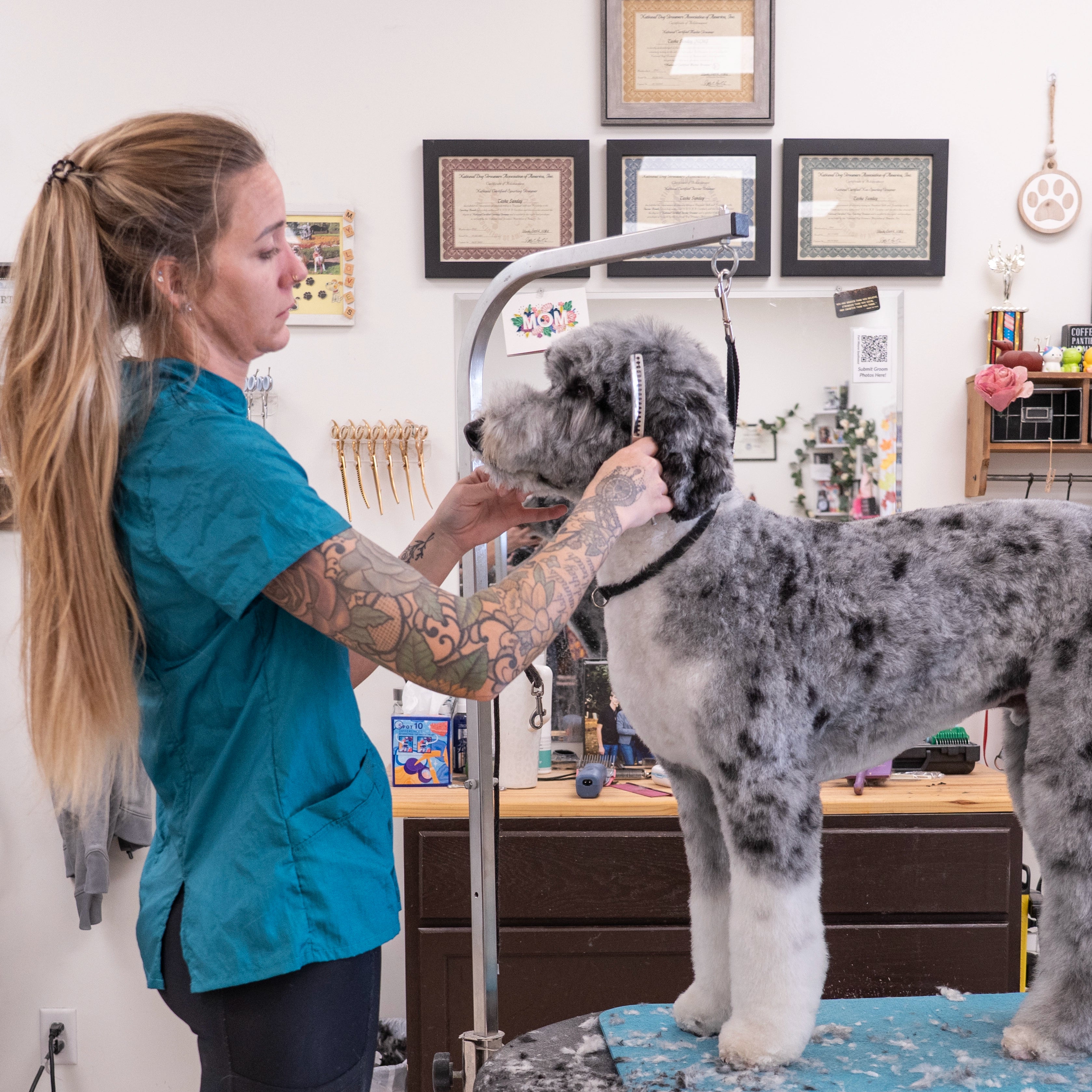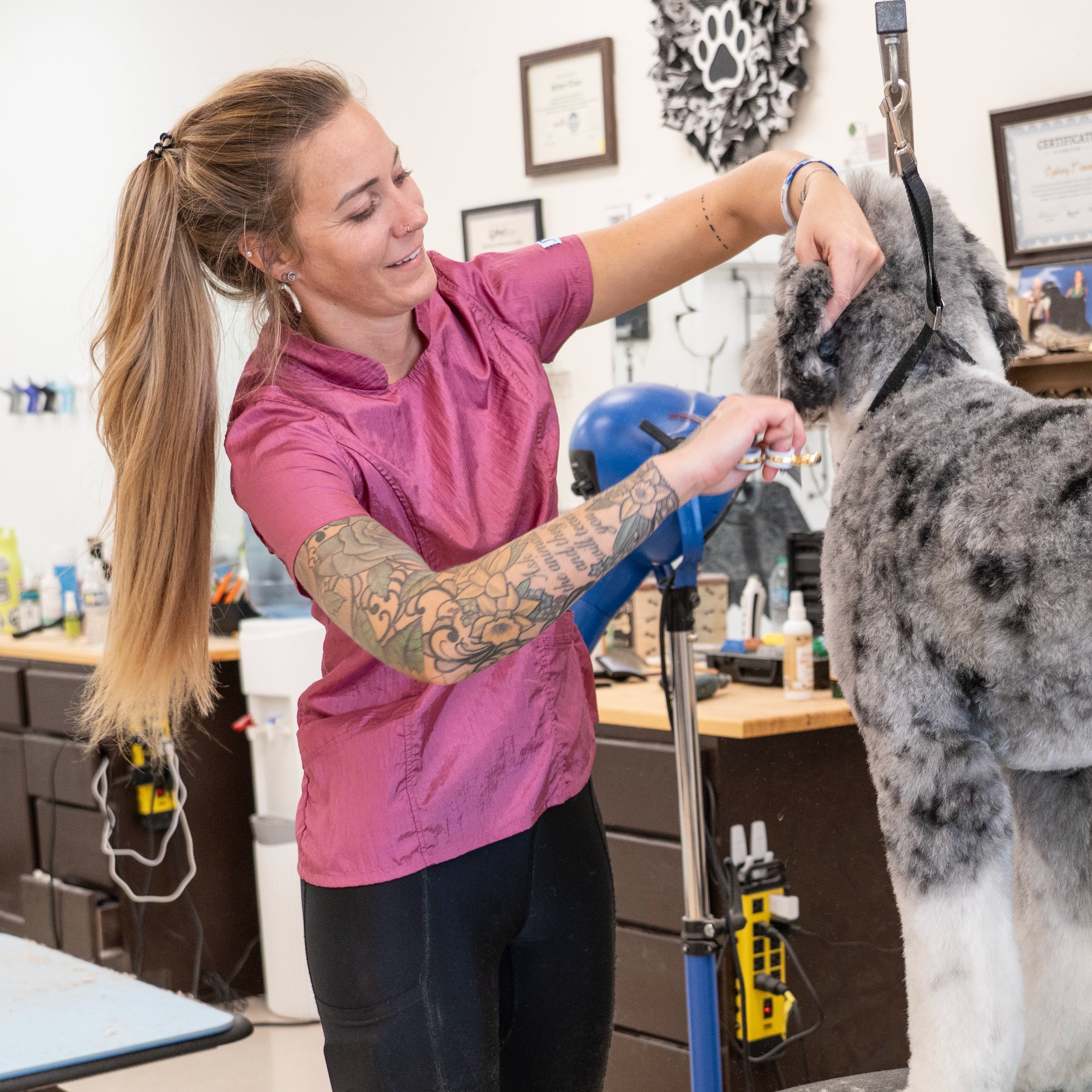 Designed for the modern groomer who values style as much as performance, the Jasmine features a high neckline, clean lines, and a bold zip-back closure for a polished, fashion-forward look that stands out in the salon. Crafted from our signature hair-resistant, lightweight nylon, it keeps you cool, comfortable, and fur-free all day long.