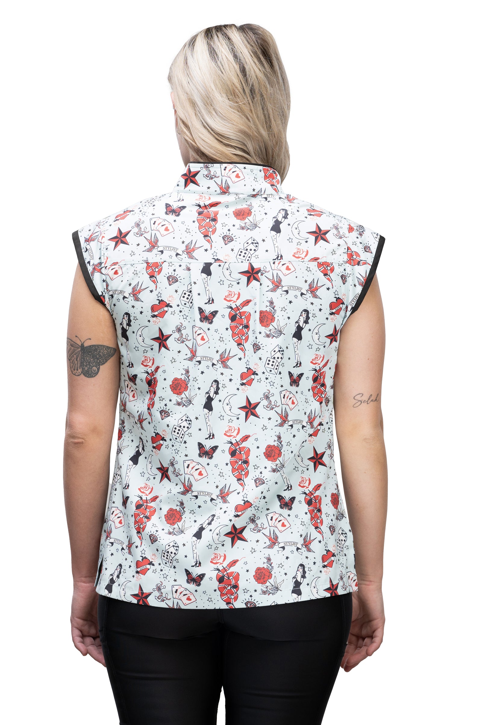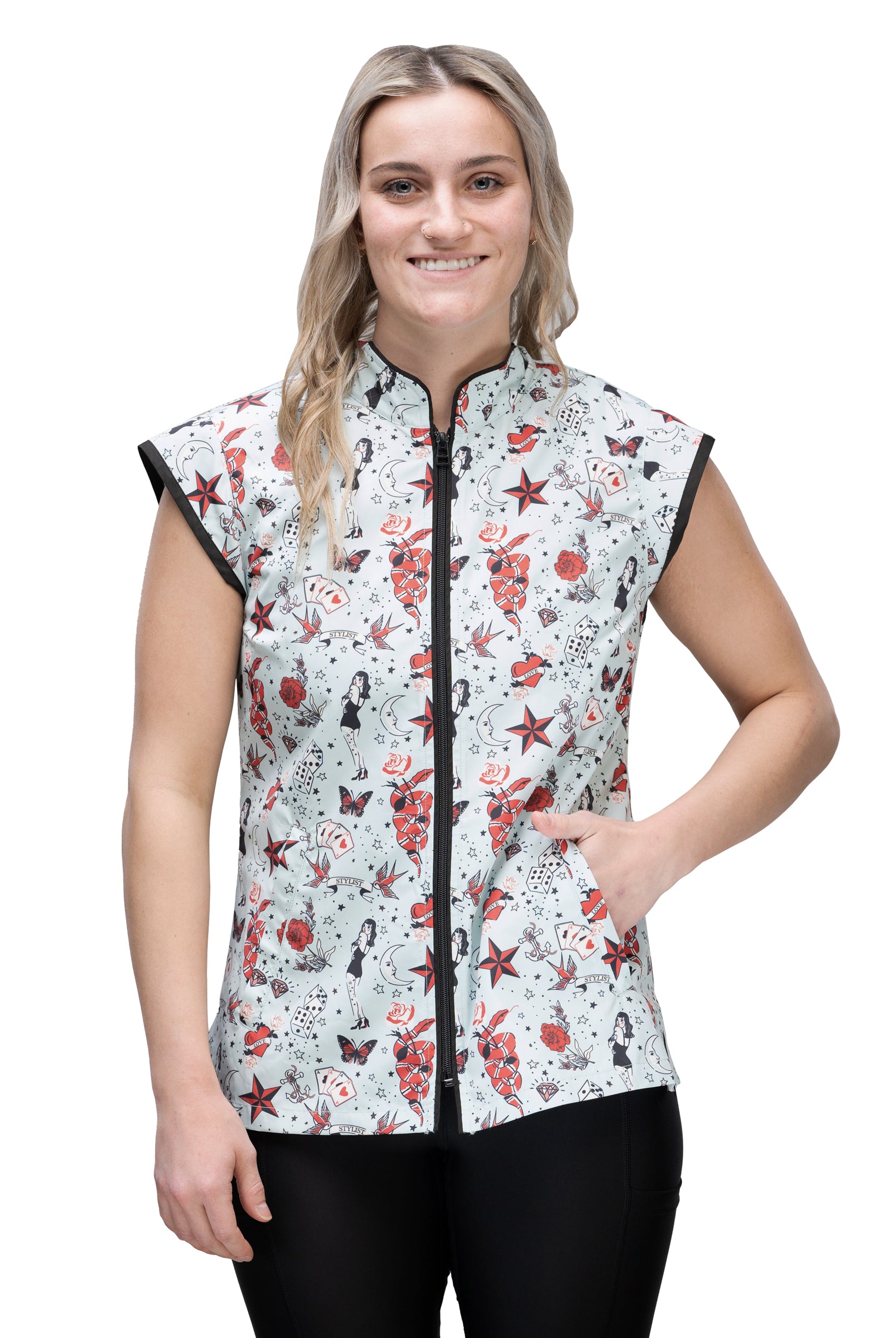 The Sophia pet grooming smock: Fitted design featuring slimming darts, cap sleeves, a polished collar and zippered pockets.