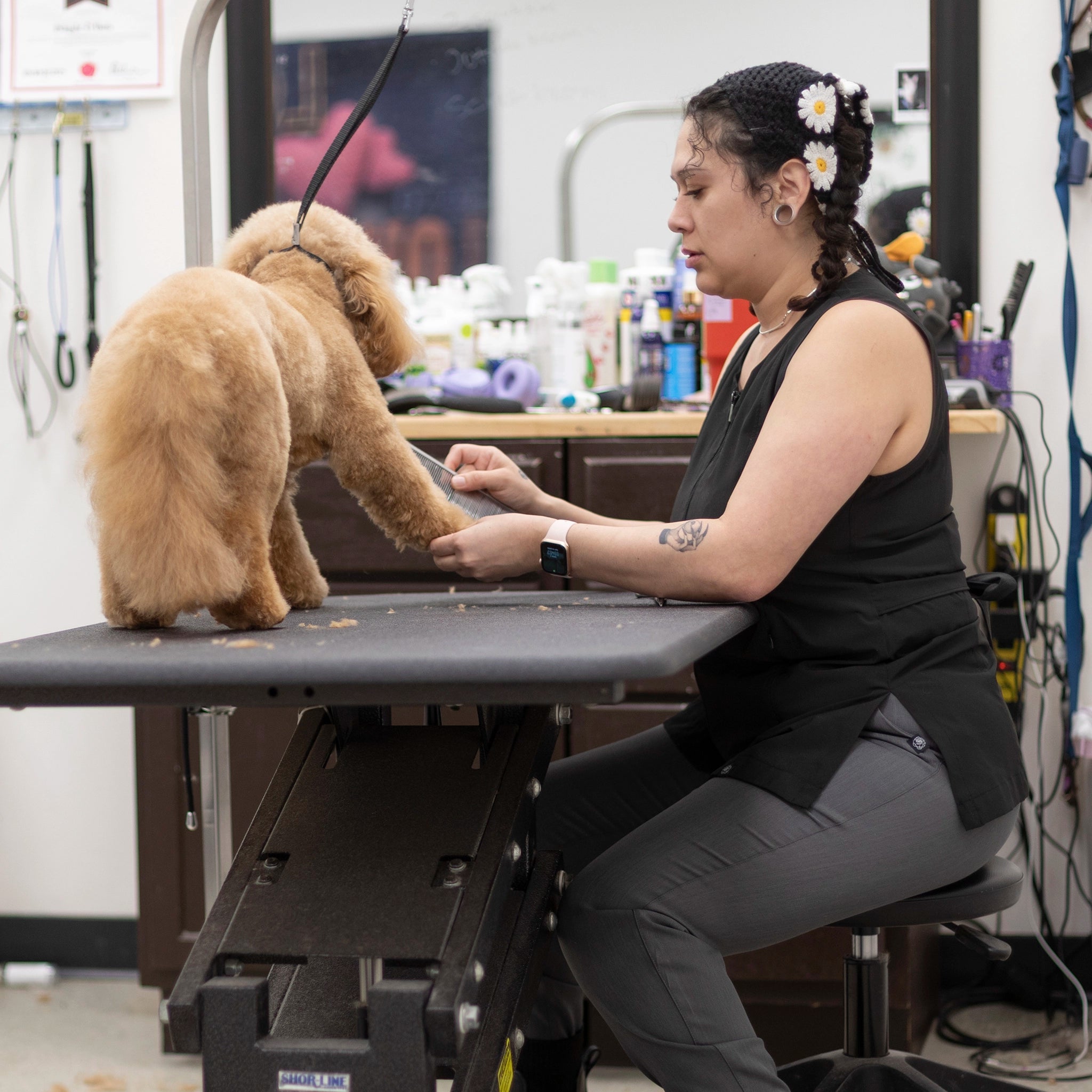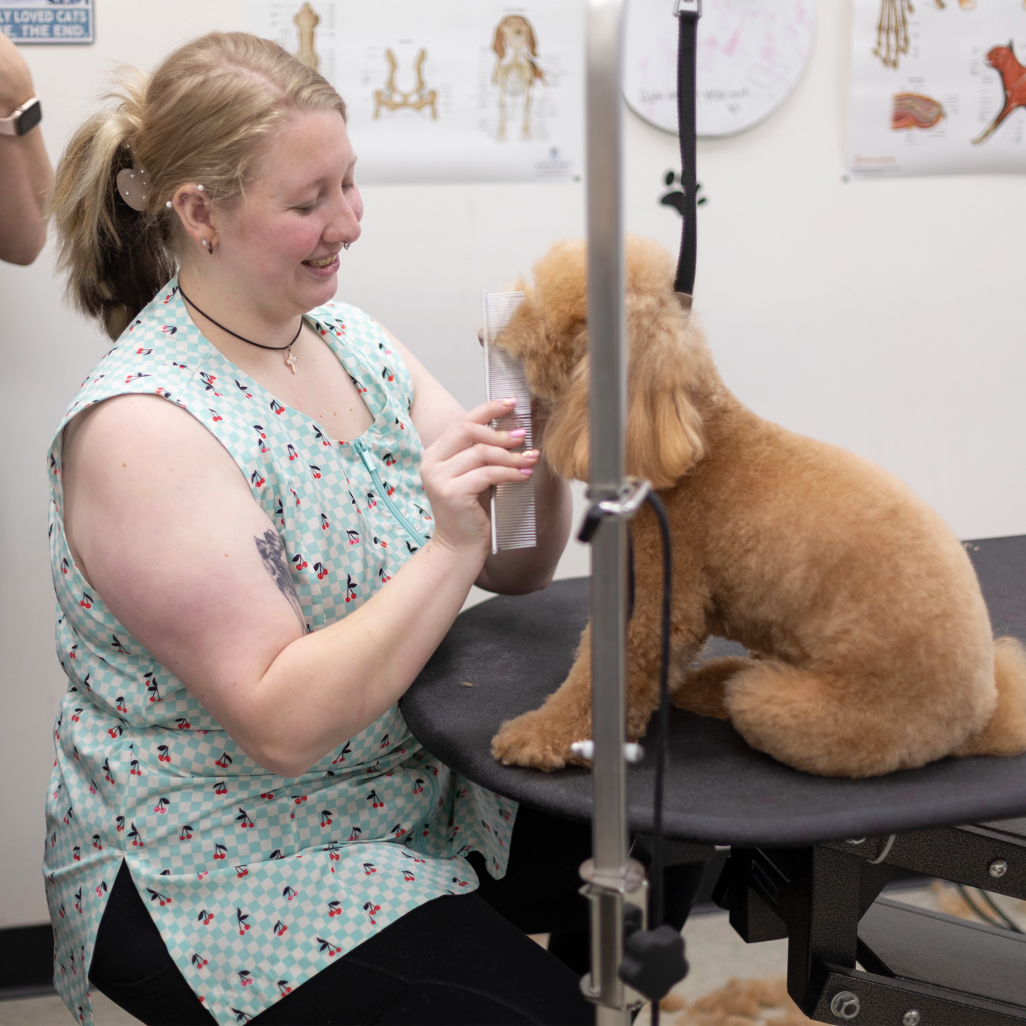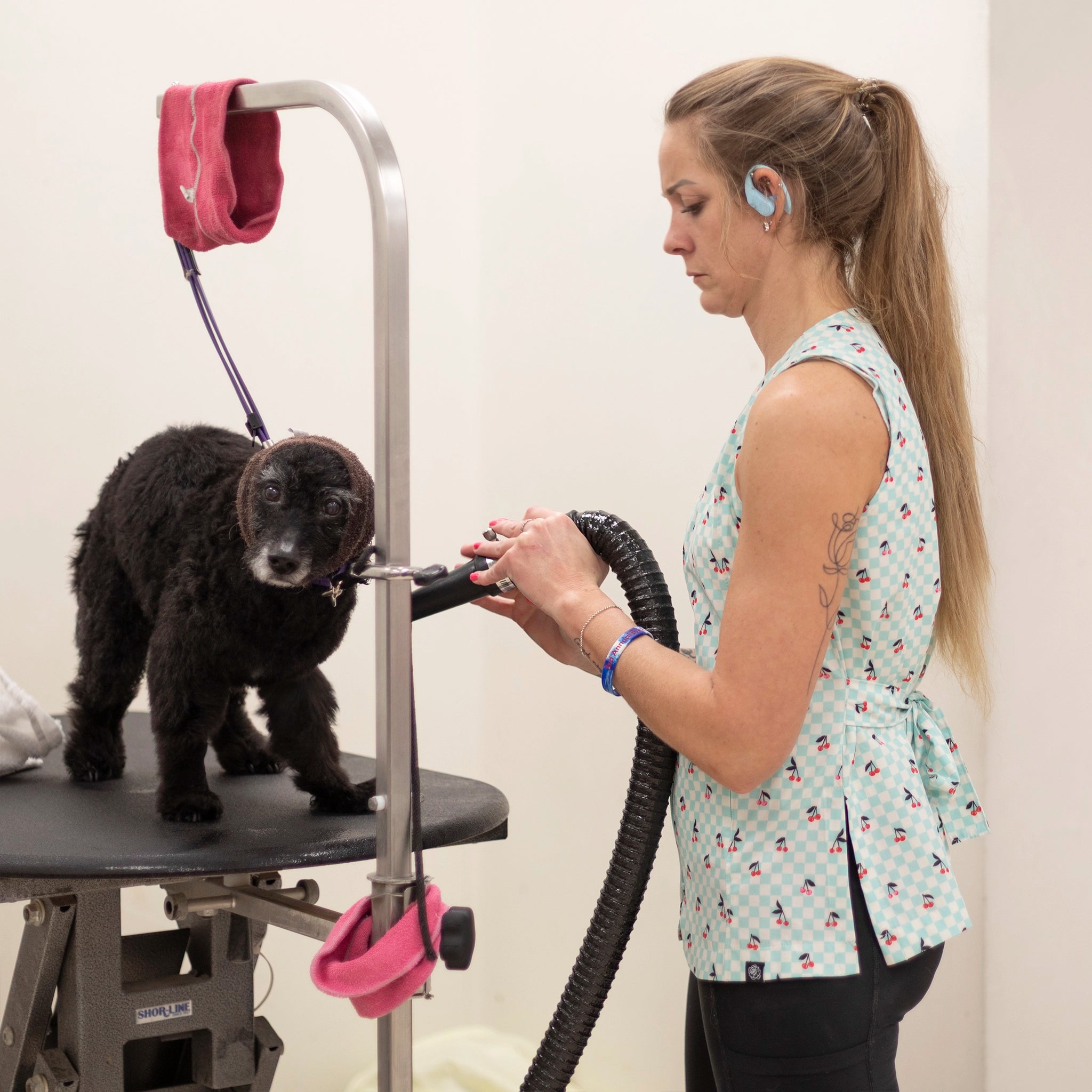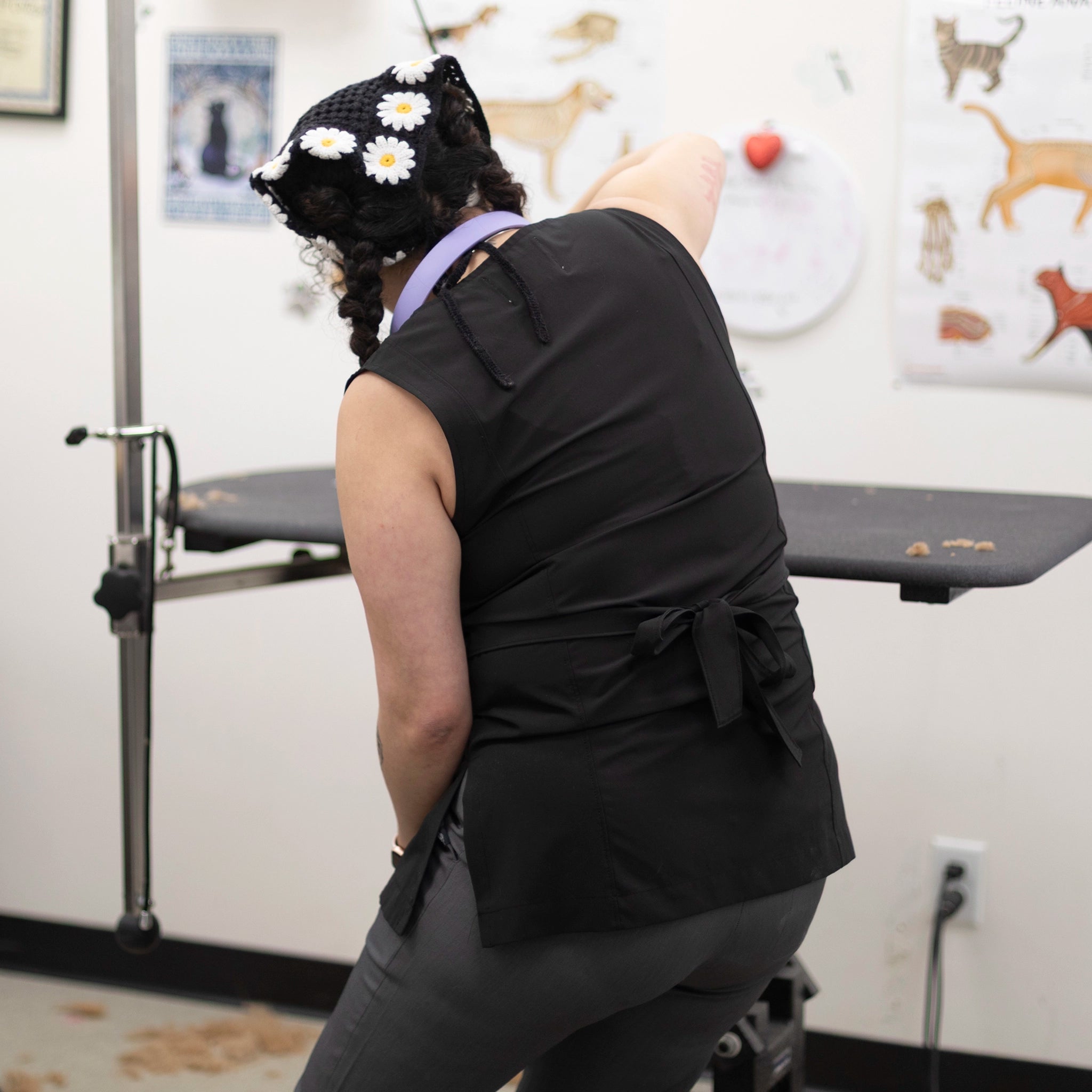 The Ada is made with our brand-new ElastiCORE fabric—a premium poly-spandex blend developed specifically for professional groomers. After extensive wear testing by fellow groomers, feedback has been overwhelmingly positive. ElastiCORE delivers superior hair resistance compared to anything we’ve used before, allowing loose hair to brush or blow off with ease.