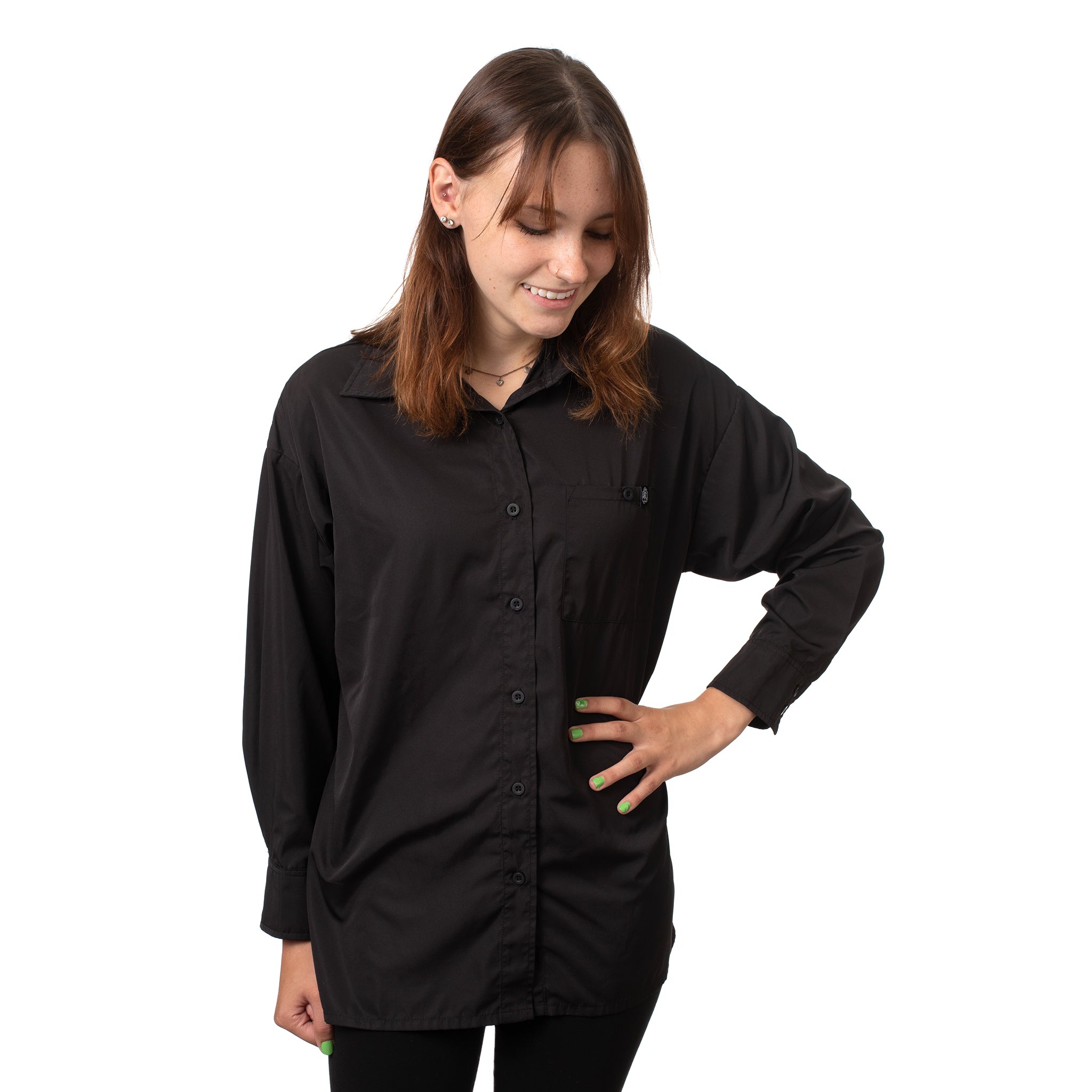 The Dorian smock features a convenient chest pocket secured with a button, perfect for keeping small essentials like combs or notes within easy reach. Stay organized while maintaining a sleek, professional look.