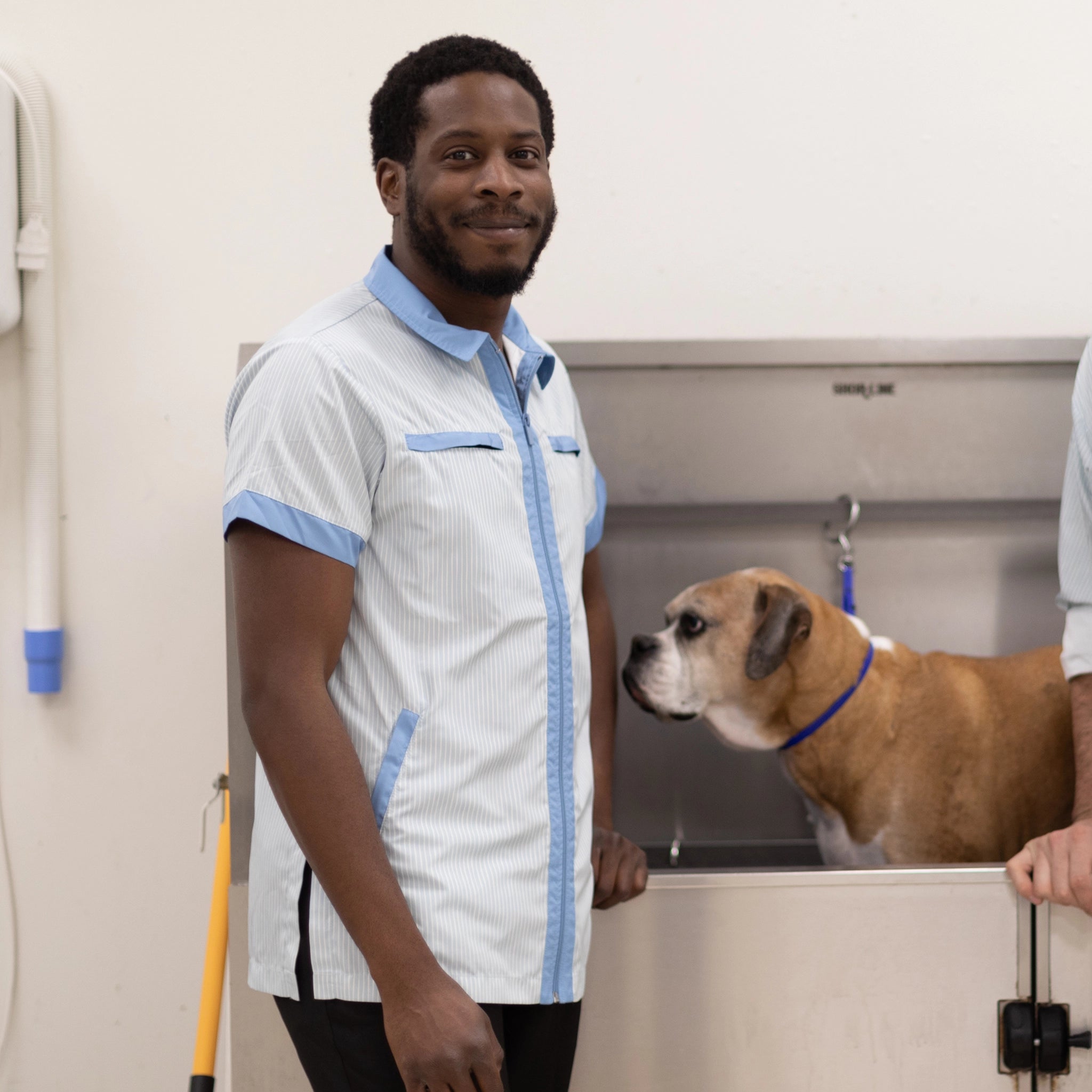 Our proprietary fabric repels fur and water. Quick drying and low maintenance, Clean Finish keeps you clean, confident and focused on the groom—not your smock.