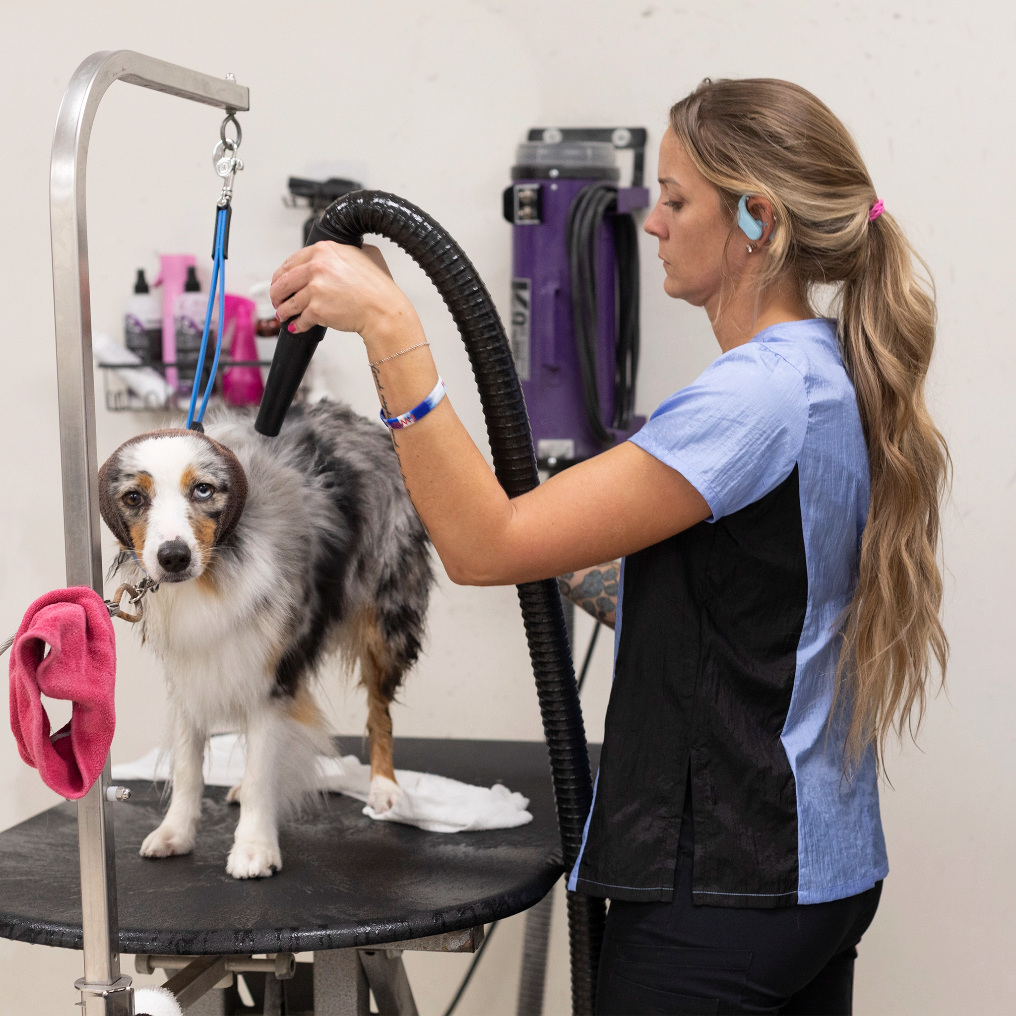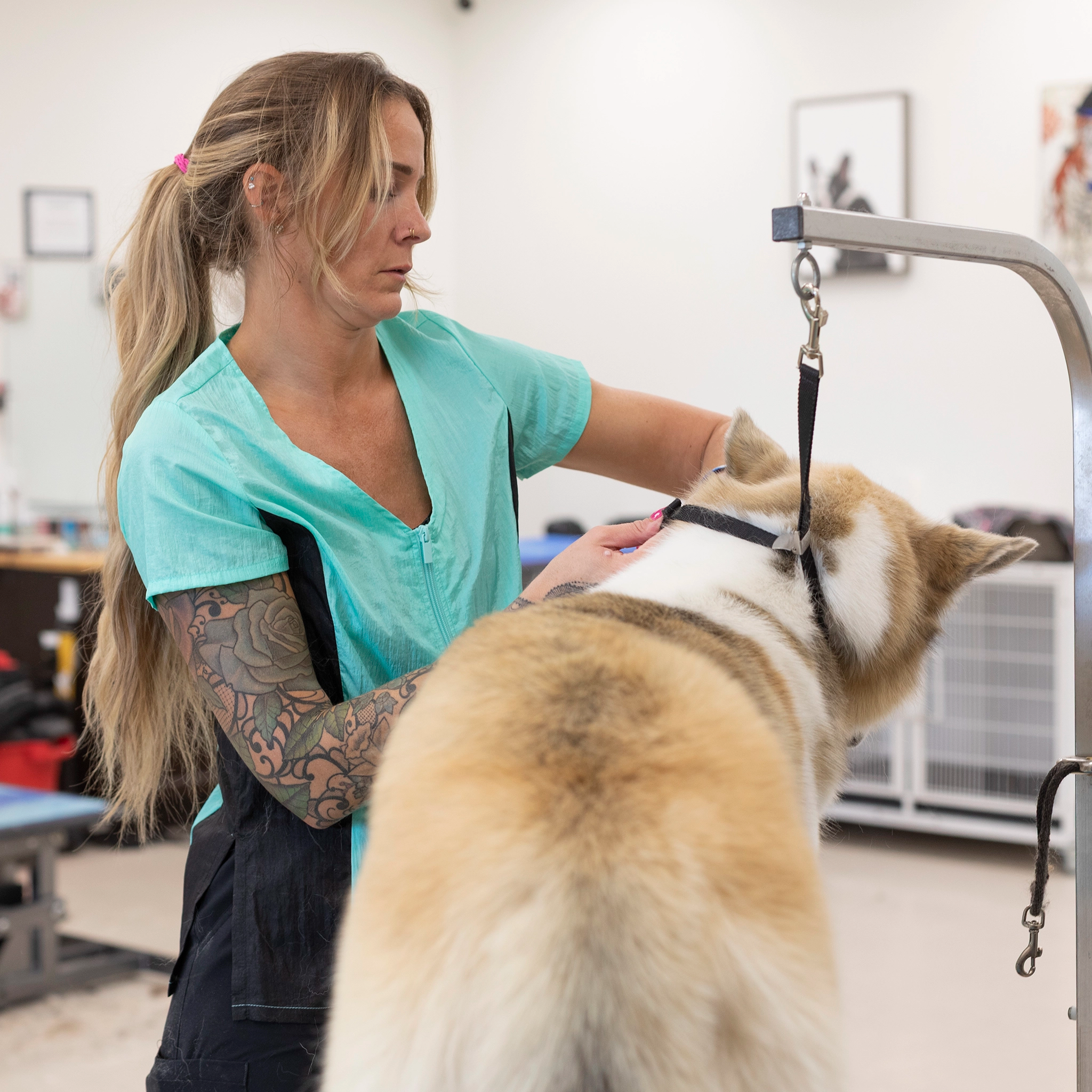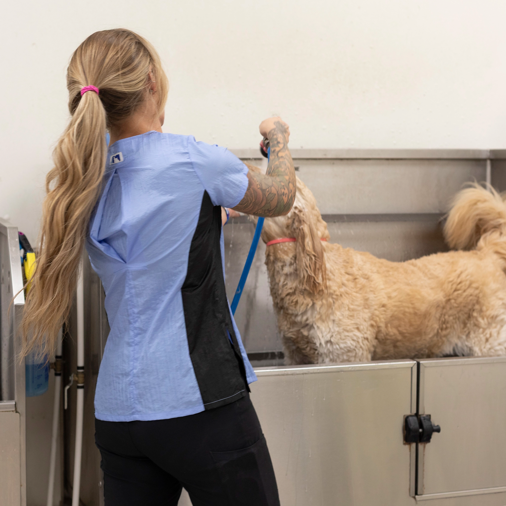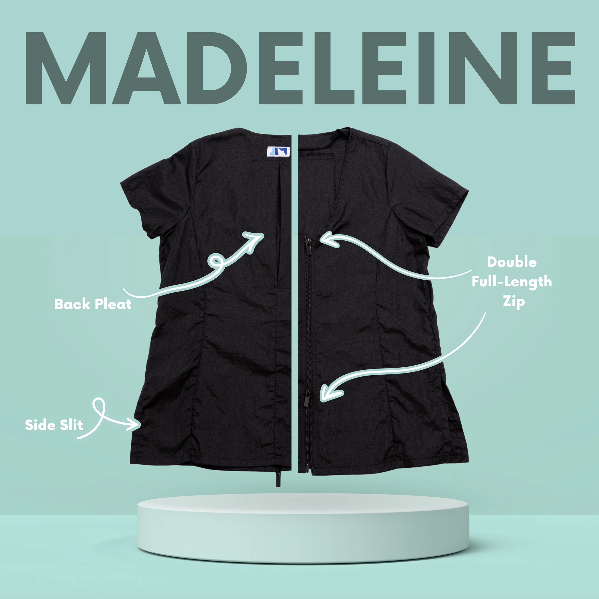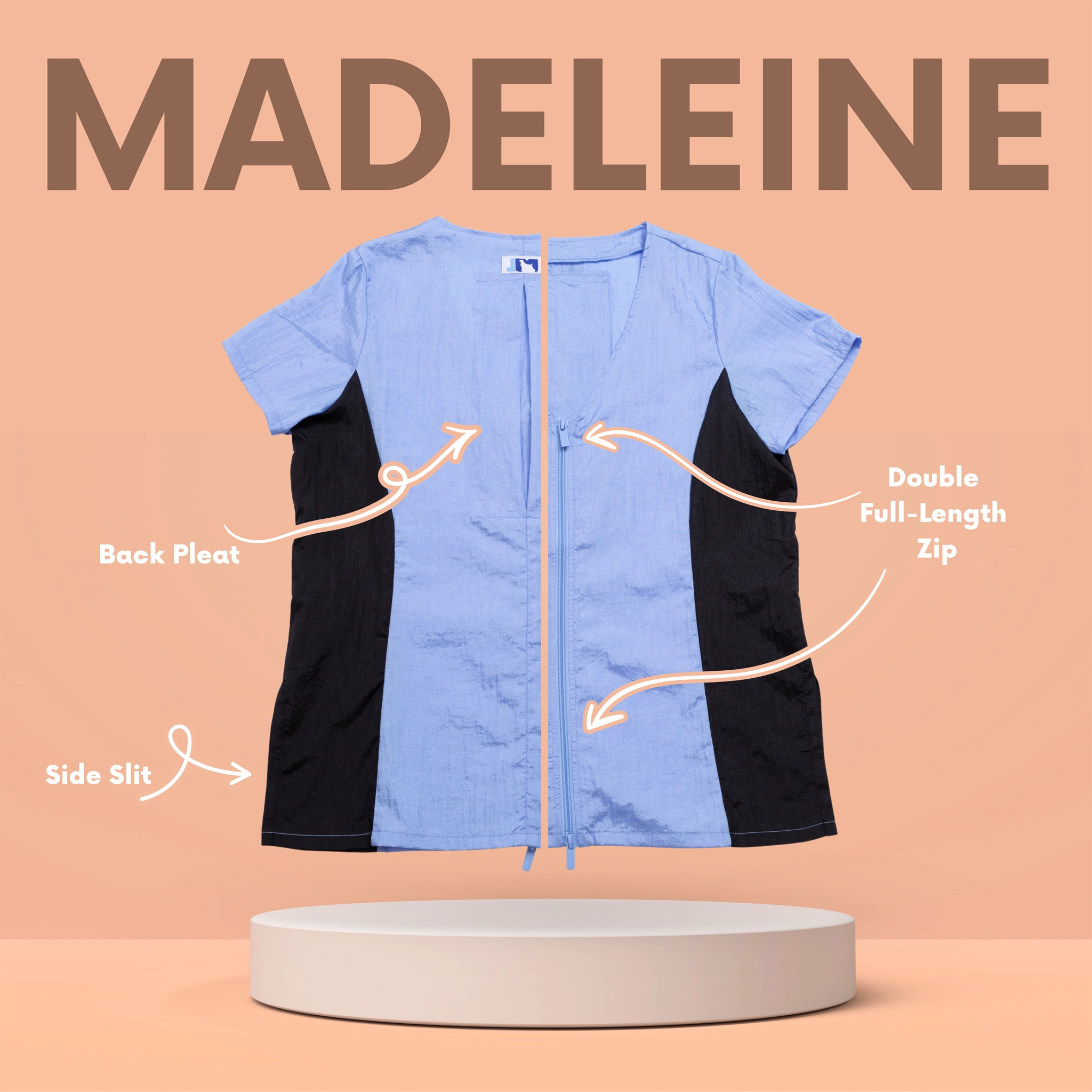 This stylish dog groomer’s top has black panels on the sides that gives a nice slimming look. This top has a full-length double zipper and side slits. This short sleeve pet groomer’s apparel top is slightly fitted with a pleated back for unrestricted movement and comfort. This smock does not have pockets.