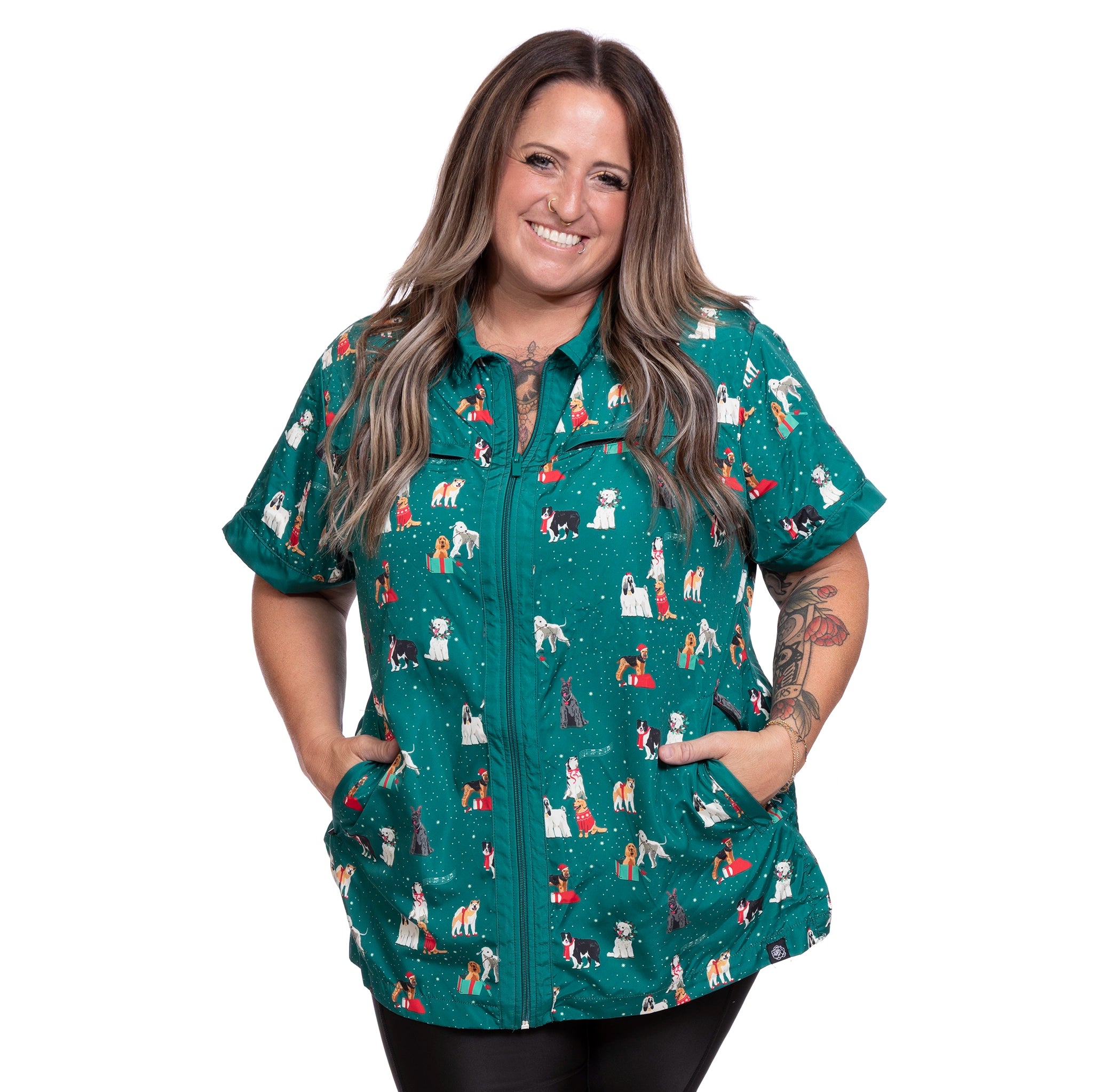 Deck your grooming station in holiday cheer with our Festive Pups smock — a snowy green print packed with jolly dogs and Christmas cuteness.