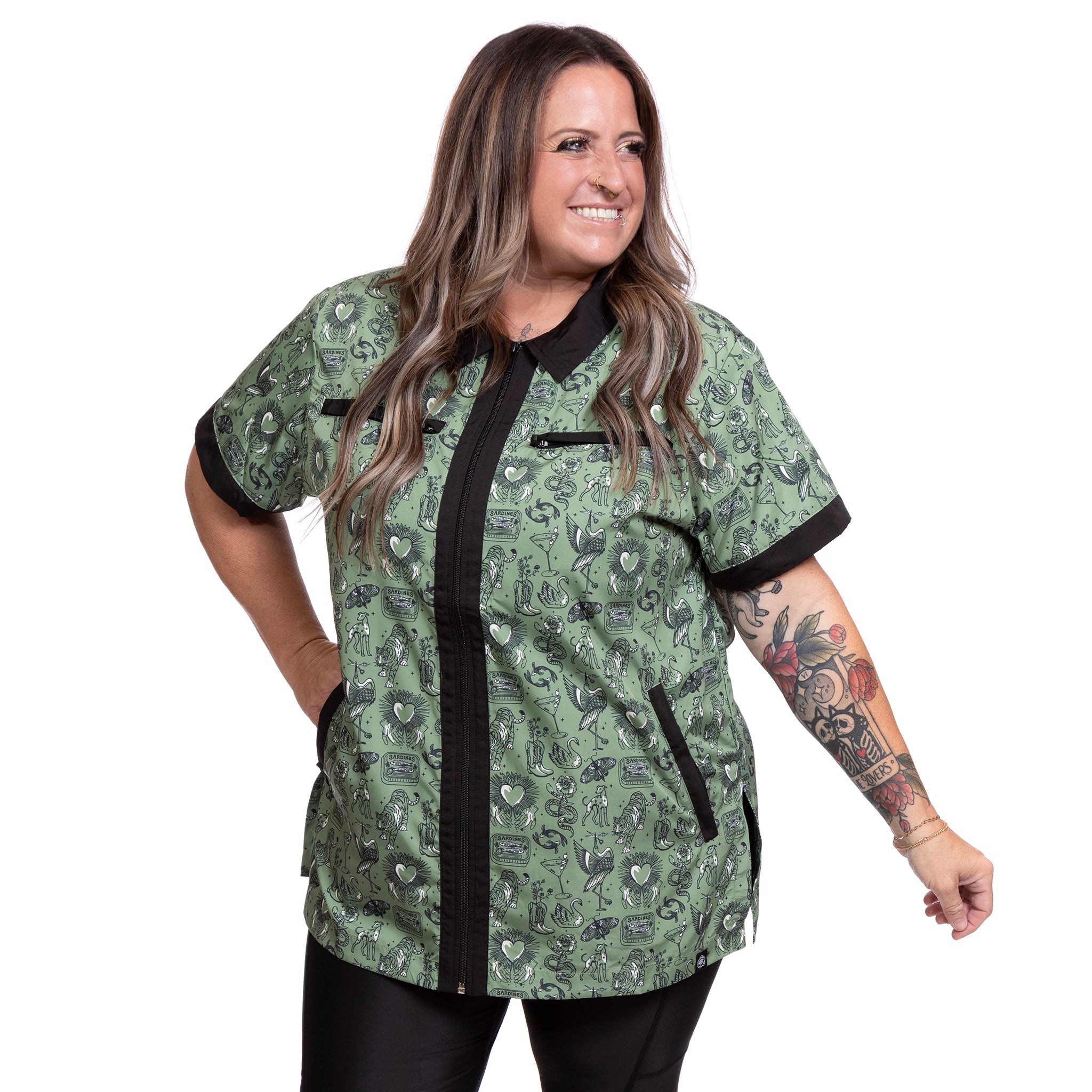 Turn heads with our edgy new Inked smock — a bold, tattoo-inspired print featuring everything from tigers and swans to snakes, cocktails, and cowboy boots, all popping against a killer green backdrop.