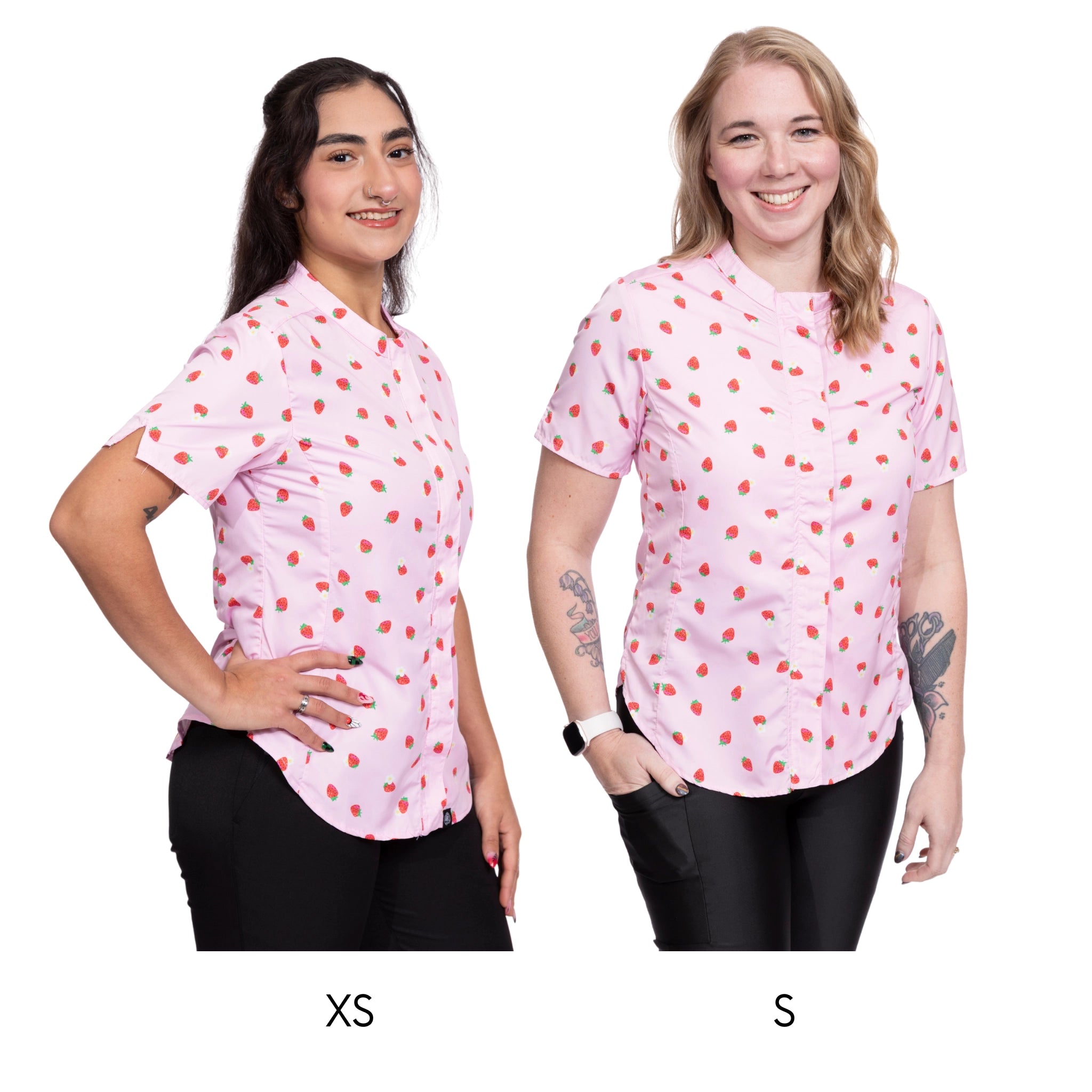 The Harper pet grooming smock: Sleek design featuring a hidden zippered front, polished placket with button closures, short sleeves with notch detail, and a flattering women’s fit.