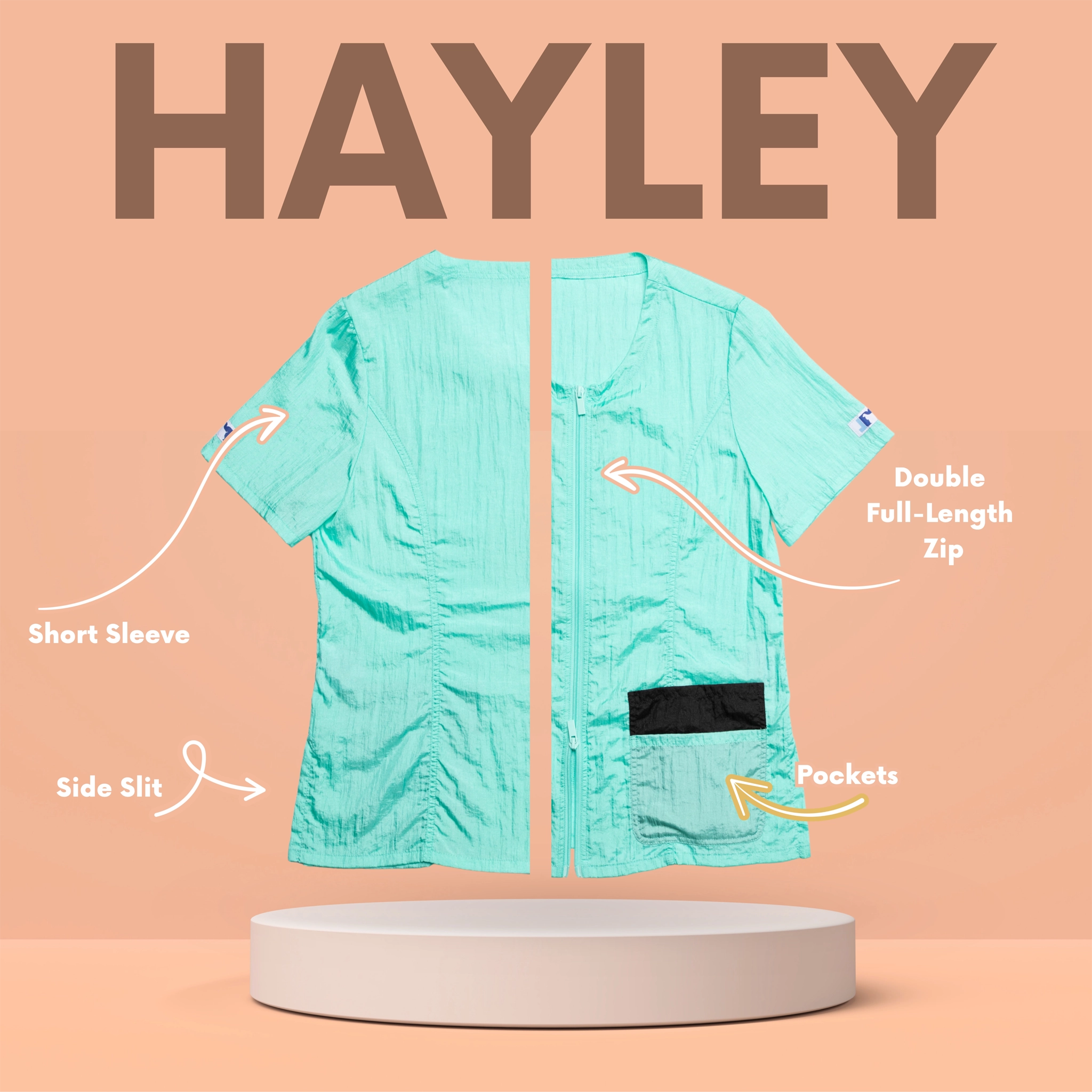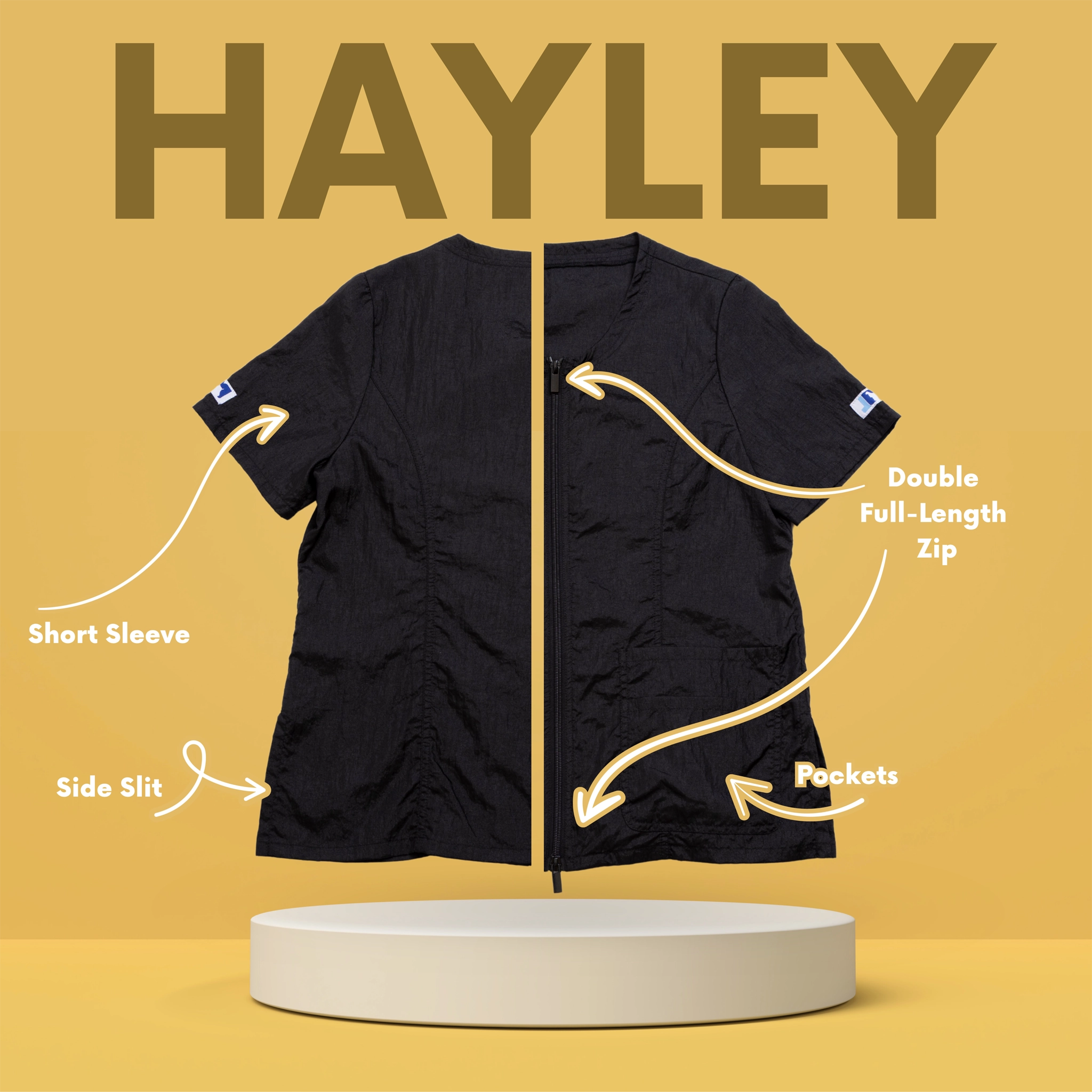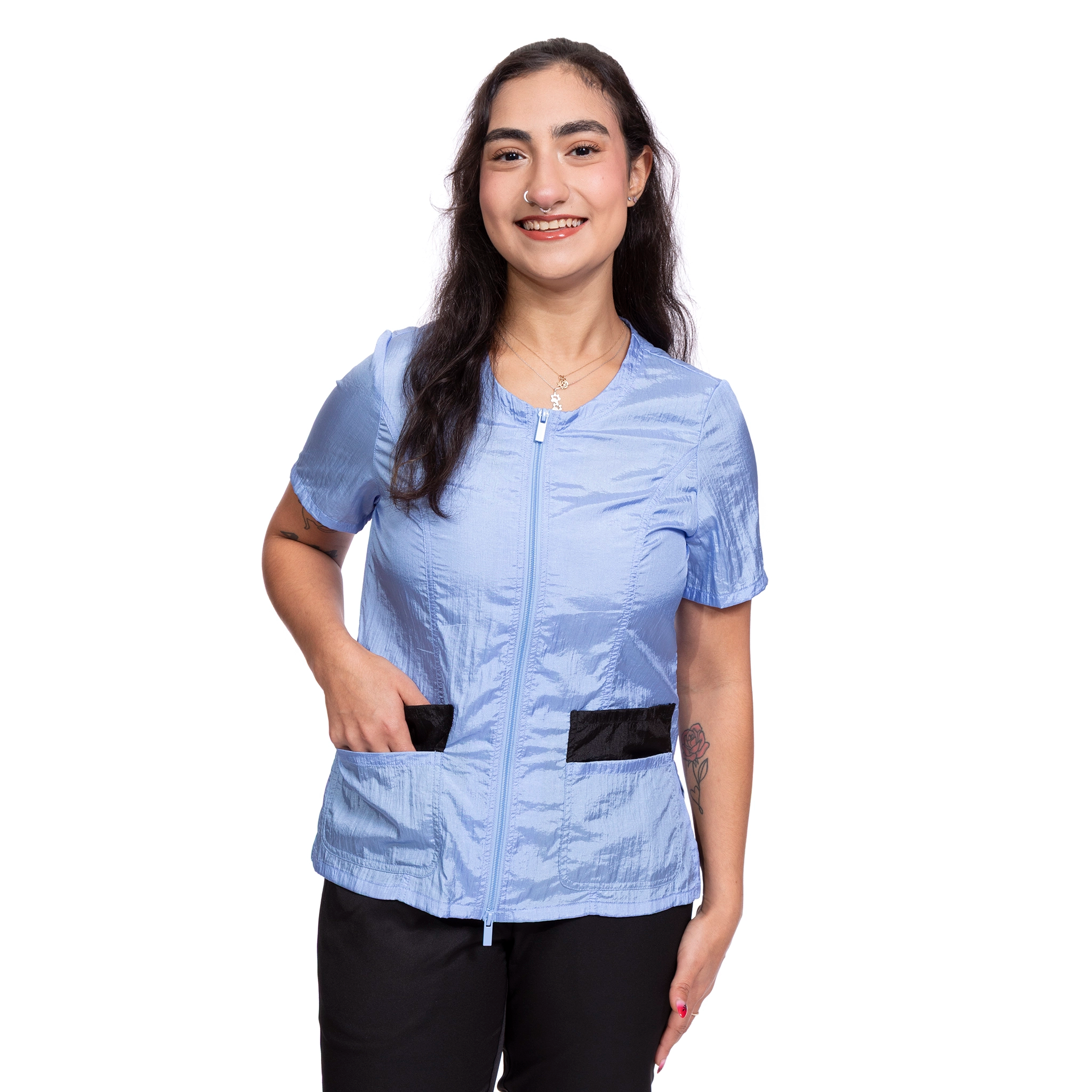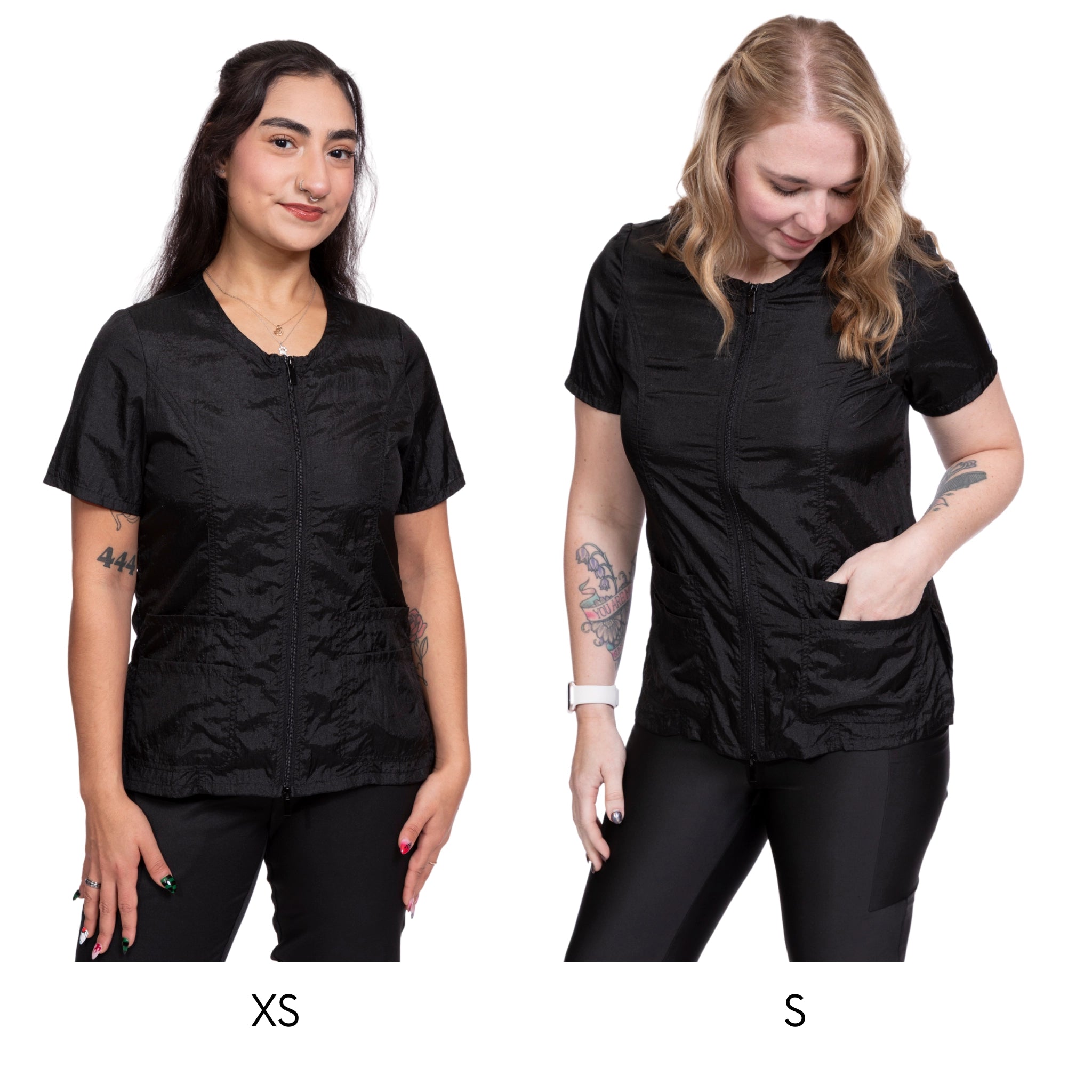 Outfit your entire salon with Jodi Murphy's water- and hair-resistant pet grooming tops. The Hayley style has double front pockets, a double zipper, comfortable short sleeves and side slits which comforts bending and sitting. Sizes range from XS through 3X. Please check the size chart as Jodi’s various styles fit differently to accommodate various body shapes.