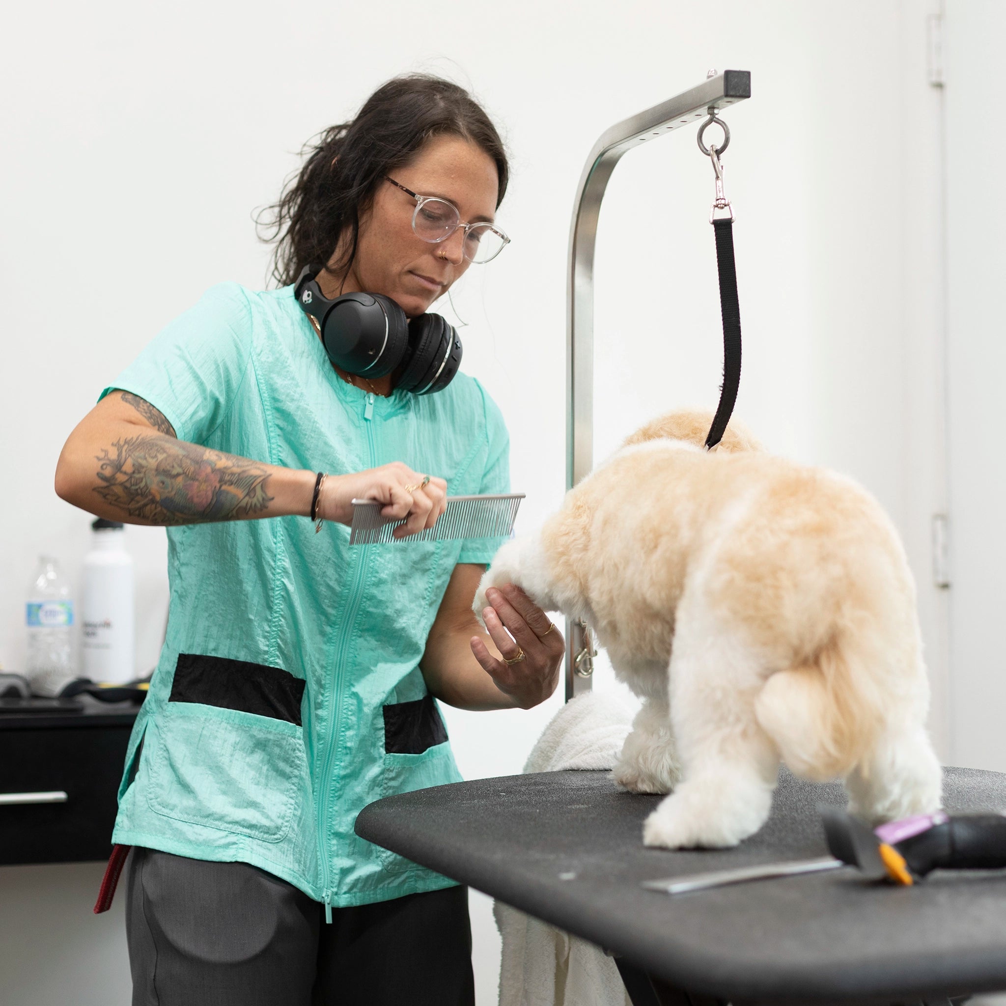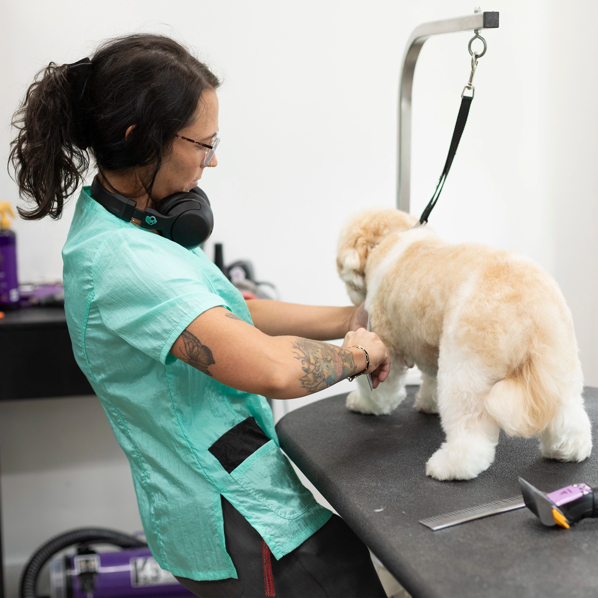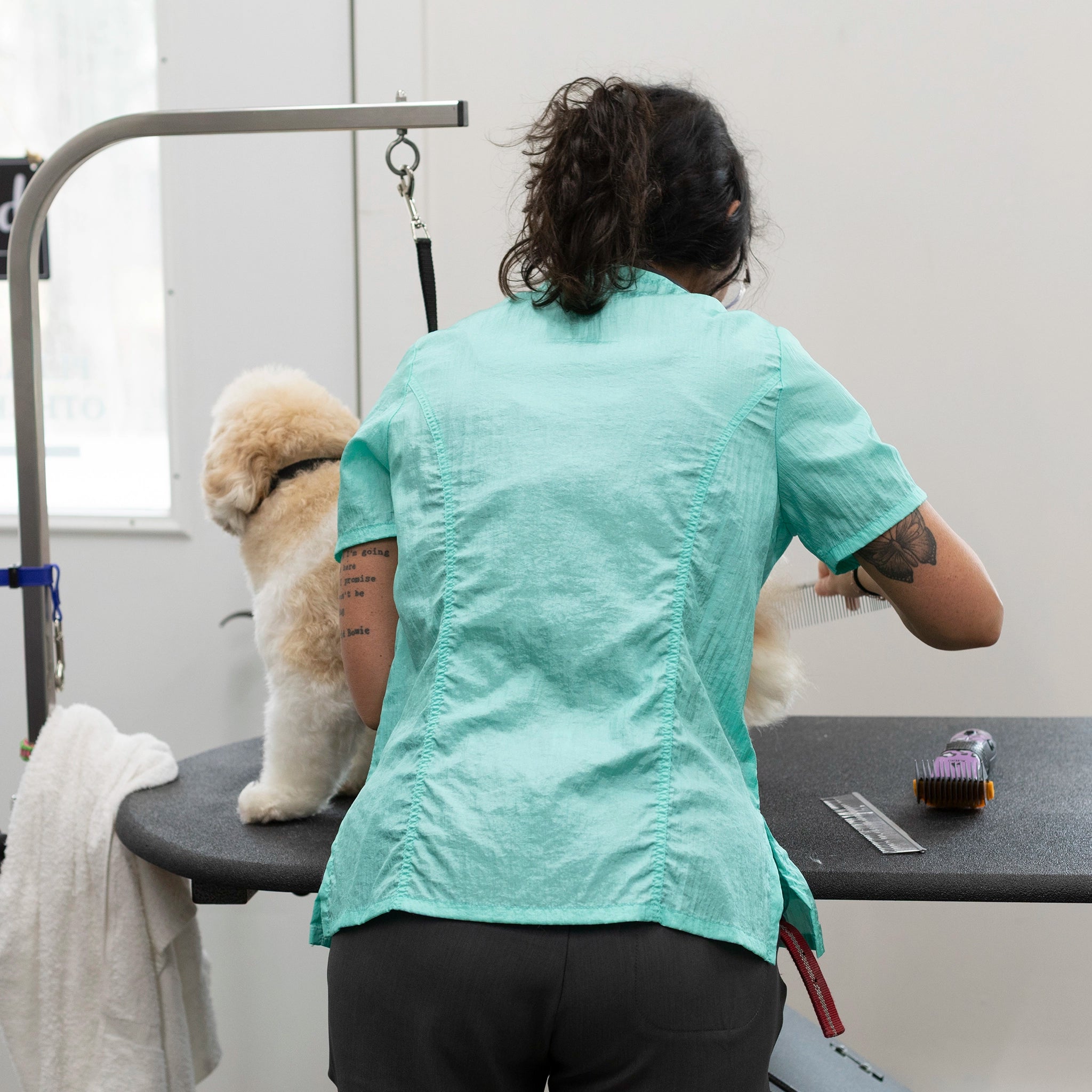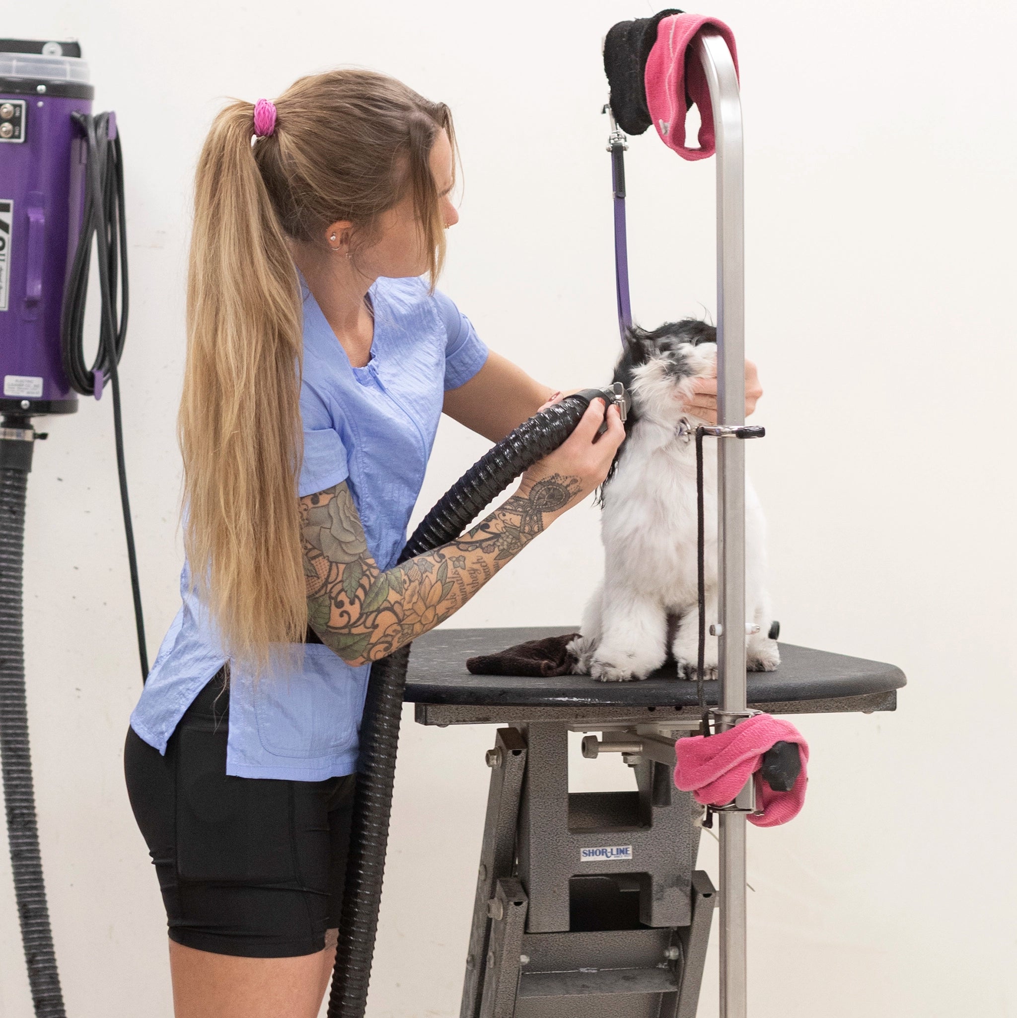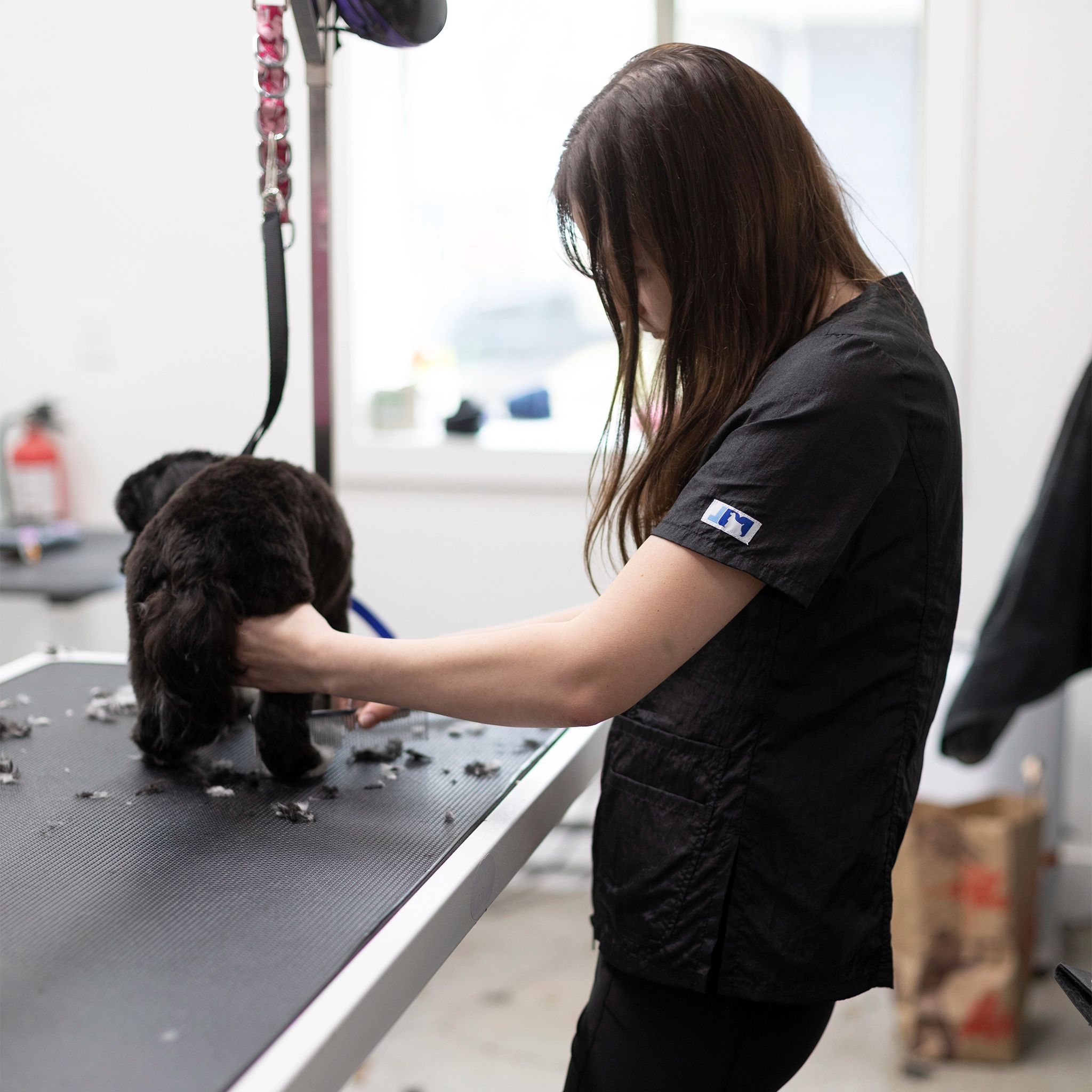Outfit your entire salon with Jodi Murphy's water- and hair-resistant pet grooming tops. The Hayley style has double front pockets, a double zipper, comfortable short sleeves and side slits which comforts bending and sitting. Sizes range from XS through 3X. Please check the size chart as Jodi’s various styles fit differently to accommodate various body shapes.